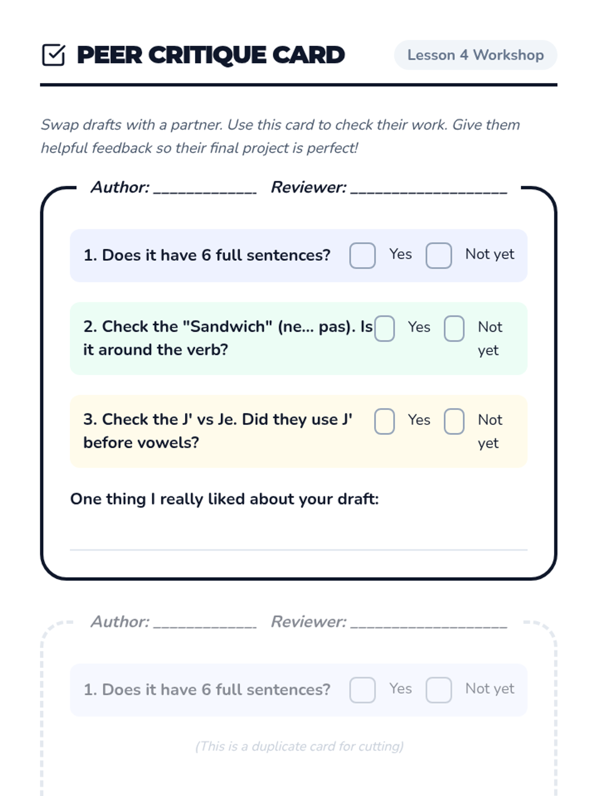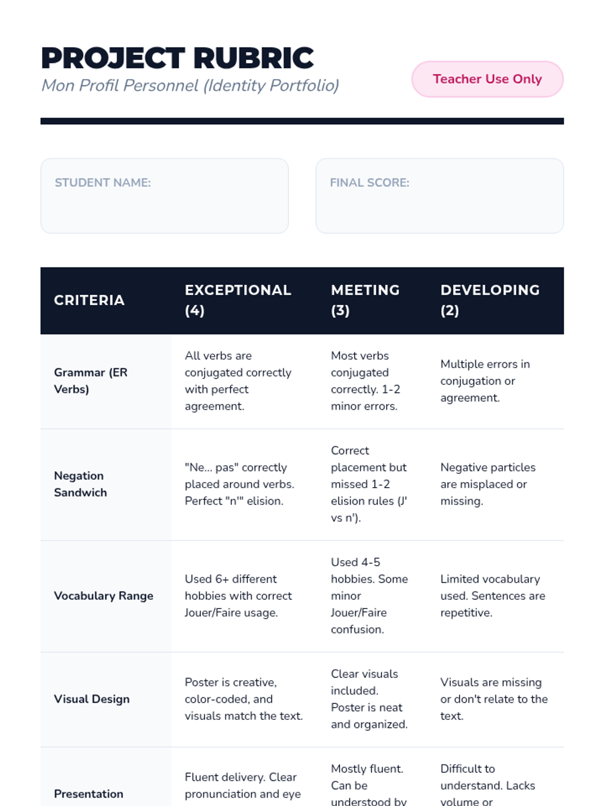 Students move beyond simple introductions to expressing personal identity, preferences, and traits using the verbs 'être' and 'aimer'. The project-based learning arc culminates in the creation of a 'Star Student' poster where students present who they are in French.