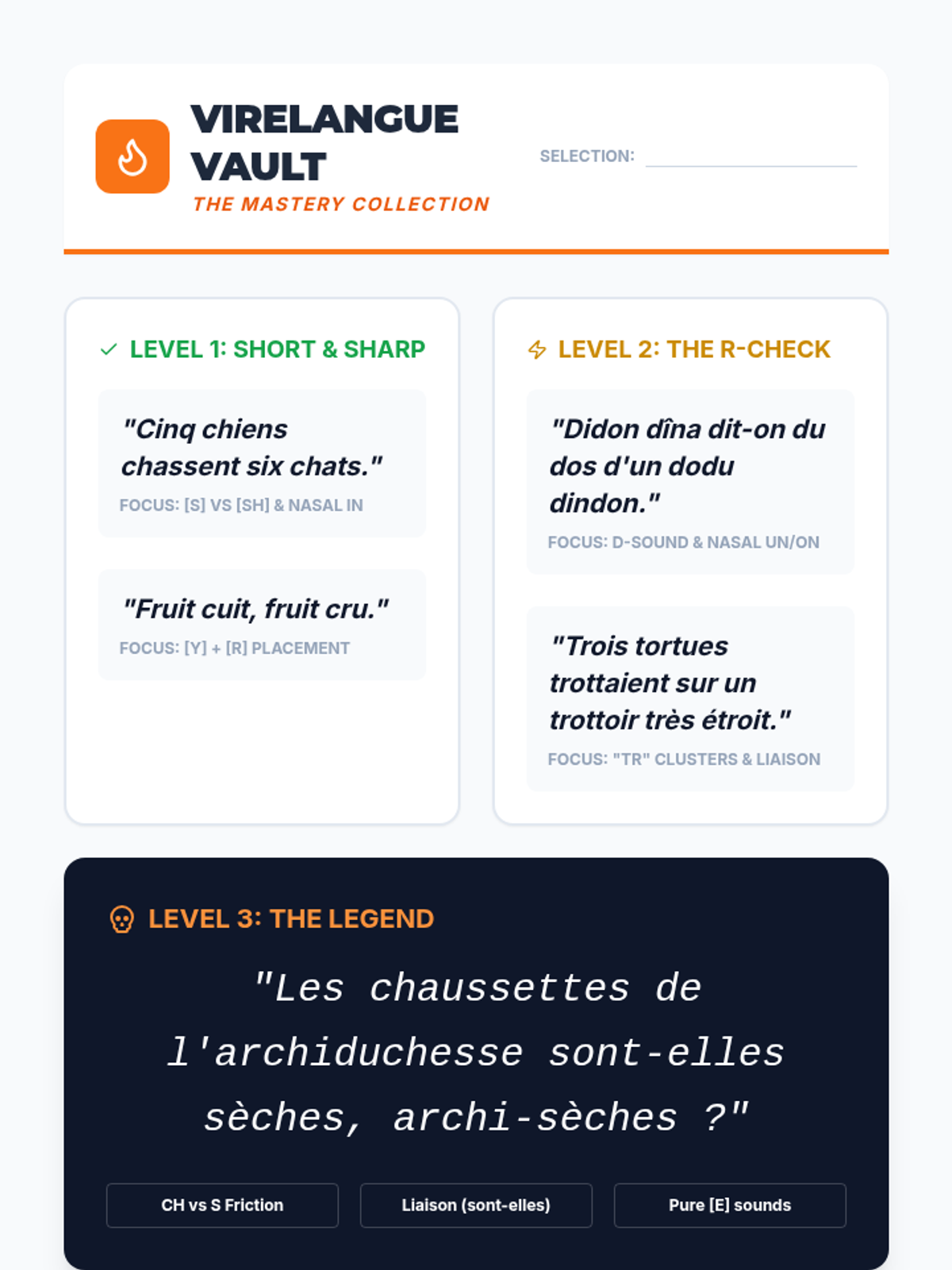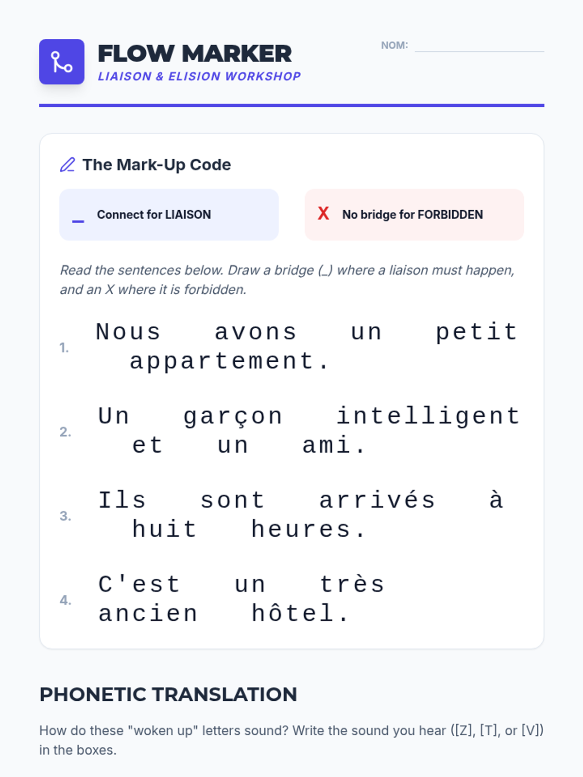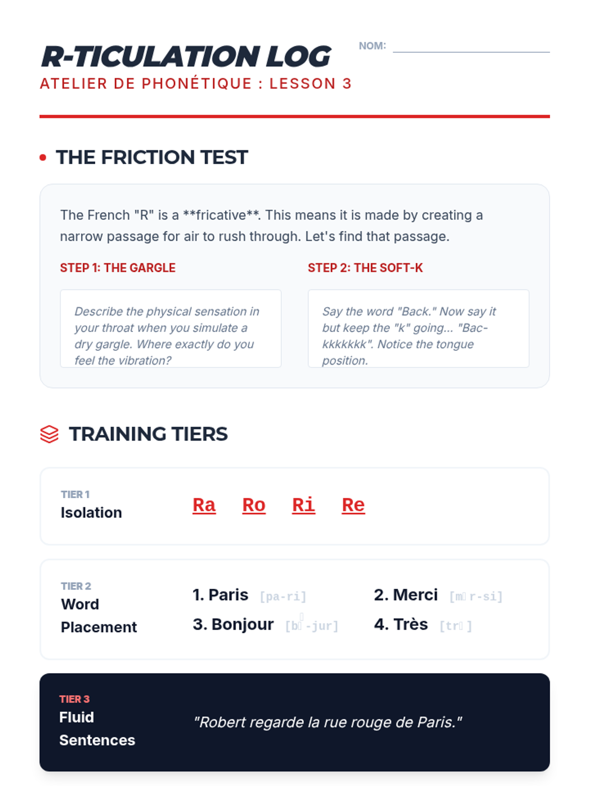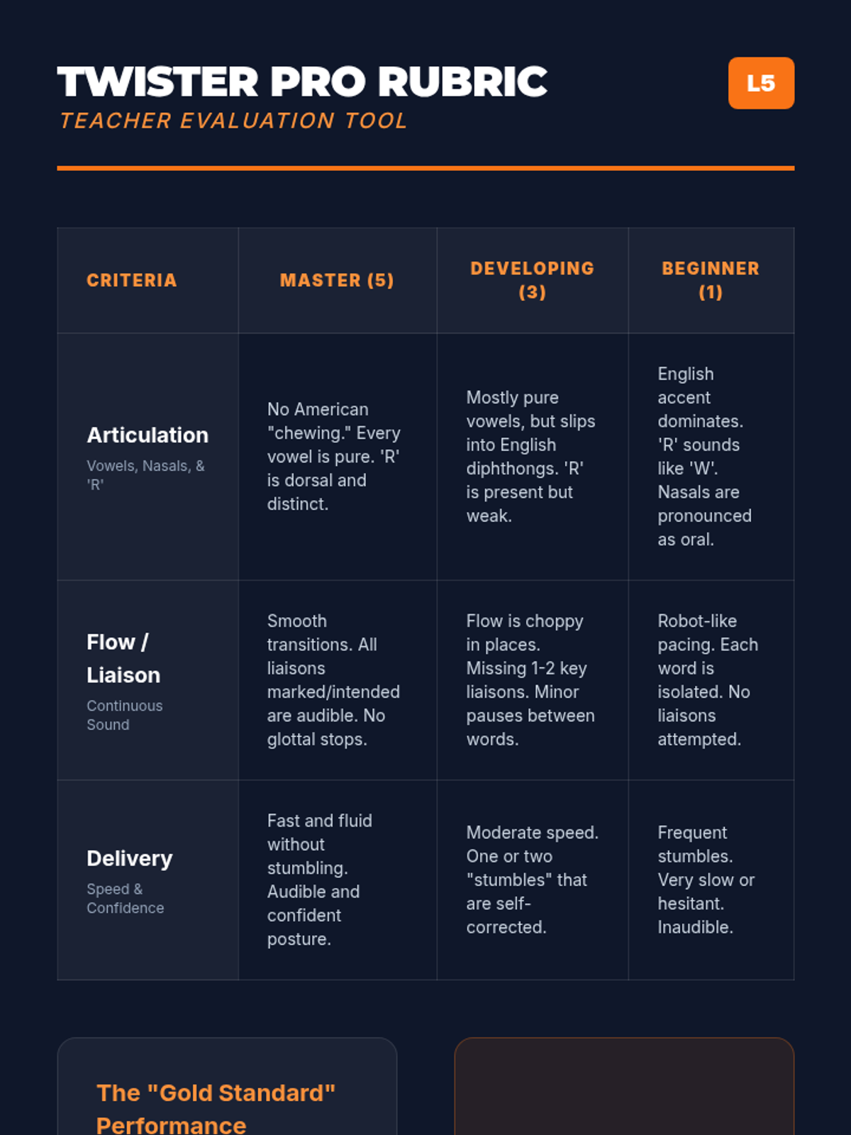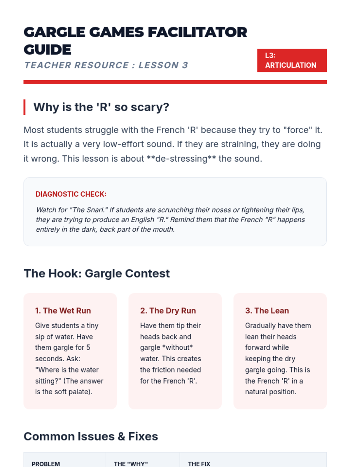 A specialized workshop sequence for 10th-grade beginner French students focusing on phonetics, mouth positioning, and the rhythms of spoken French to build confidence and intelligibility.