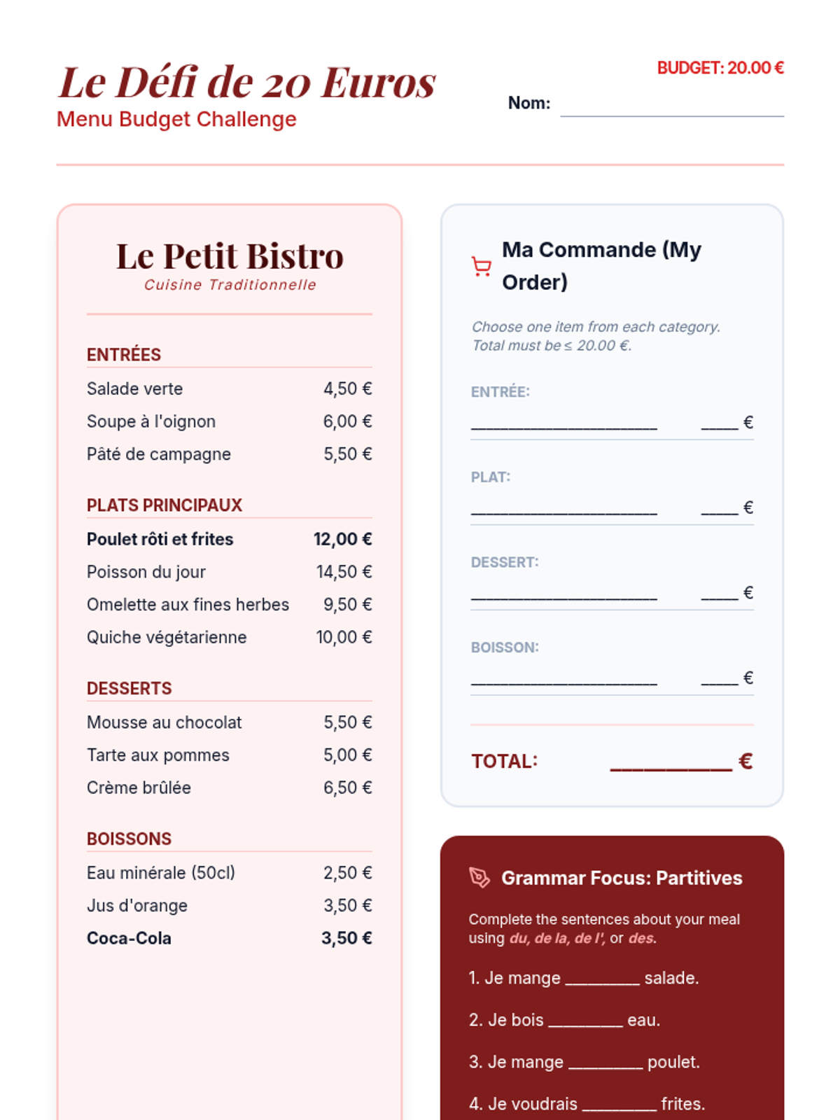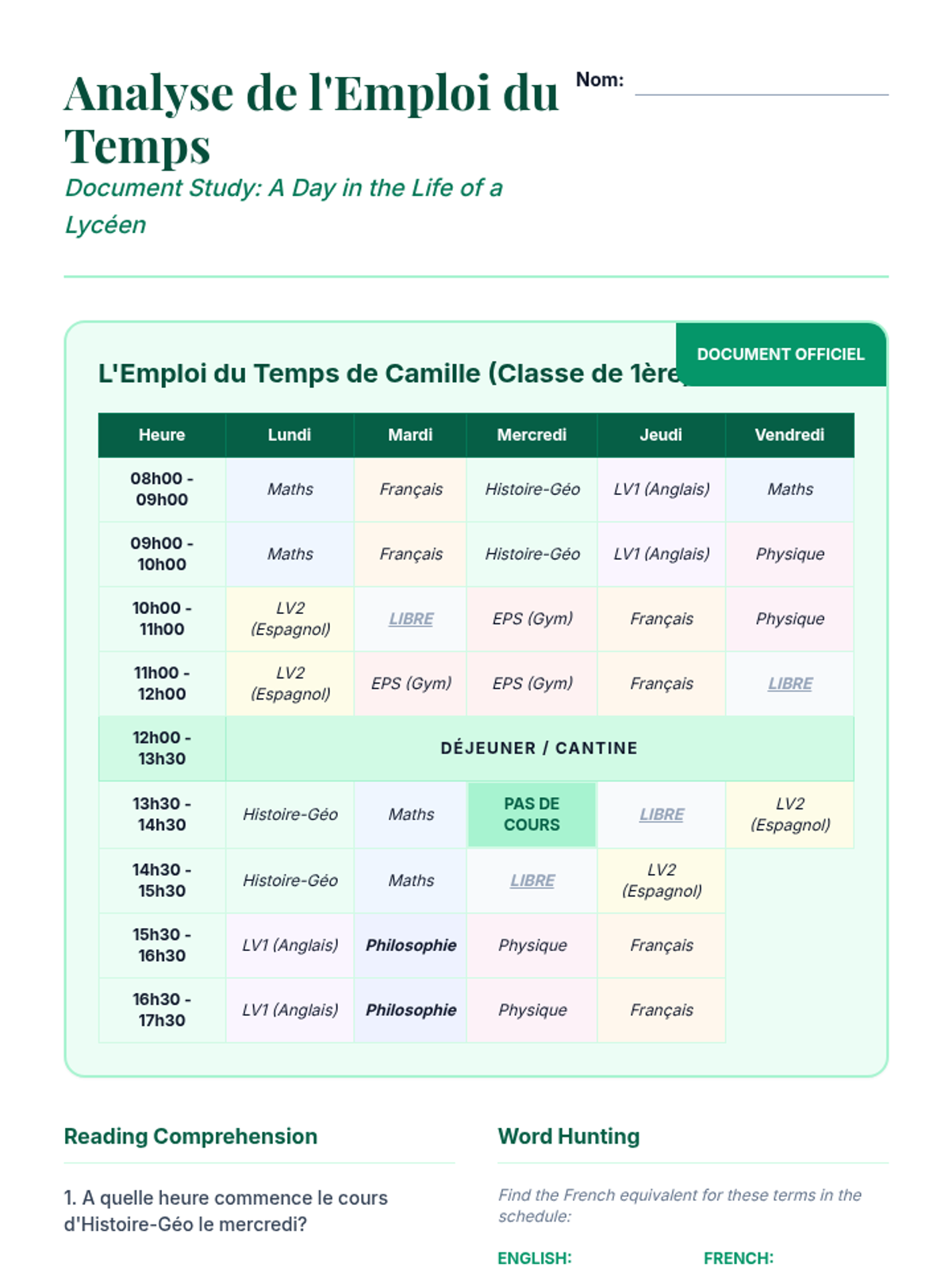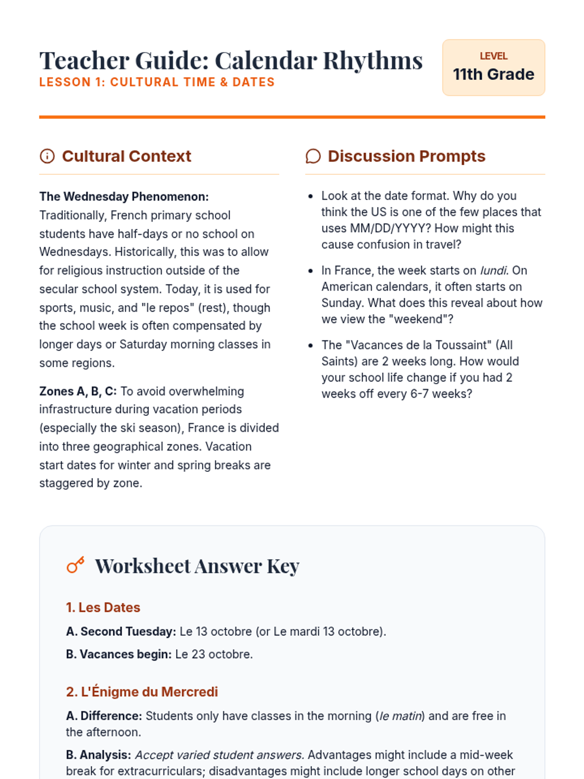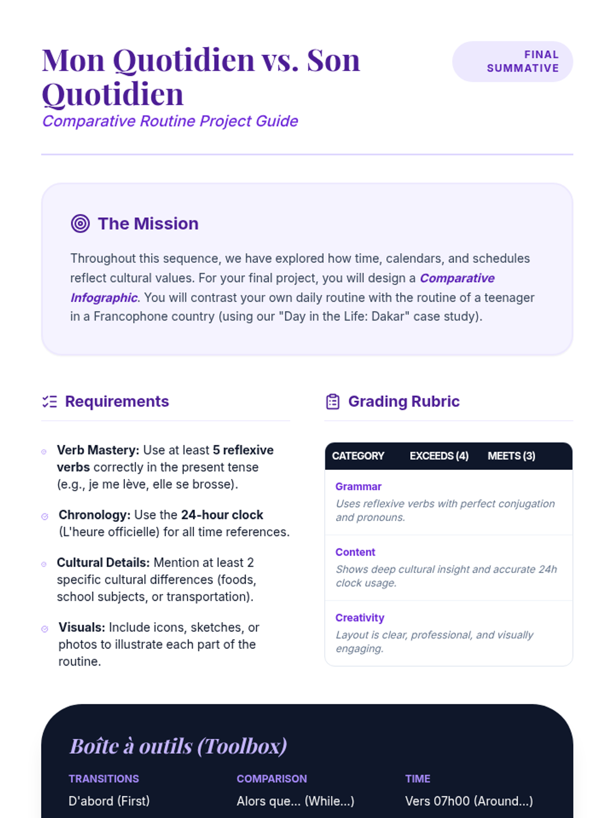 This sequence explores Francophone cultural rhythms through authentic texts like calendars, school schedules, and menus. Students develop reading strategies for informational texts while comparing cultural values surrounding time and routine.