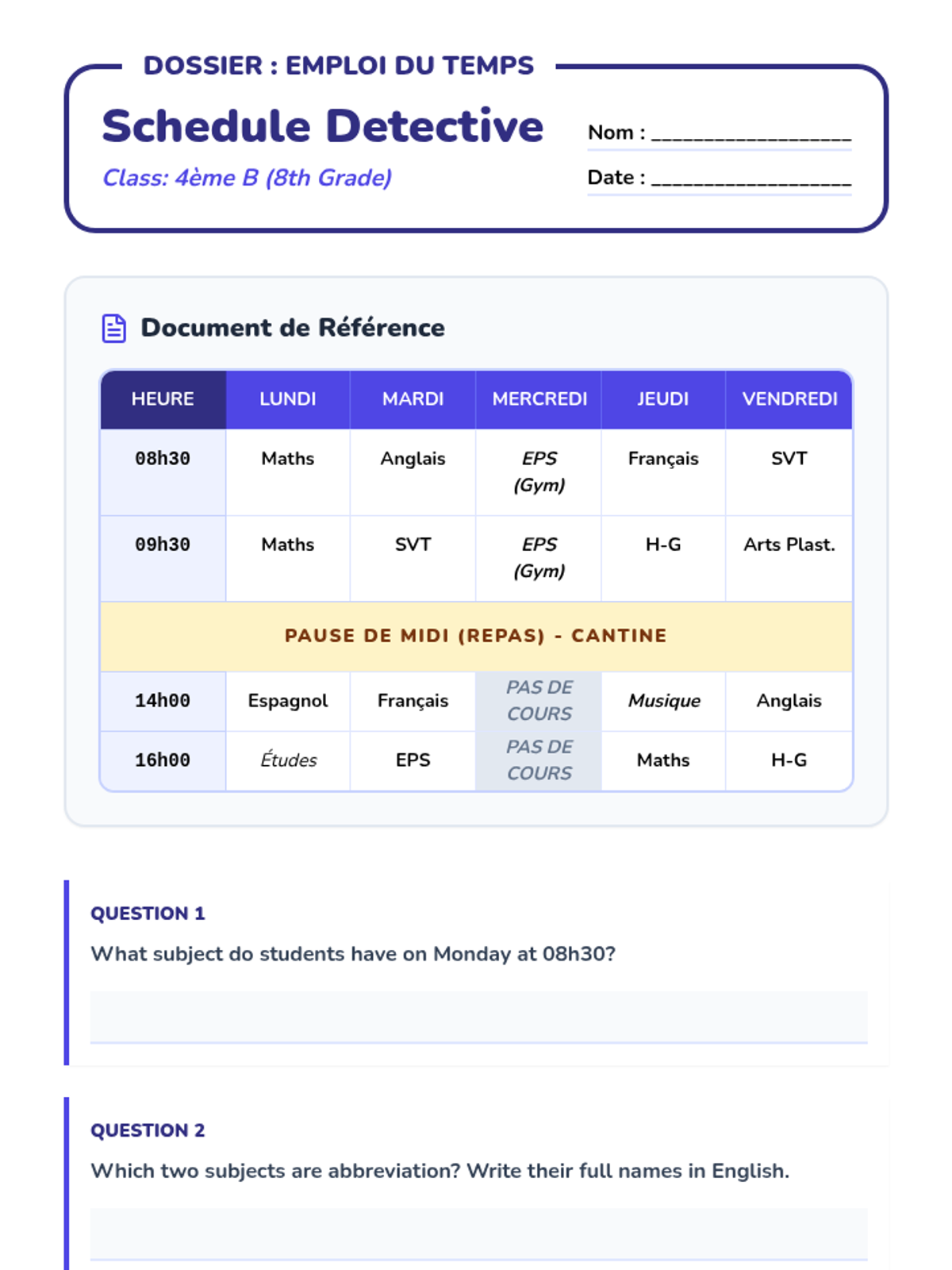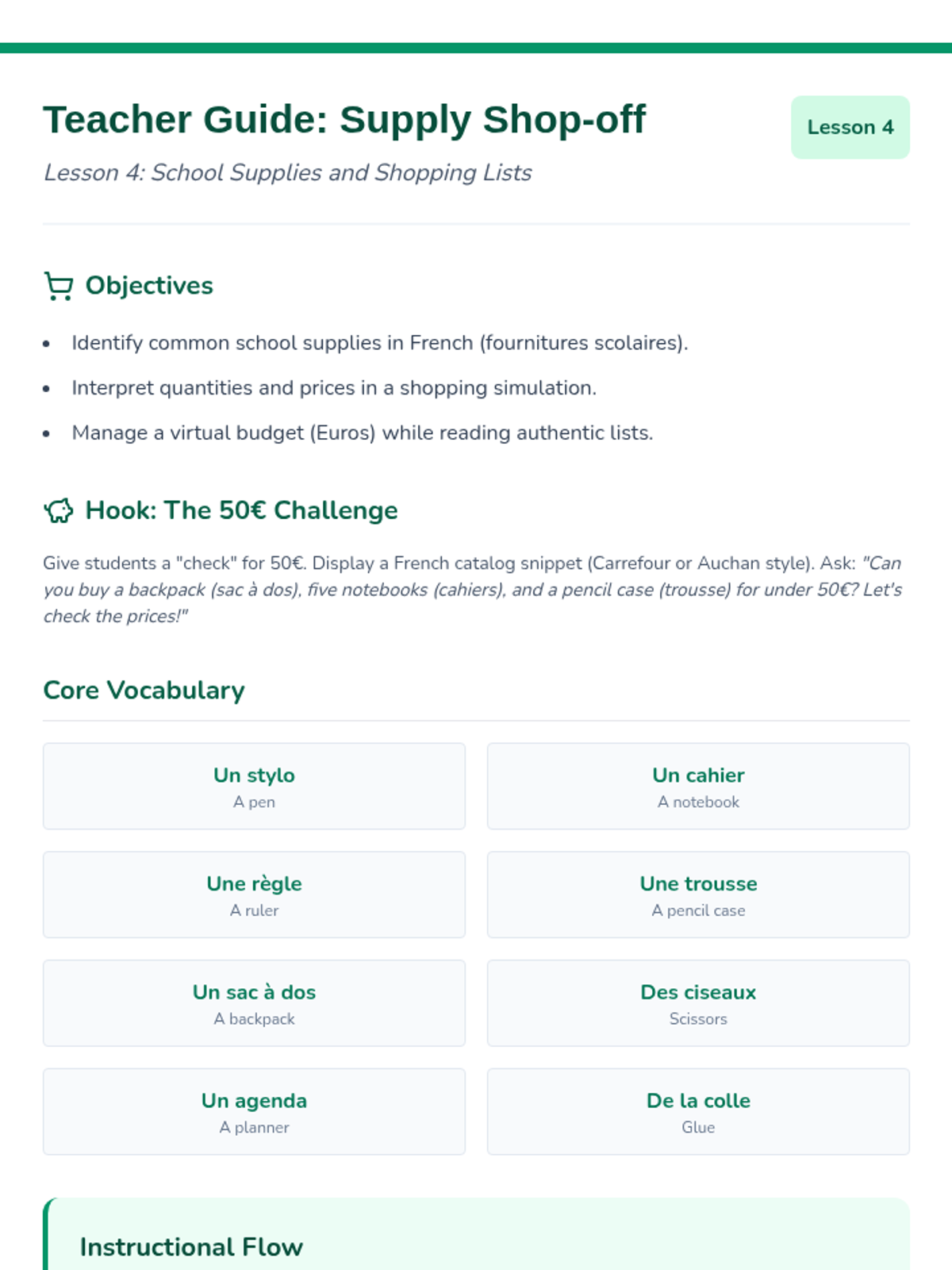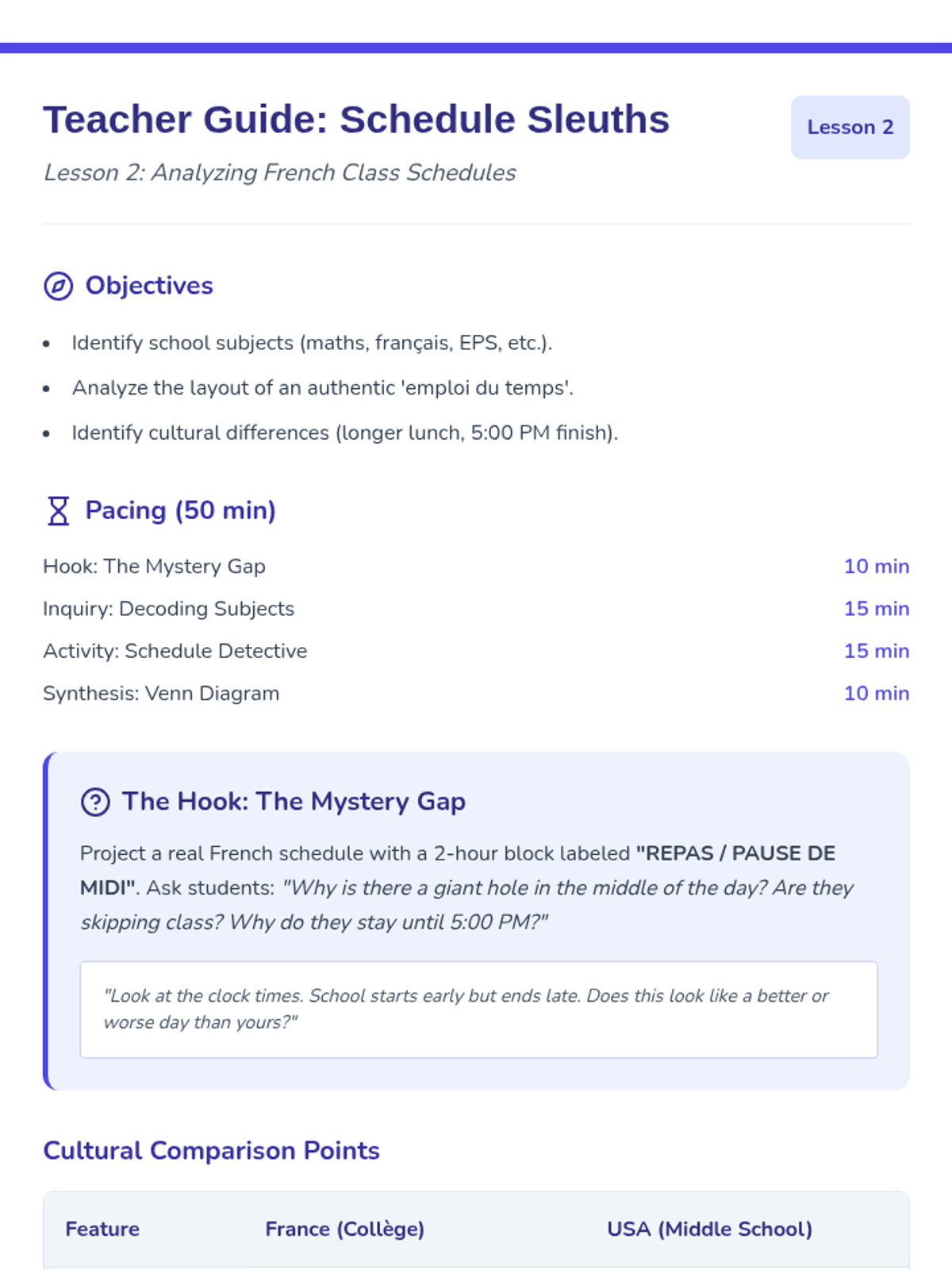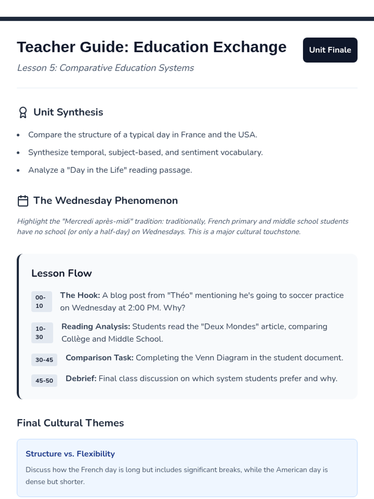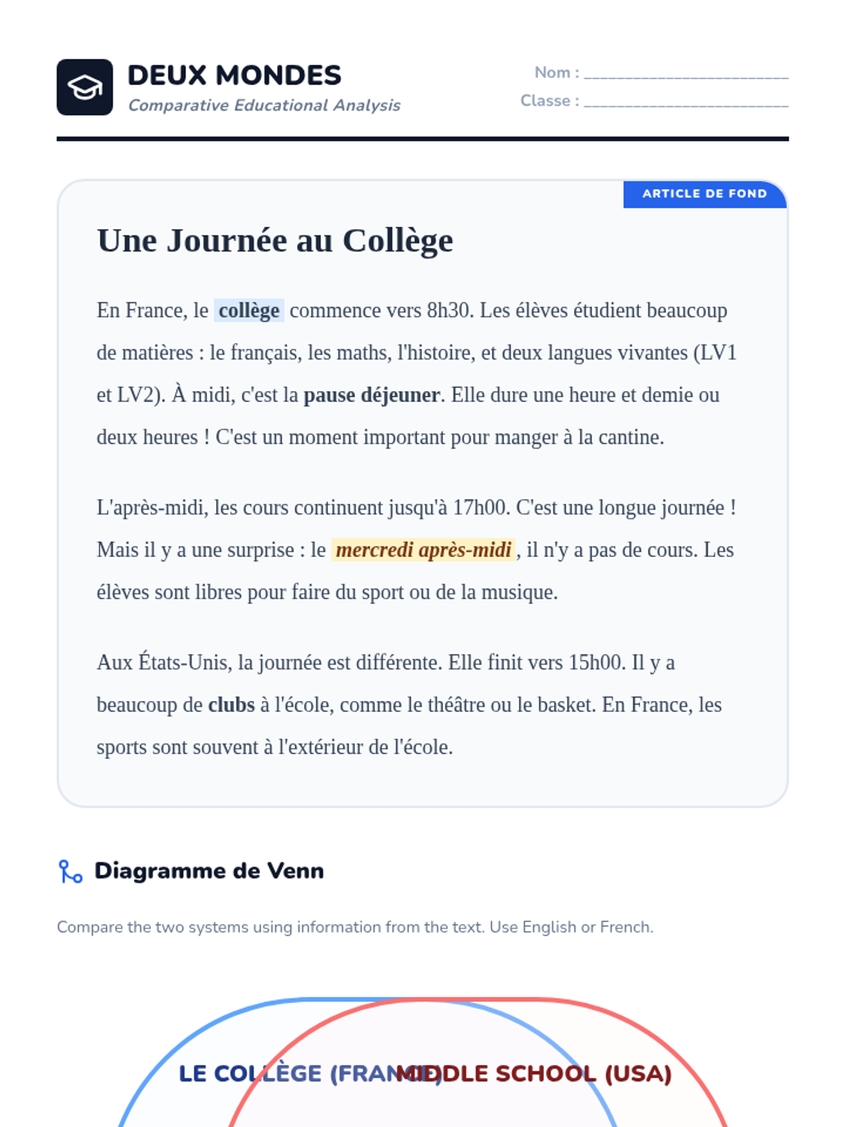 A comprehensive unit for 8th-grade French students focused on reading and interpreting authentic materials related to school life. Students compare French and American education systems through calendars, schedules, supplies, and personal opinions.