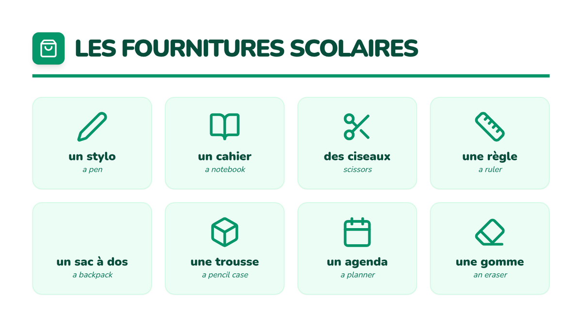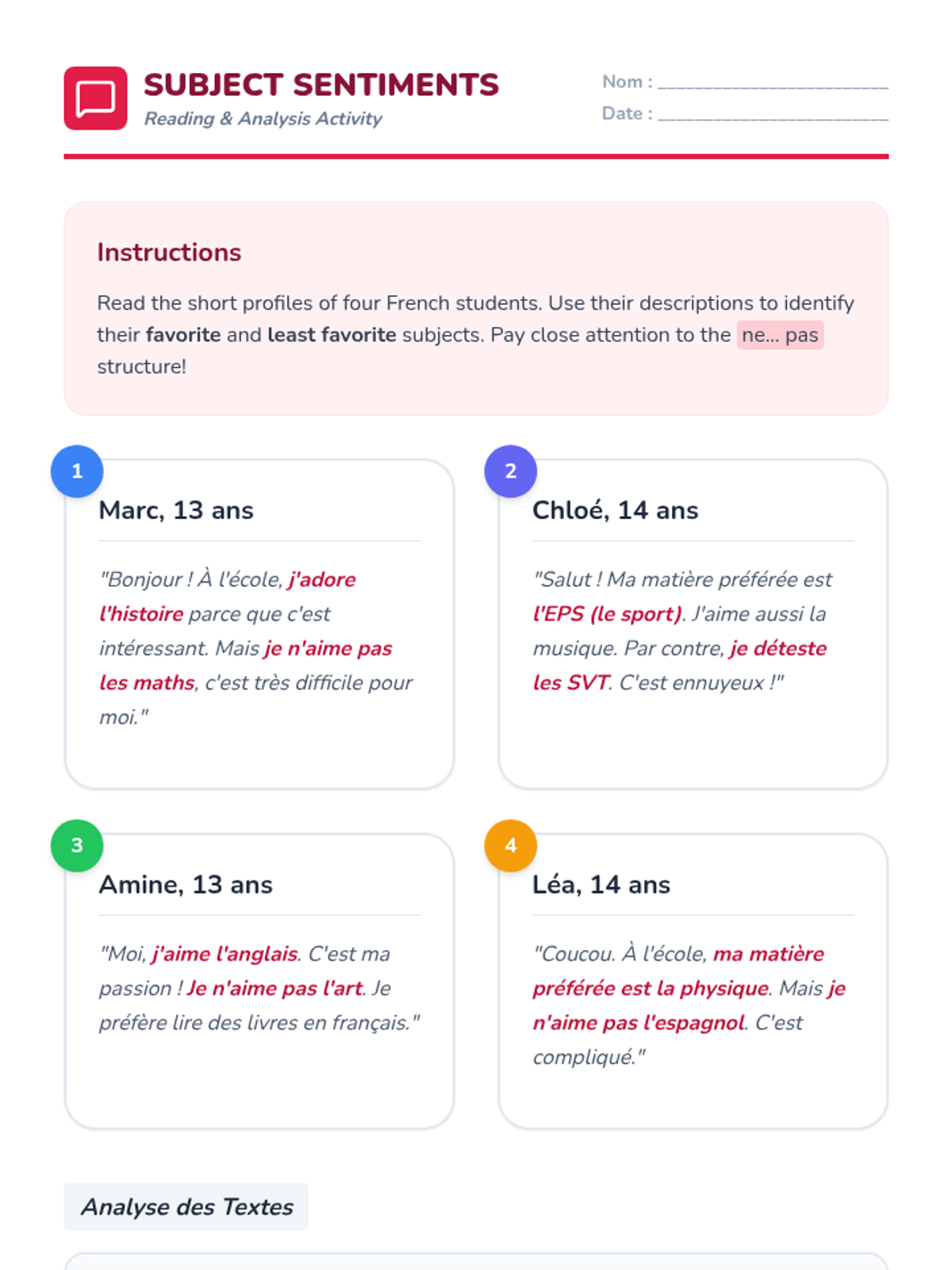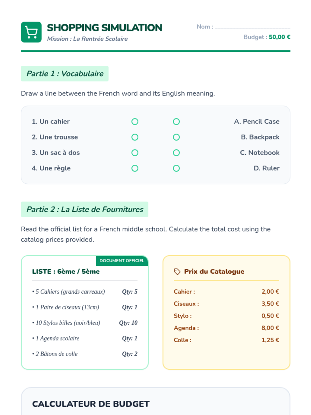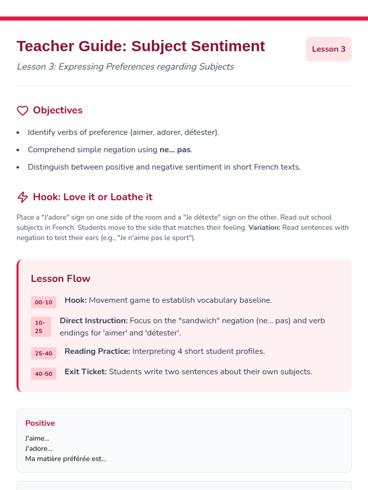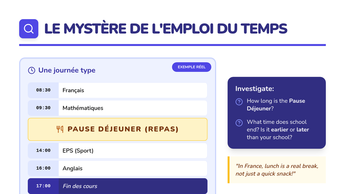 A comprehensive unit for 8th-grade French students focused on reading and interpreting authentic materials related to school life. Students compare French and American education systems through calendars, schedules, supplies, and personal opinions.