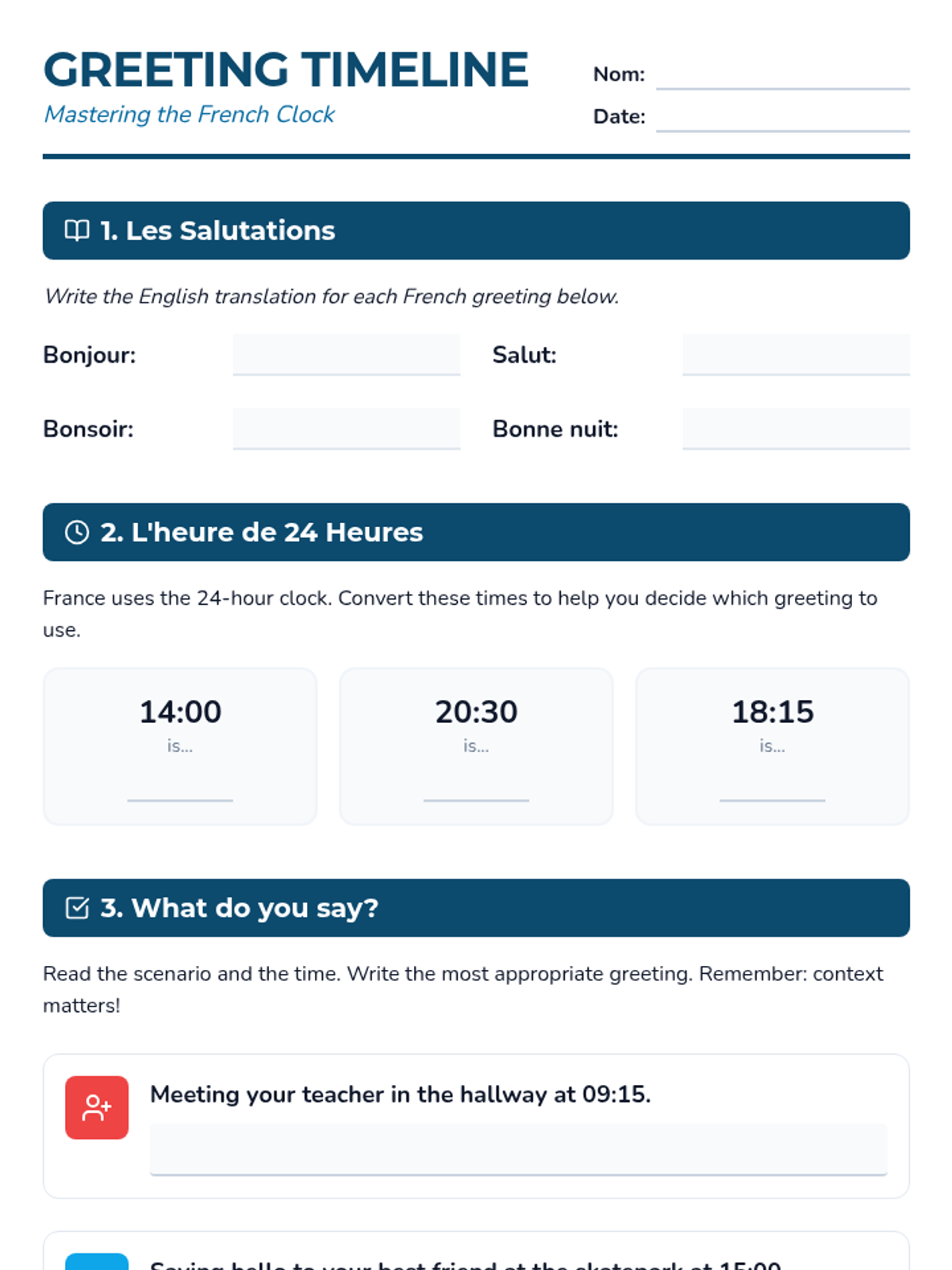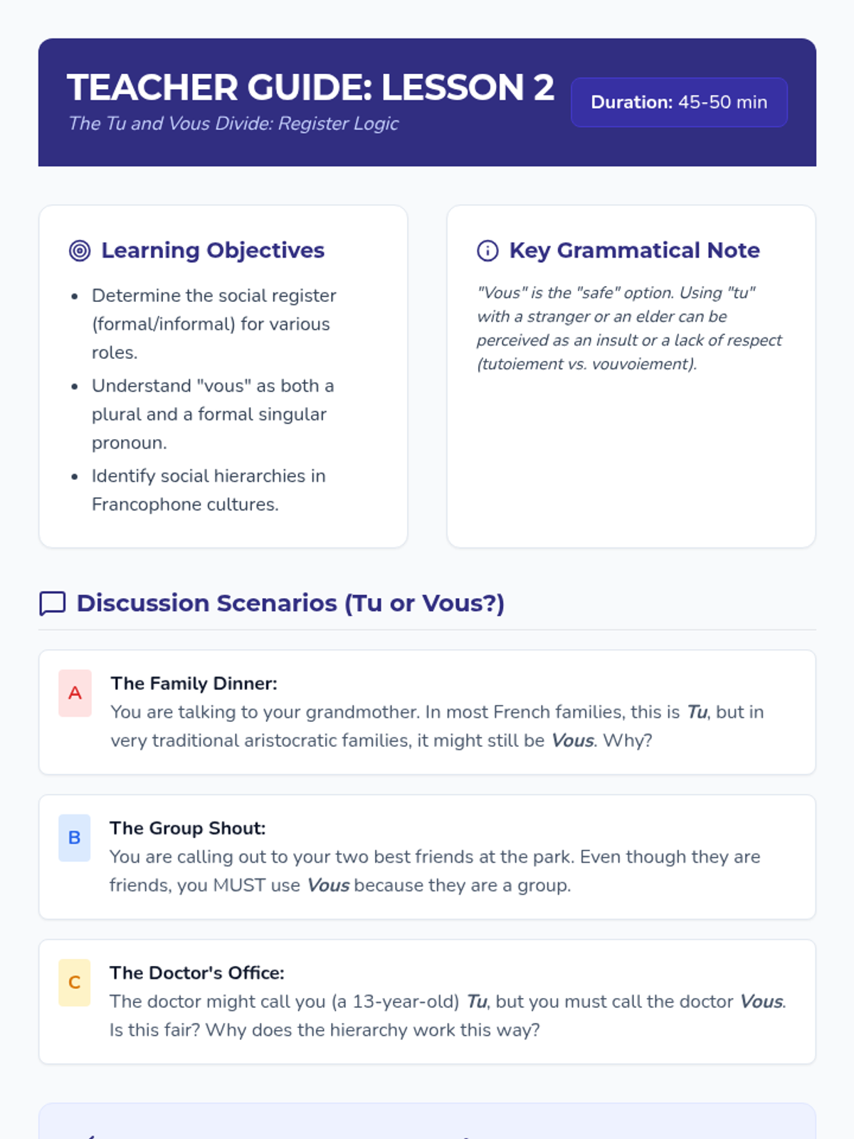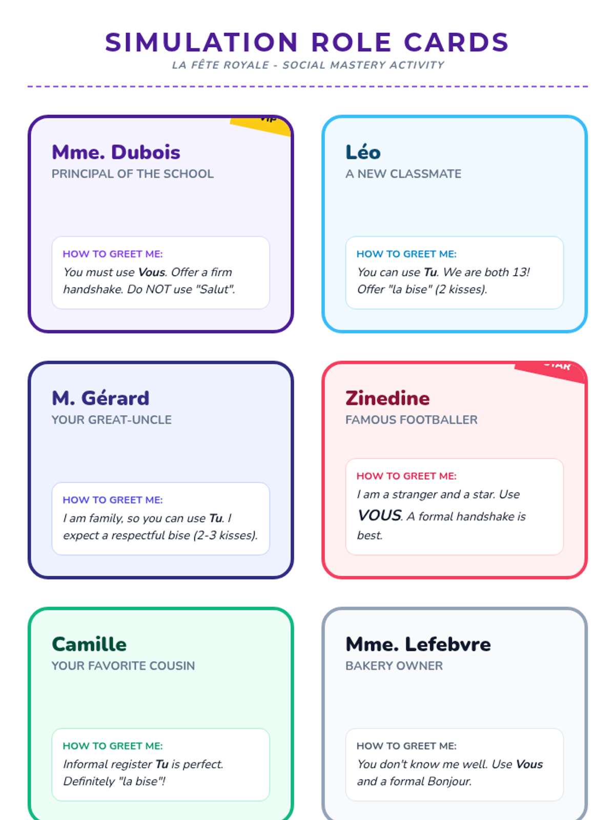 This immersive sequence introduces 7th-grade students to the cultural and linguistic nuances of French greetings. Students will master time-appropriate greetings, navigate the formal 'vous' vs. informal 'tu' registers, understand non-verbal customs like 'la bise', and perform social introductions in various contexts.