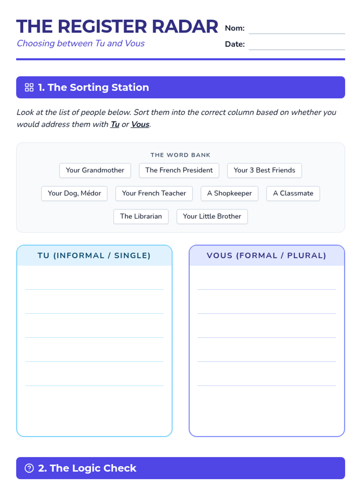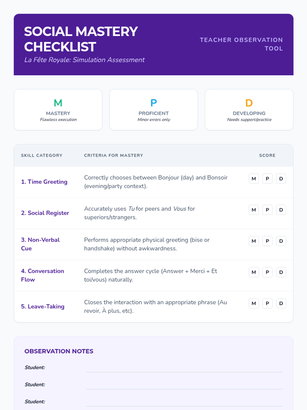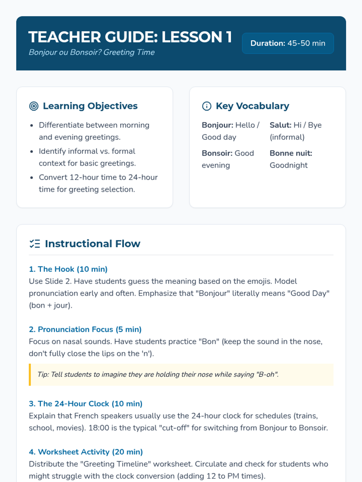 This immersive sequence introduces 7th-grade students to the cultural and linguistic nuances of French greetings. Students will master time-appropriate greetings, navigate the formal 'vous' vs. informal 'tu' registers, understand non-verbal customs like 'la bise', and perform social introductions in various contexts.