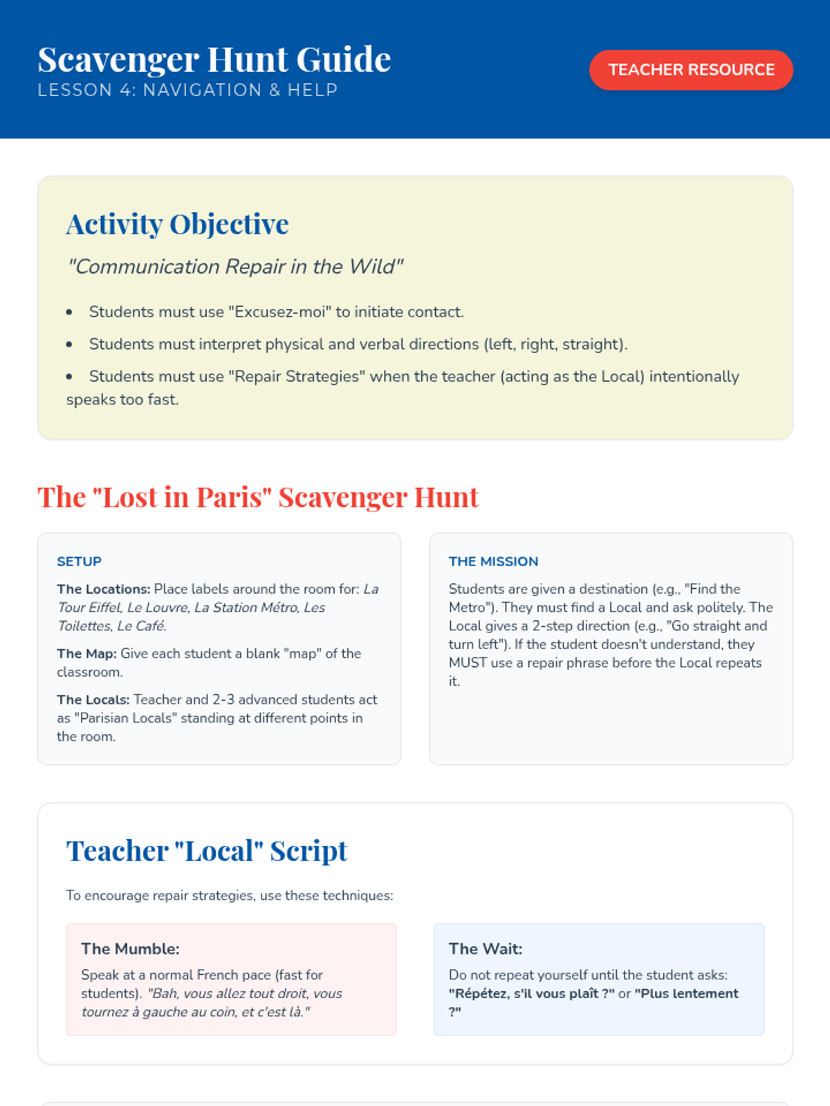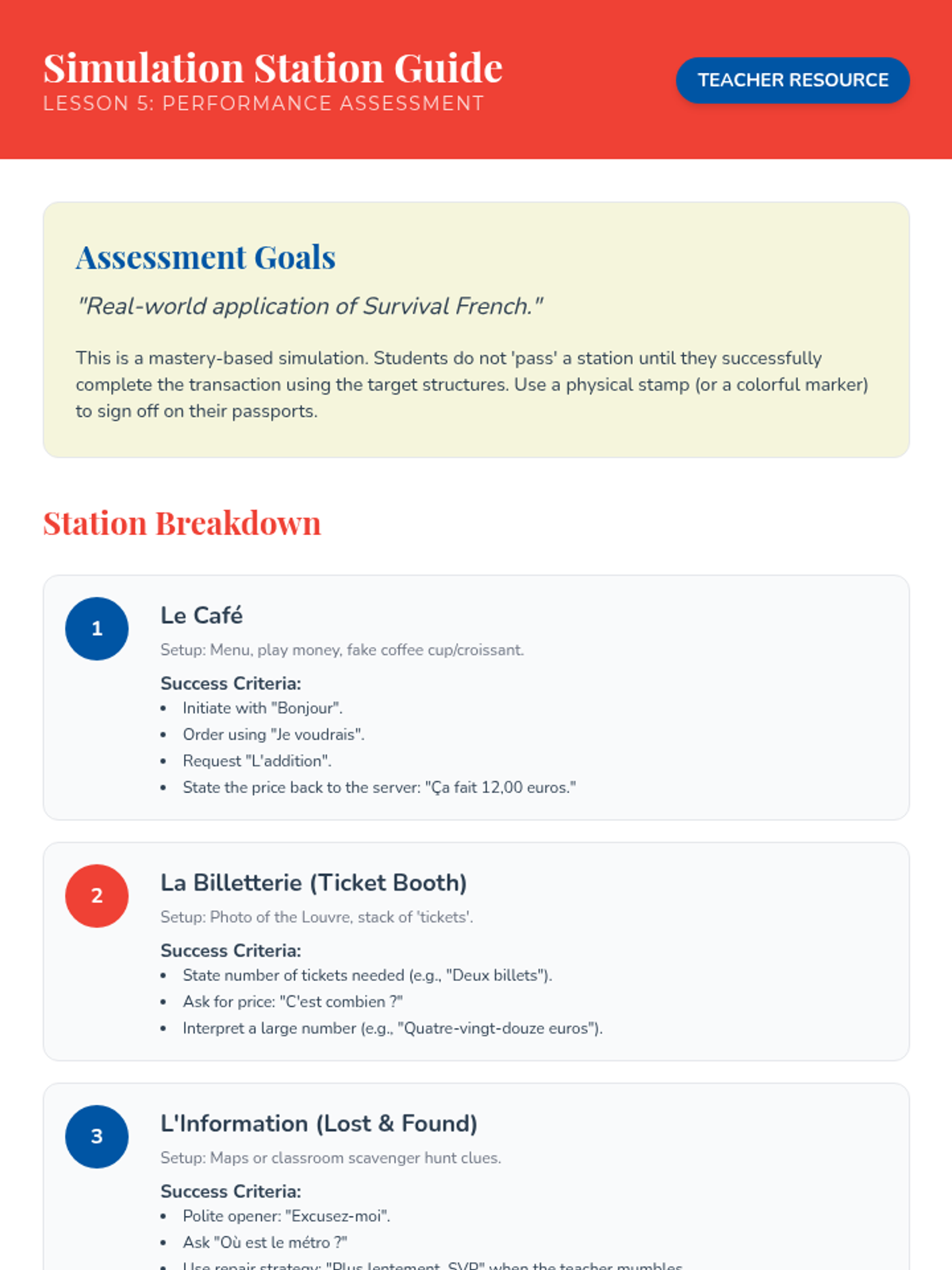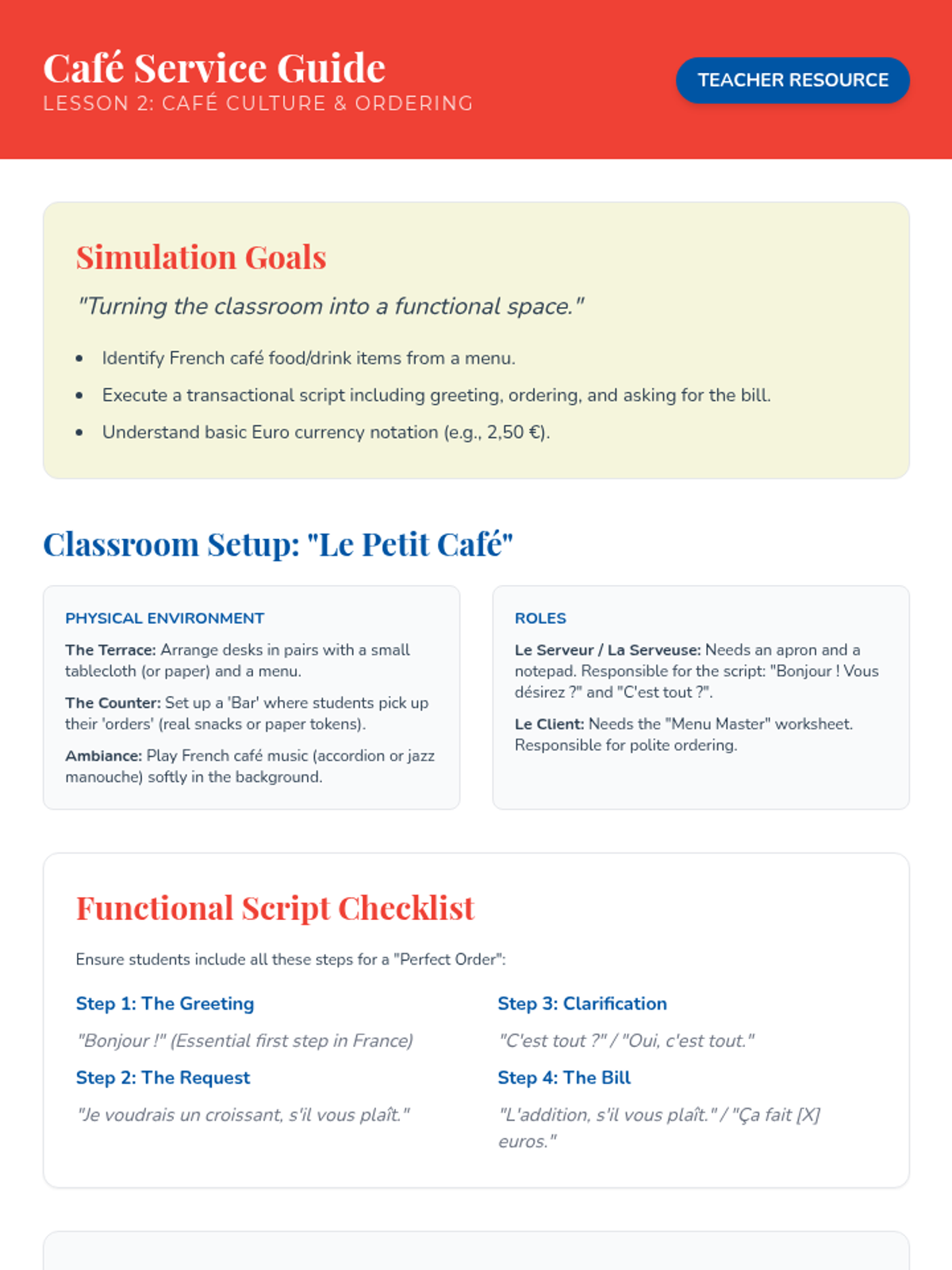 A comprehensive 5-lesson unit for 8th-grade French students focusing on 'Survival French.' Students learn to navigate transactional interactions (cafés, shops, directions) using polite structures and functional vocabulary.