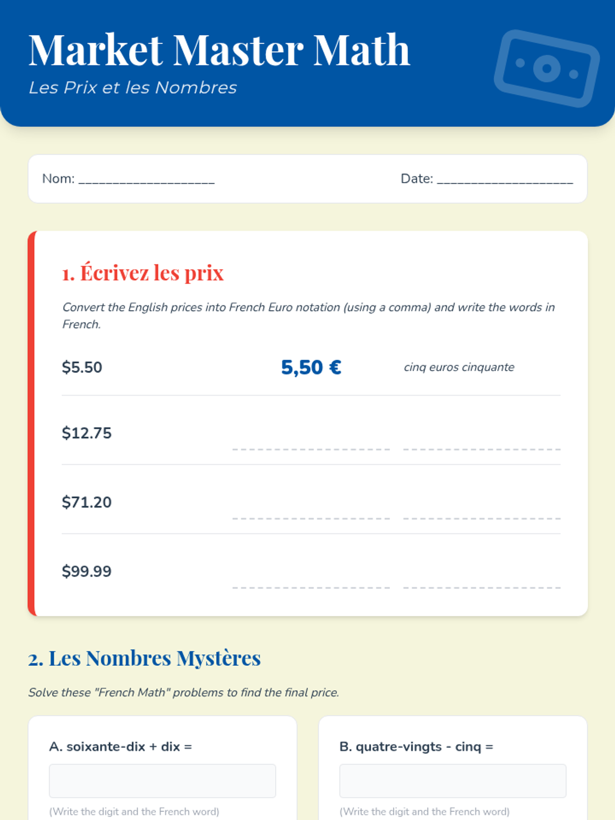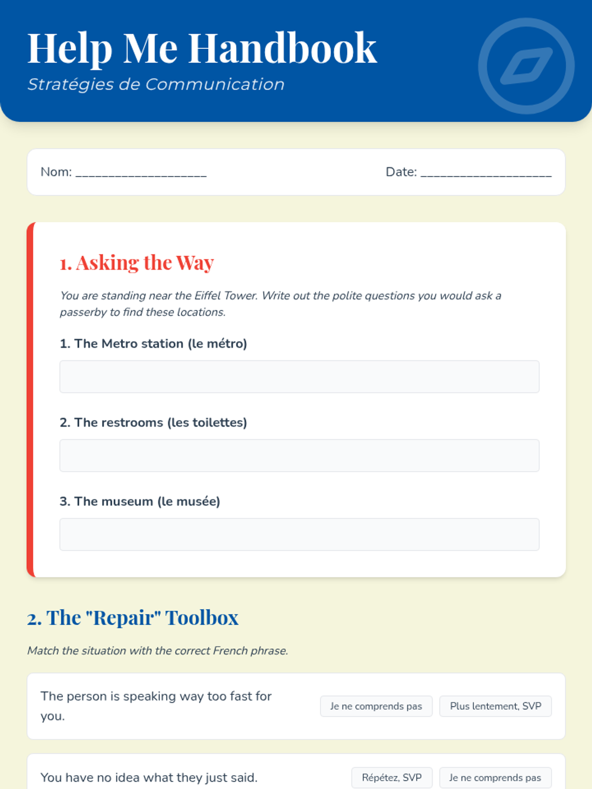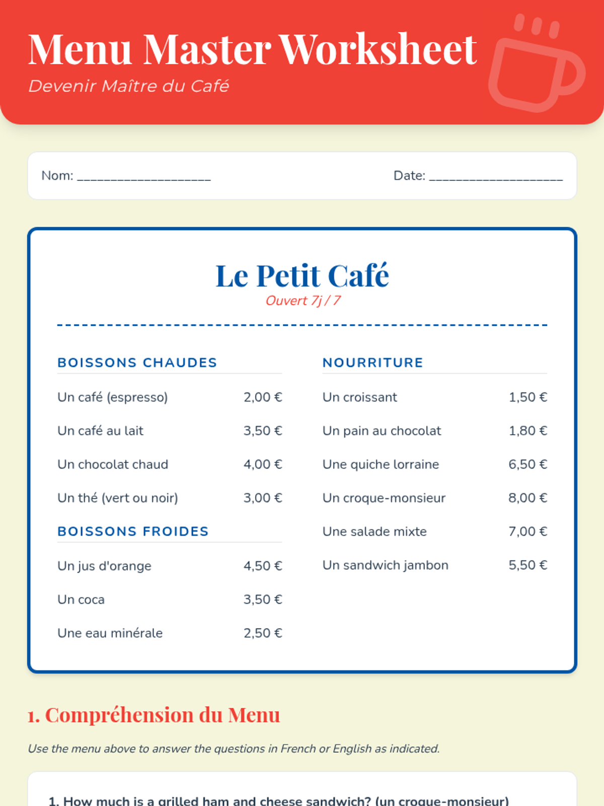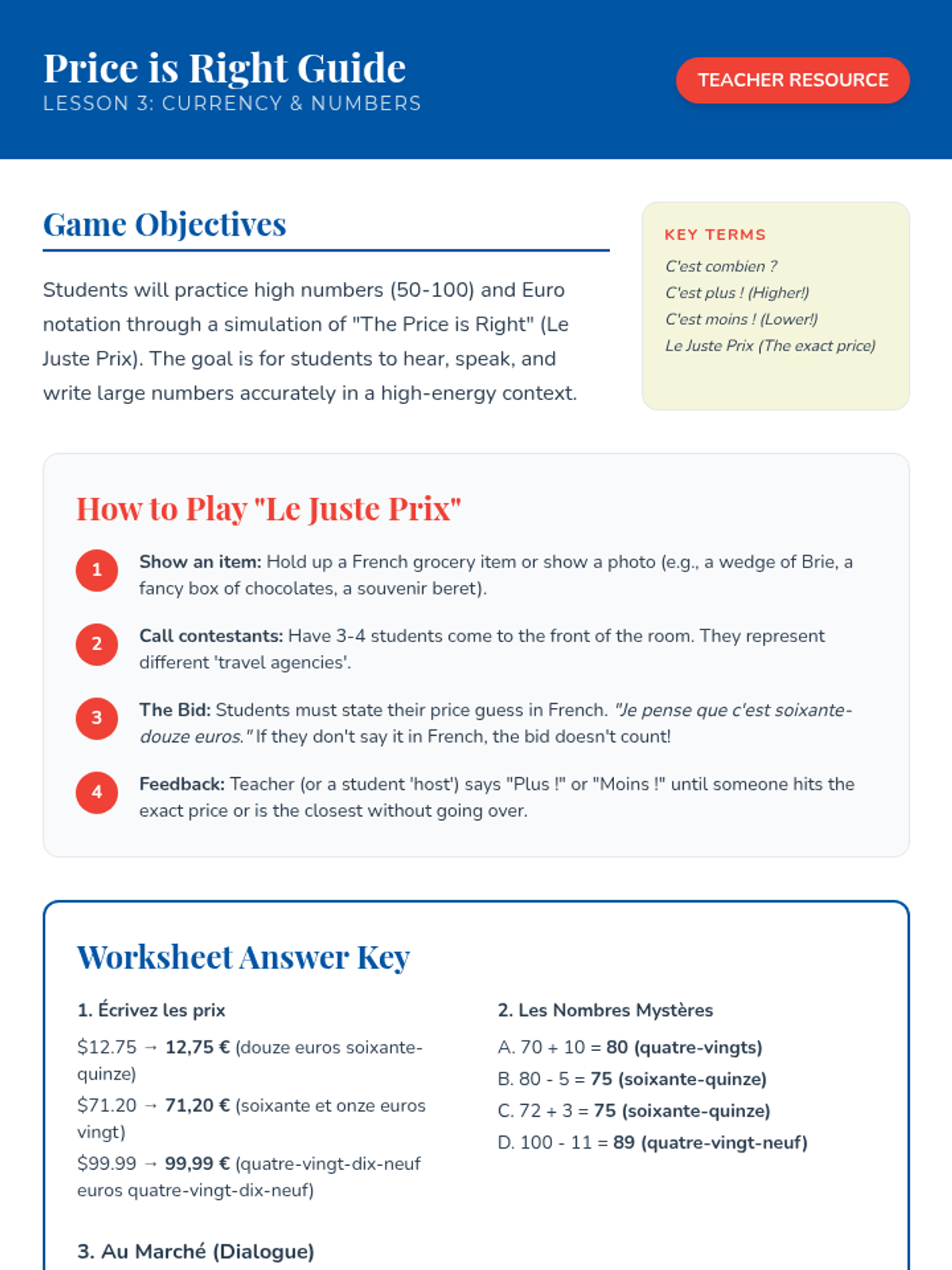 A comprehensive 5-lesson unit for 8th-grade French students focusing on 'Survival French.' Students learn to navigate transactional interactions (cafés, shops, directions) using polite structures and functional vocabulary.