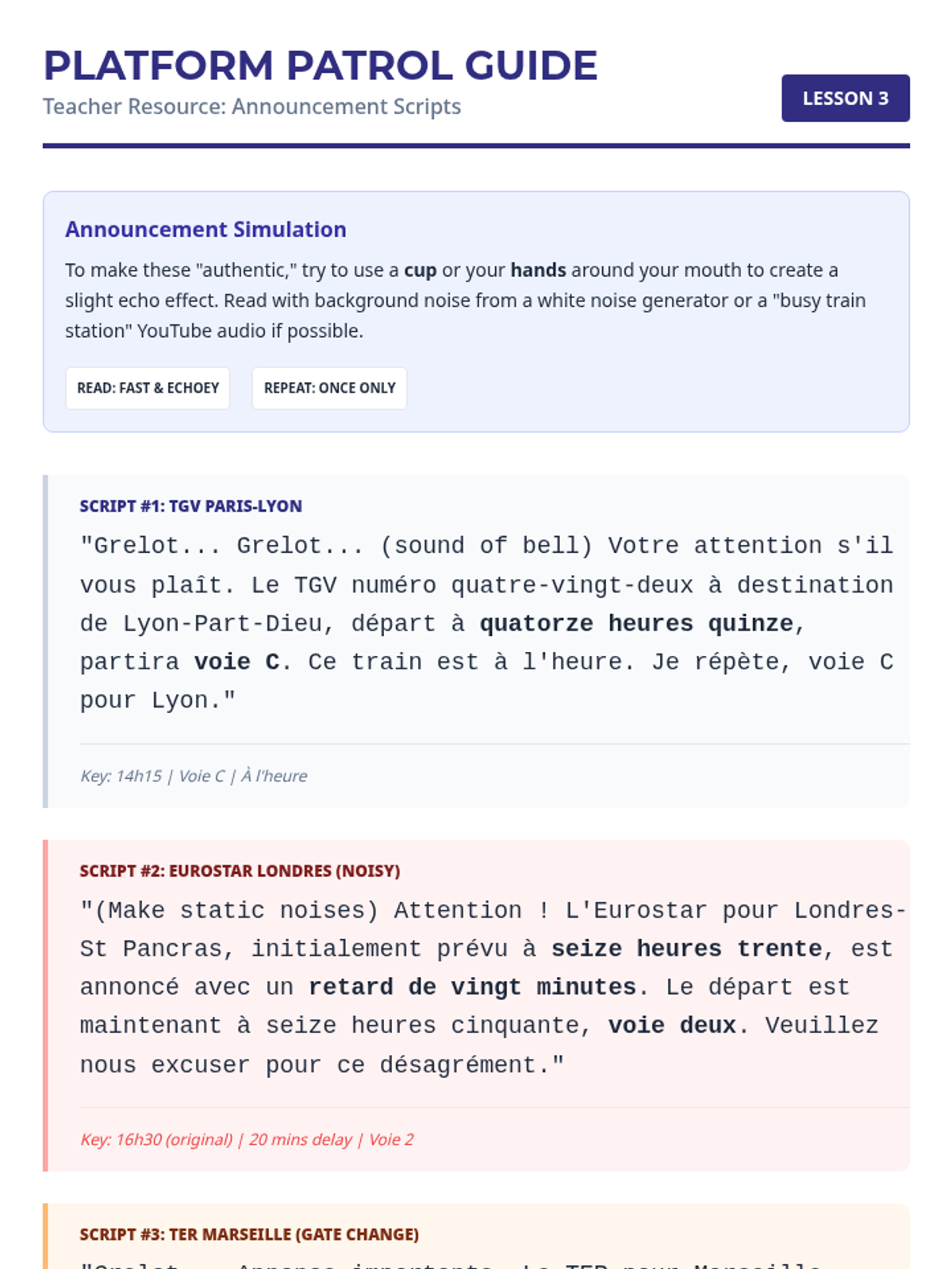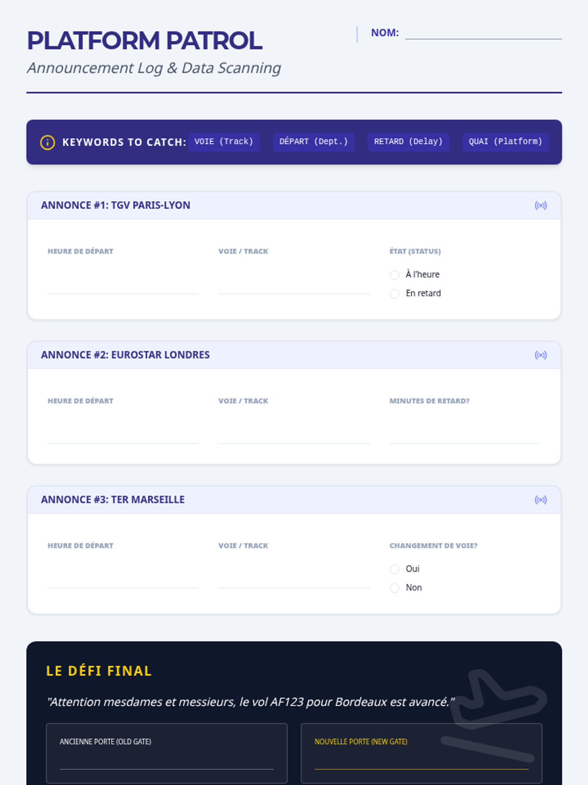 A high-stakes travel simulation building French listening proficiency in logistics: numbers, time, prices, and directions. Students navigate virtual 'survival' scenarios where accurate information processing is the key to a successful journey.