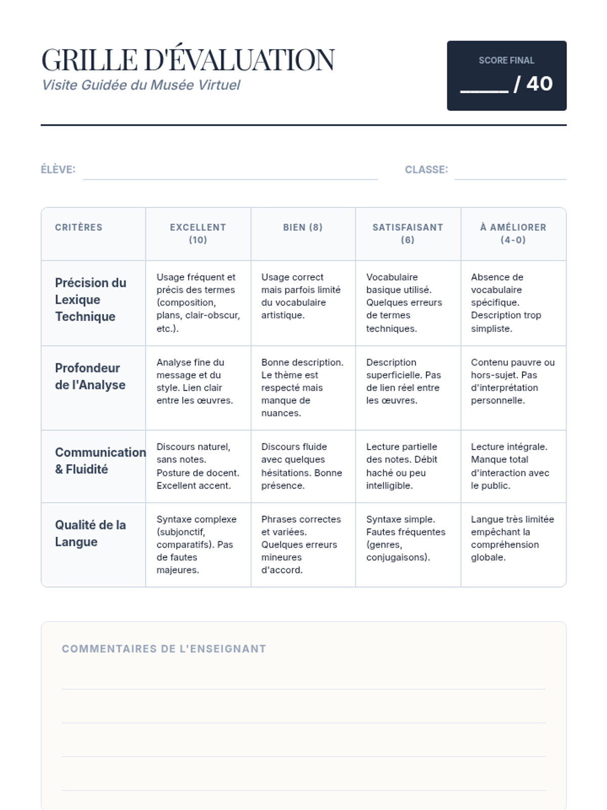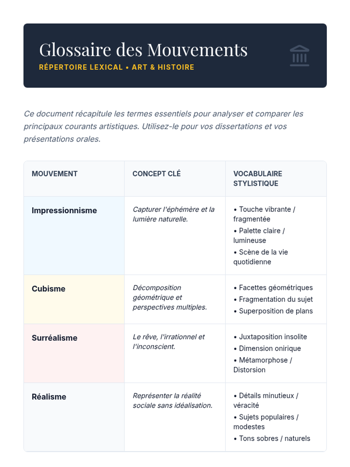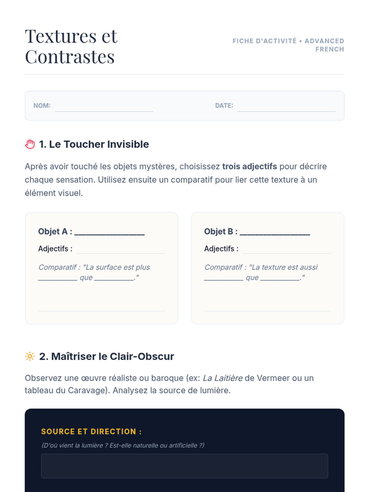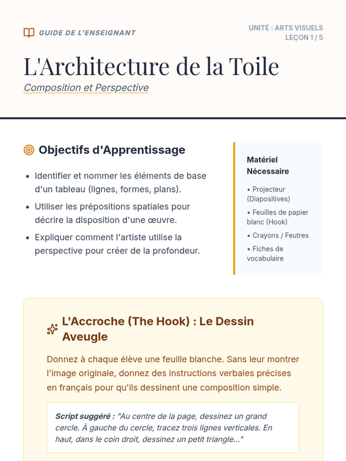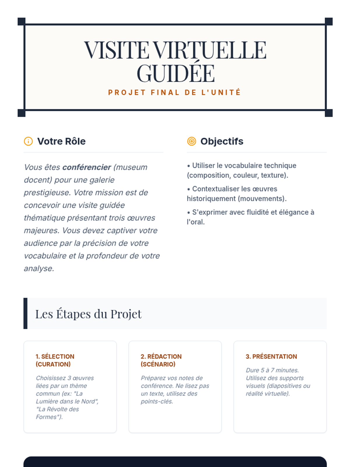 Focusing on aesthetics and cultural heritage, this 11th-grade Advanced French sequence provides the vocabulary to describe, critique, and appreciate visual arts. Students progress from basic spatial composition to complex art history analysis, culminating in a virtual museum tour.