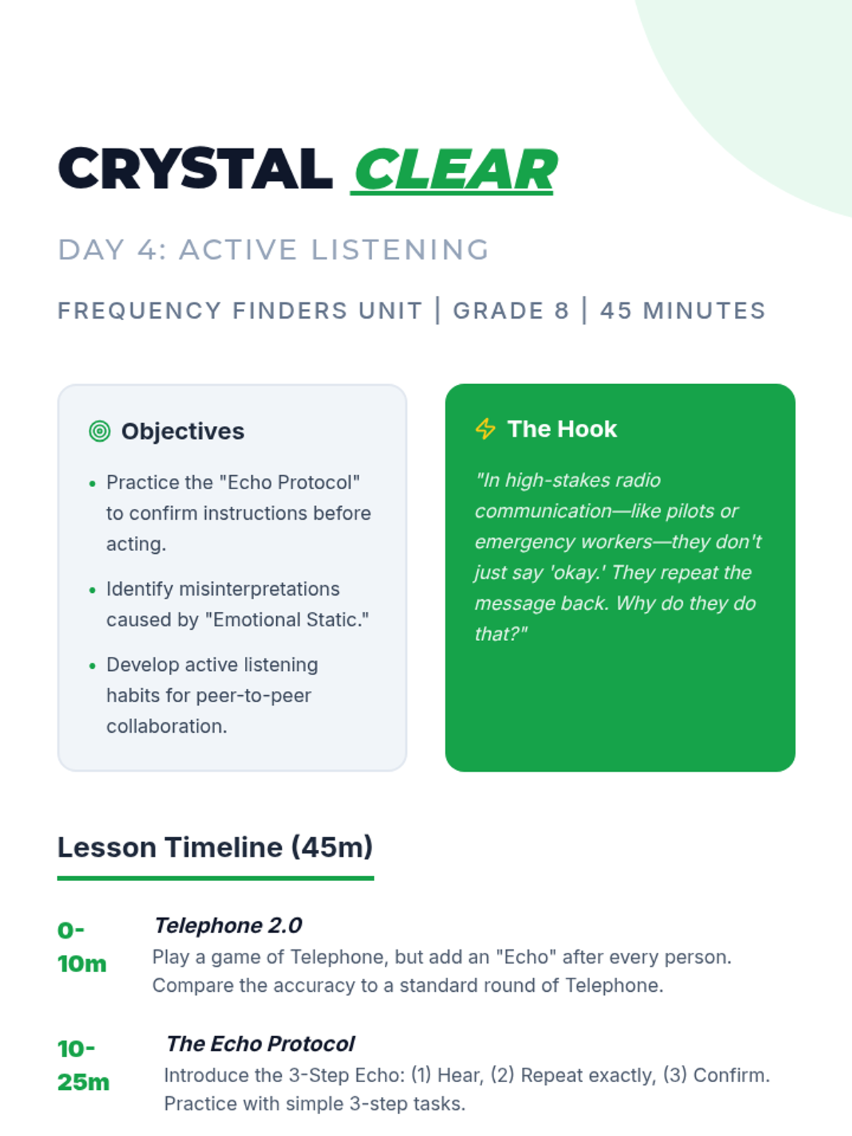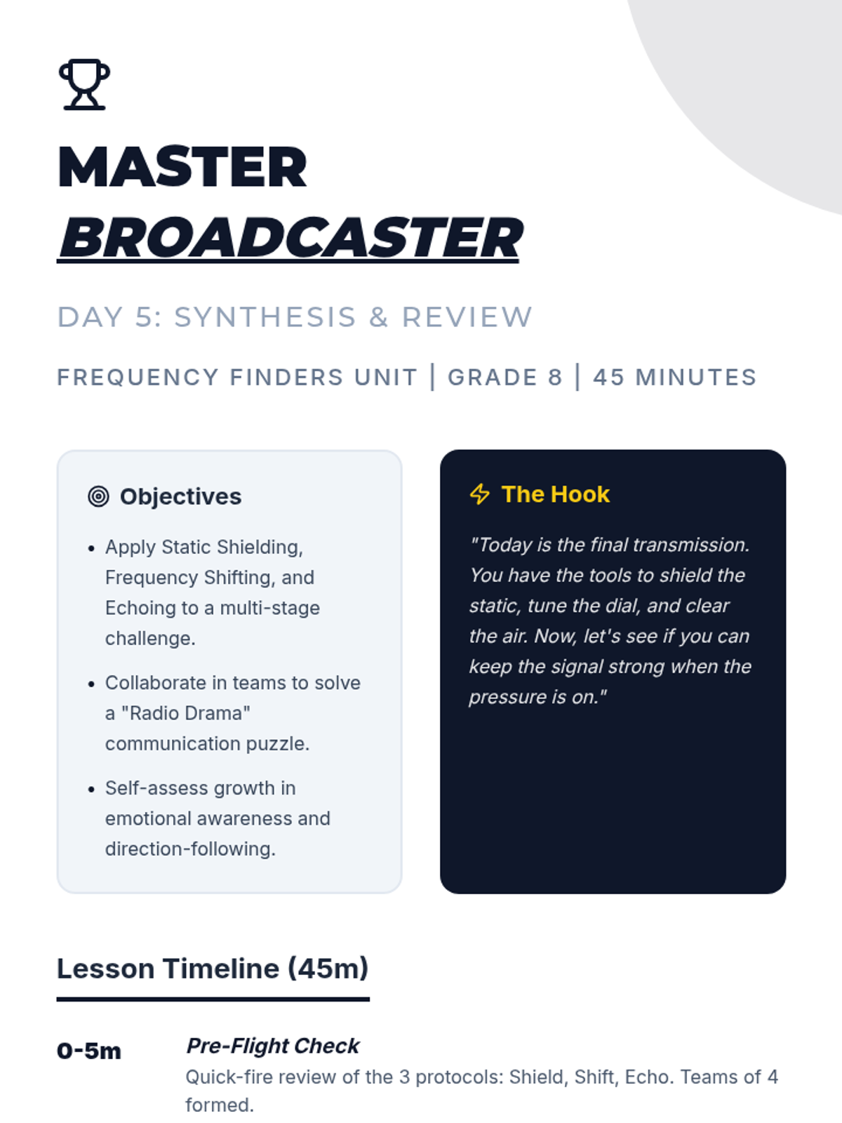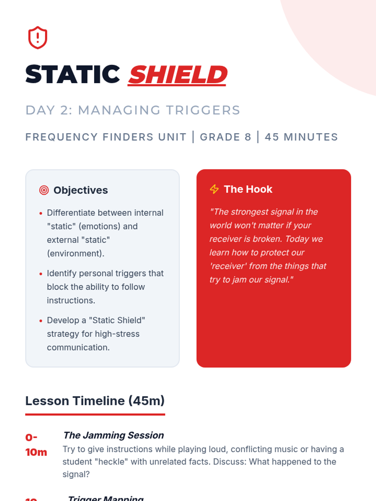 A 5-day communication and emotional intelligence unit for 8th graders. Using the metaphor of radio signals, students learn to identify emotional "static," regulate their "frequency," and broadcast "clear signals" in collaborative environments.