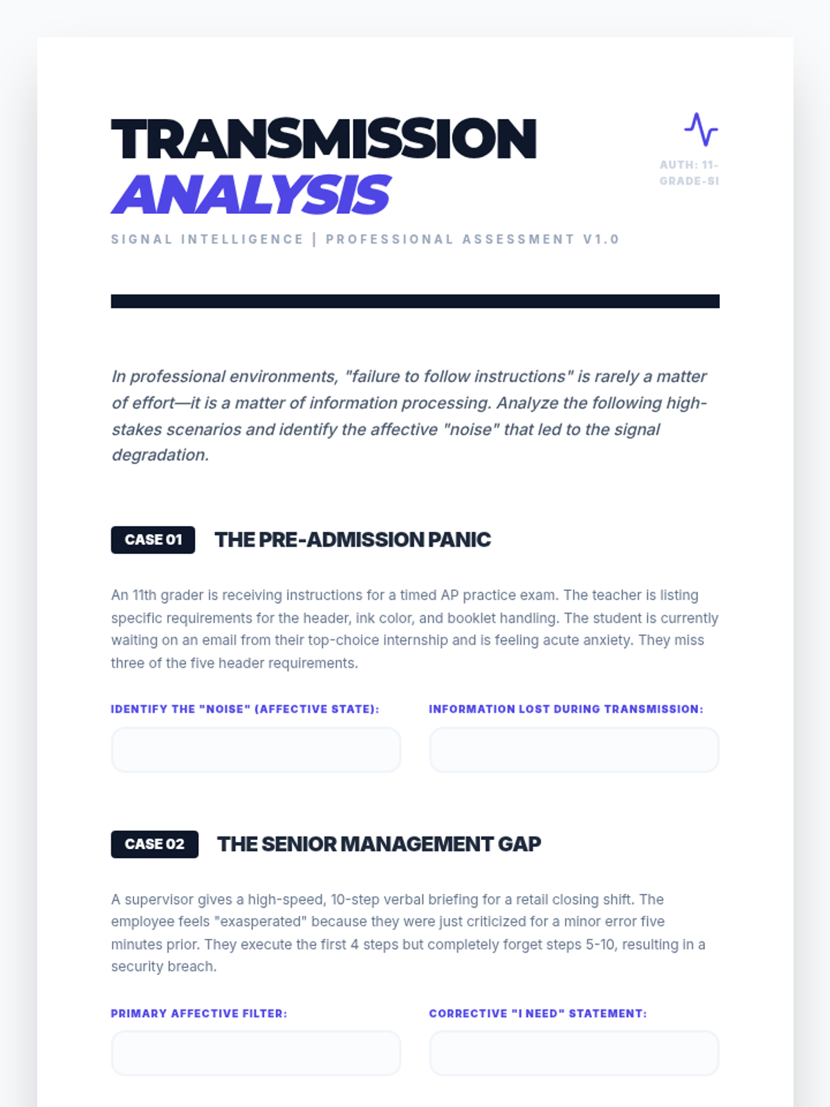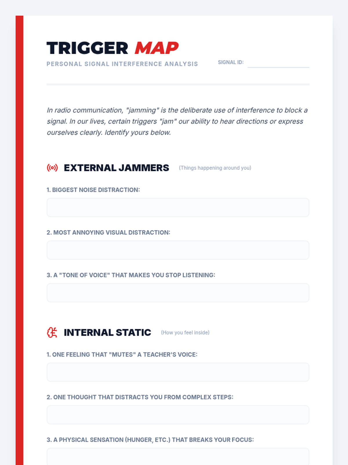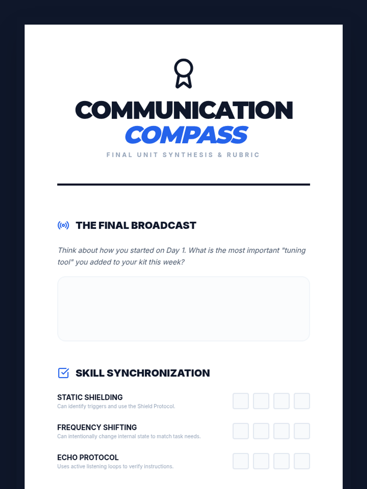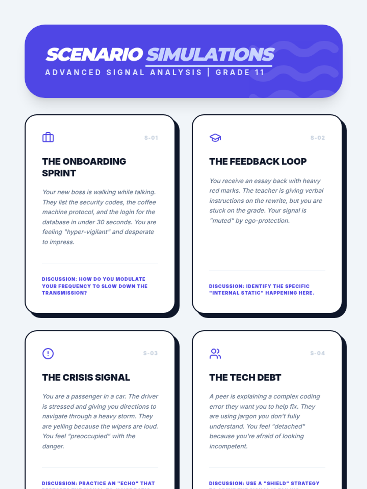 A 5-day communication and emotional intelligence unit for 8th graders. Using the metaphor of radio signals, students learn to identify emotional "static," regulate their "frequency," and broadcast "clear signals" in collaborative environments.