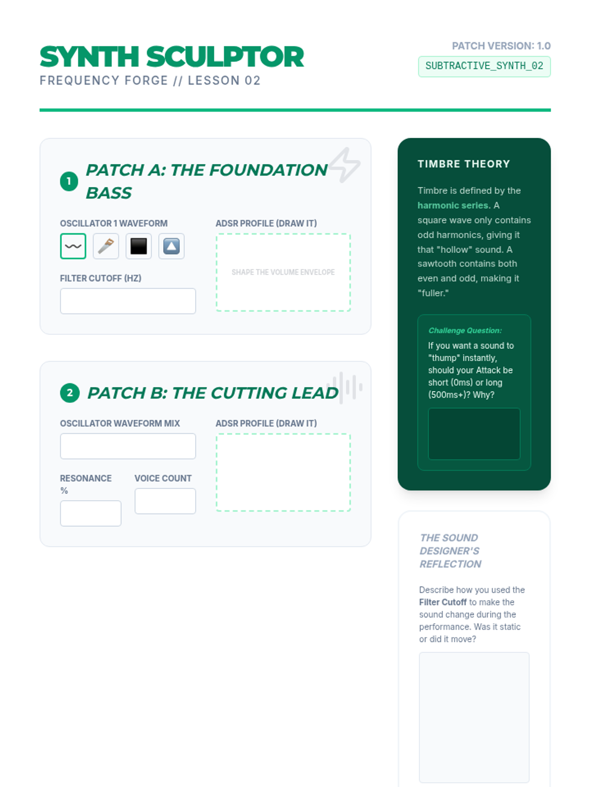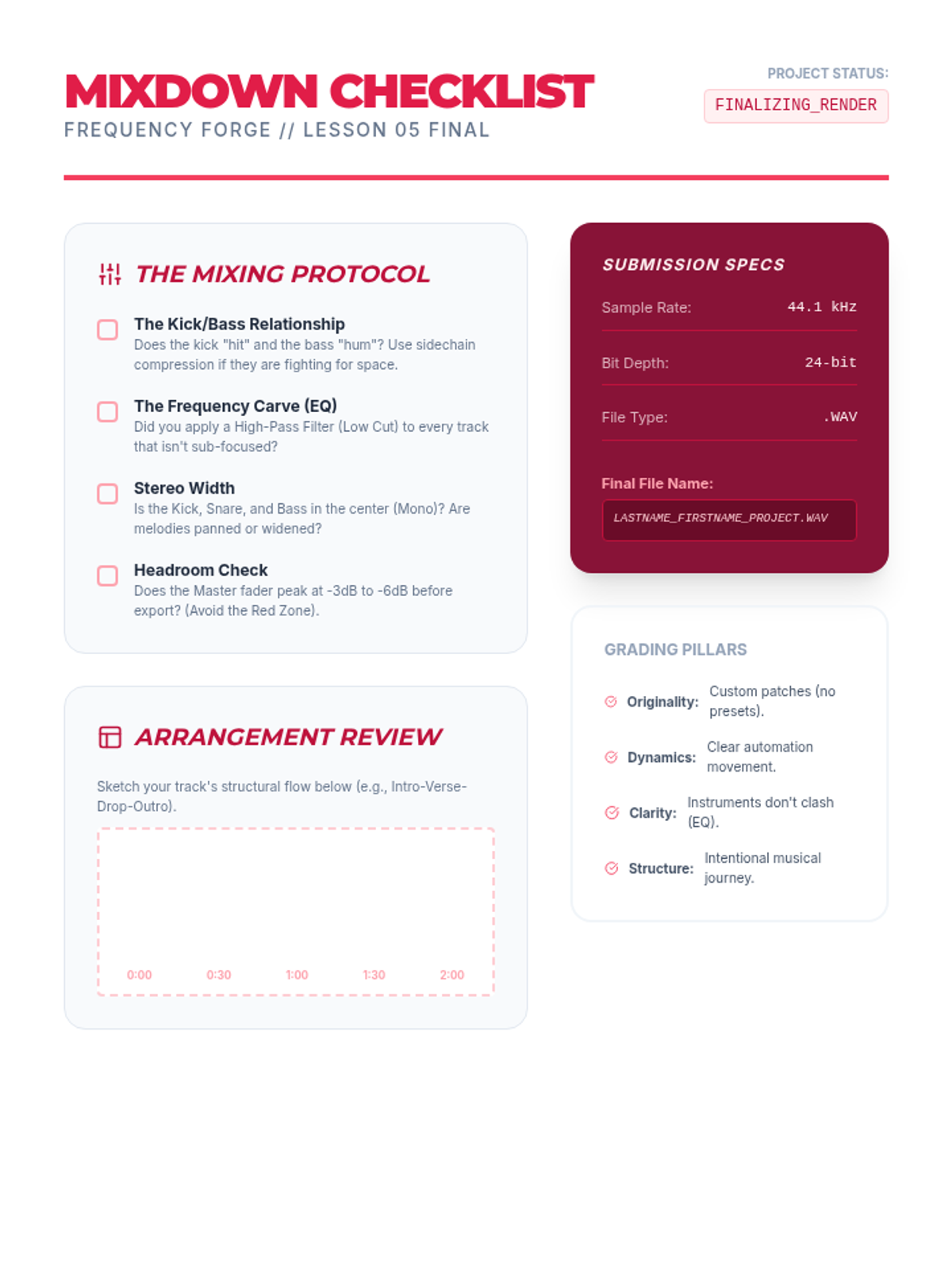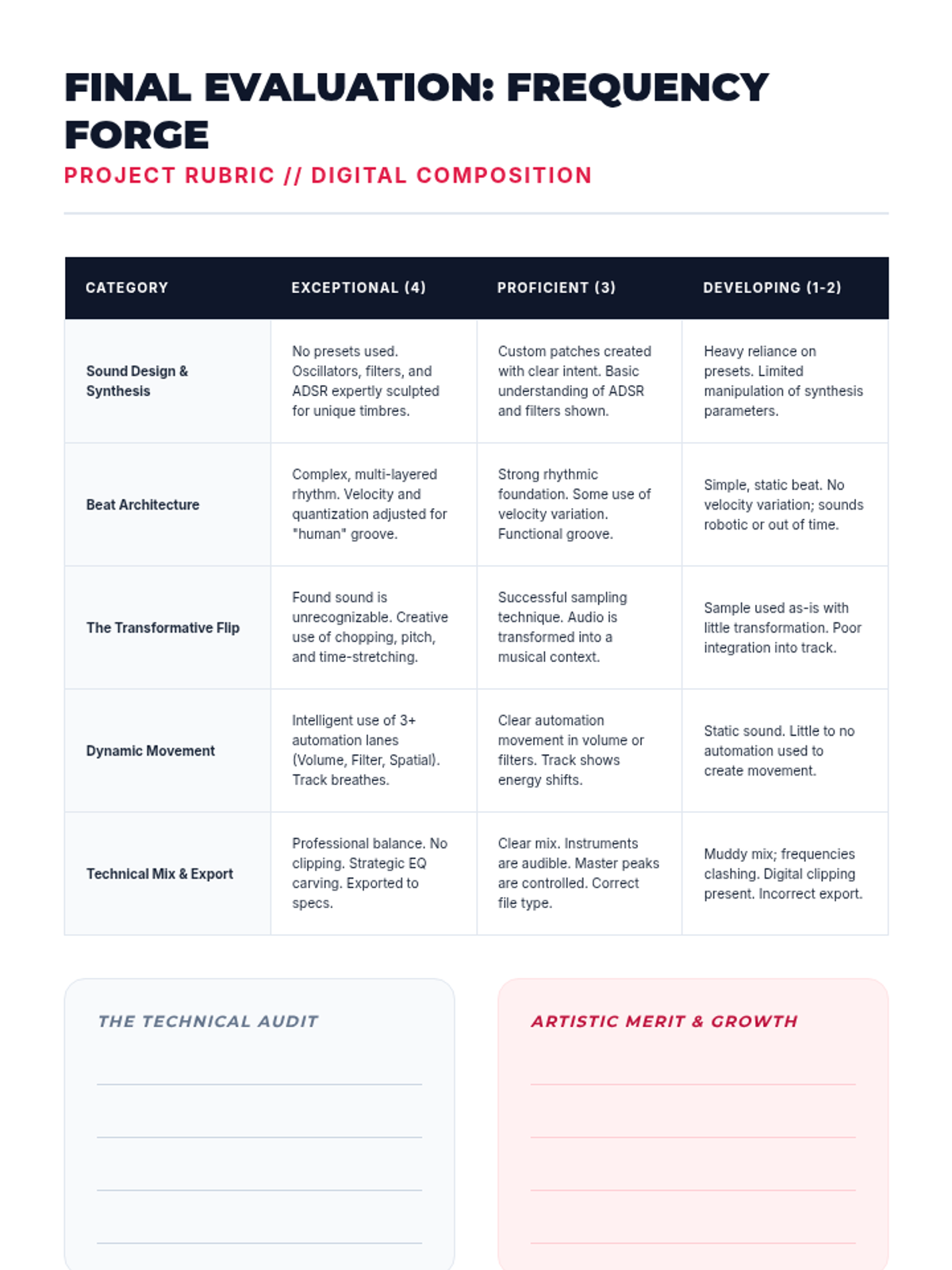 A comprehensive 11th-grade music composition sequence focusing on digital music production, synthesis, sampling, and sound design using DAWs. Students move from basic beat architecture to complex synthesis and professional mixing techniques.