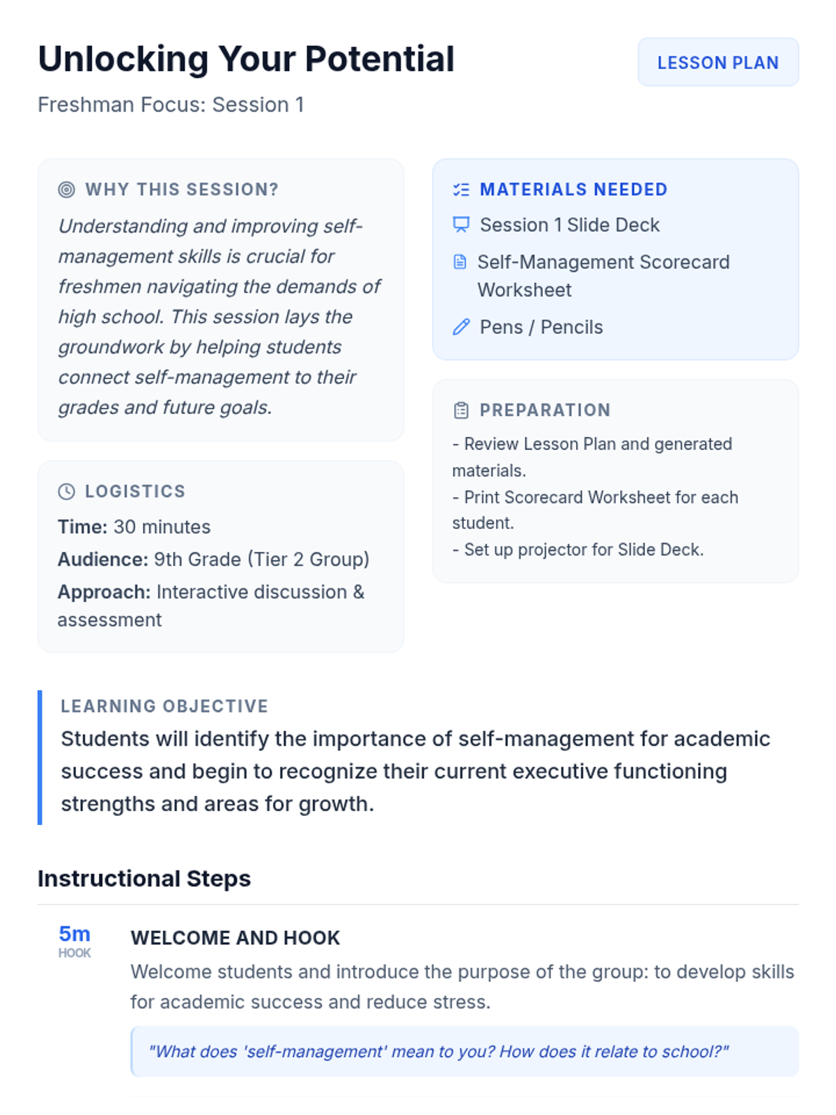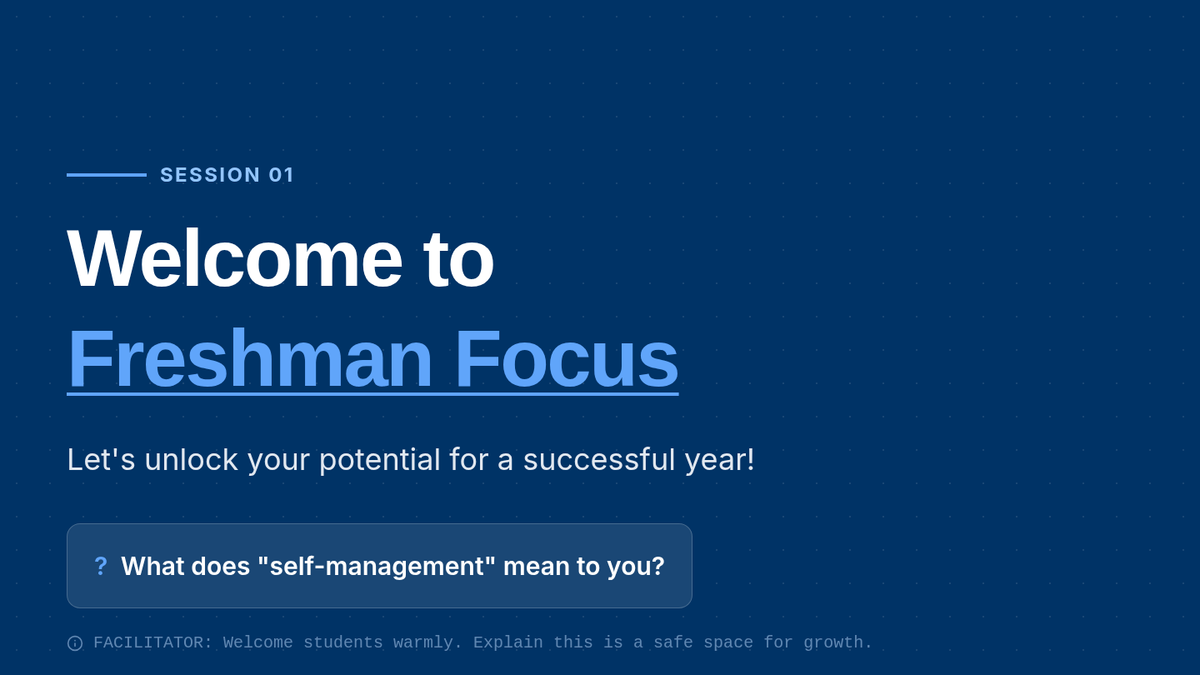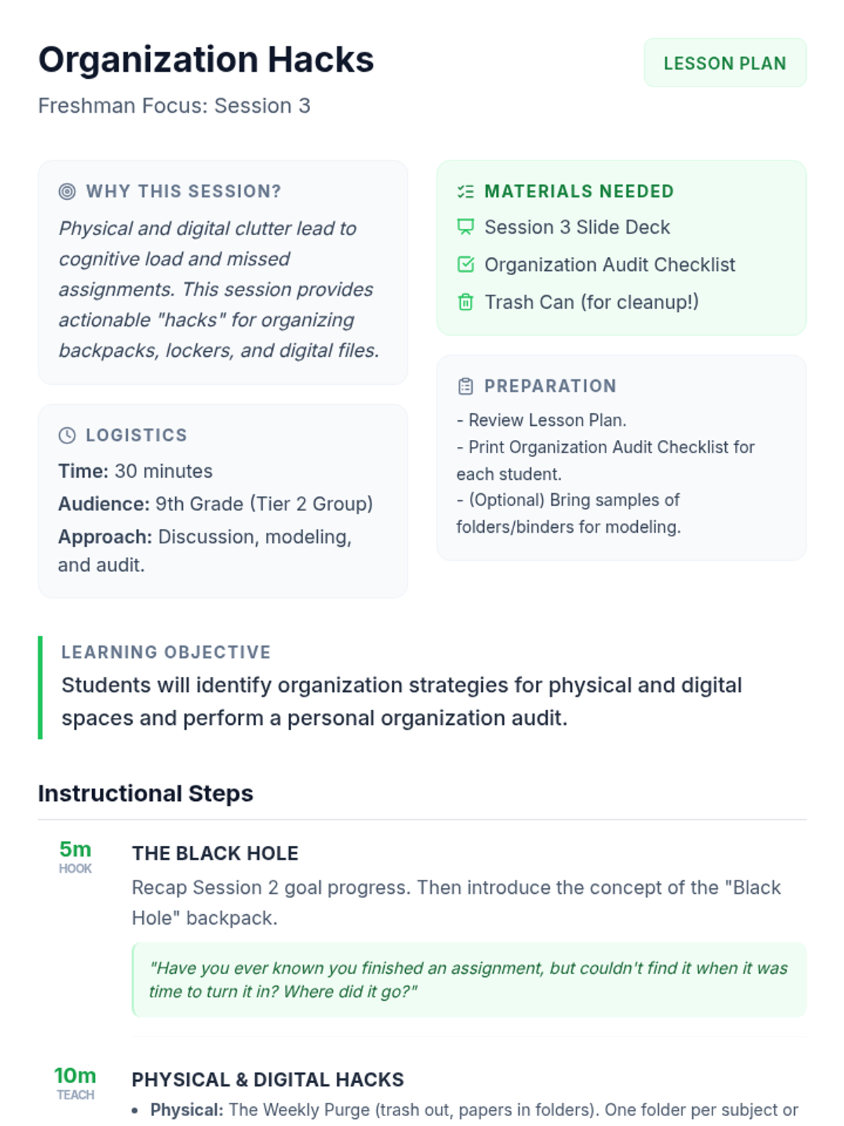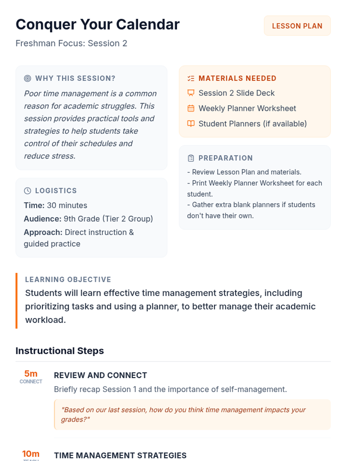 A 5-session Tier 2 intervention for 9th-grade students focused on executive functioning, time management, and academic planning to improve grades and reduce stress.
