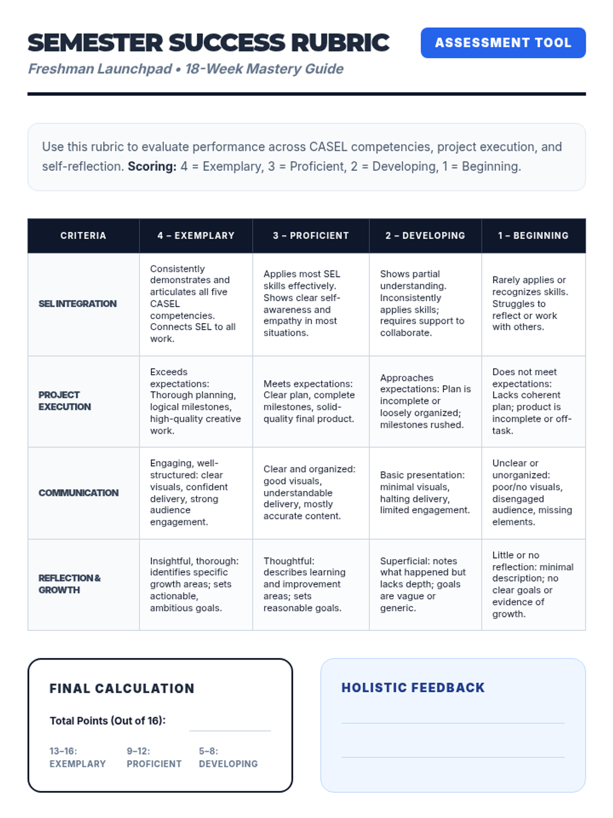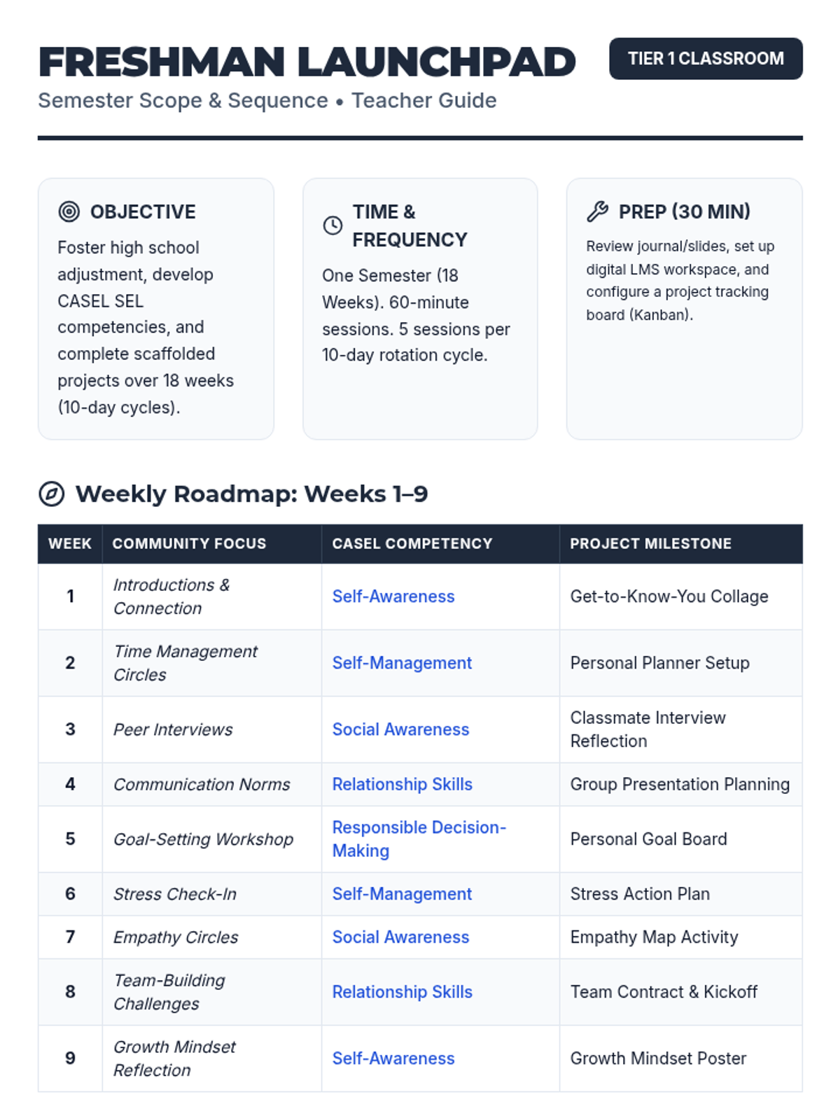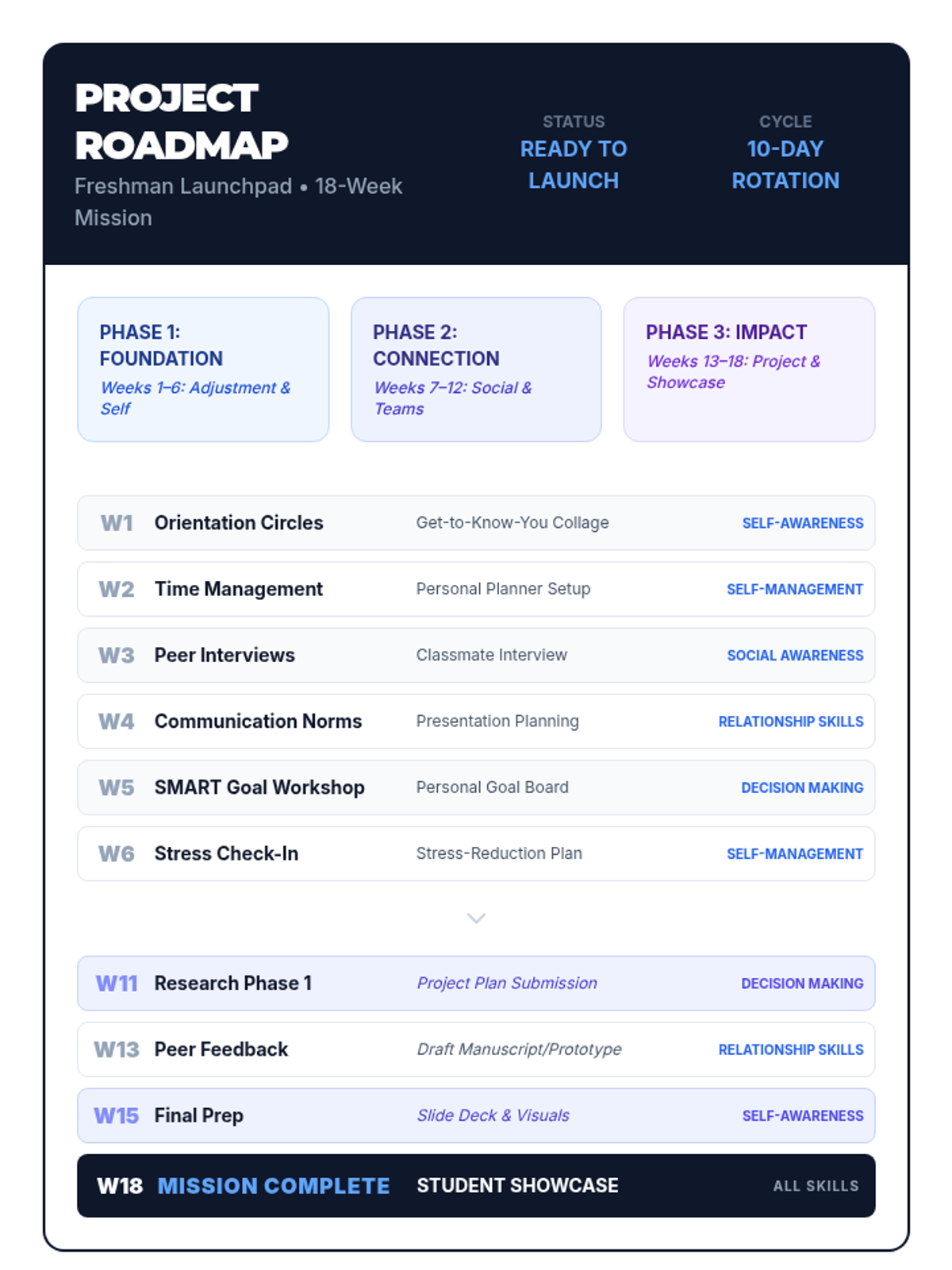 A comprehensive 18-week transition program for 9th graders designed to build community, develop social-emotional competencies, and guide students through a scaffolded semester-long project.