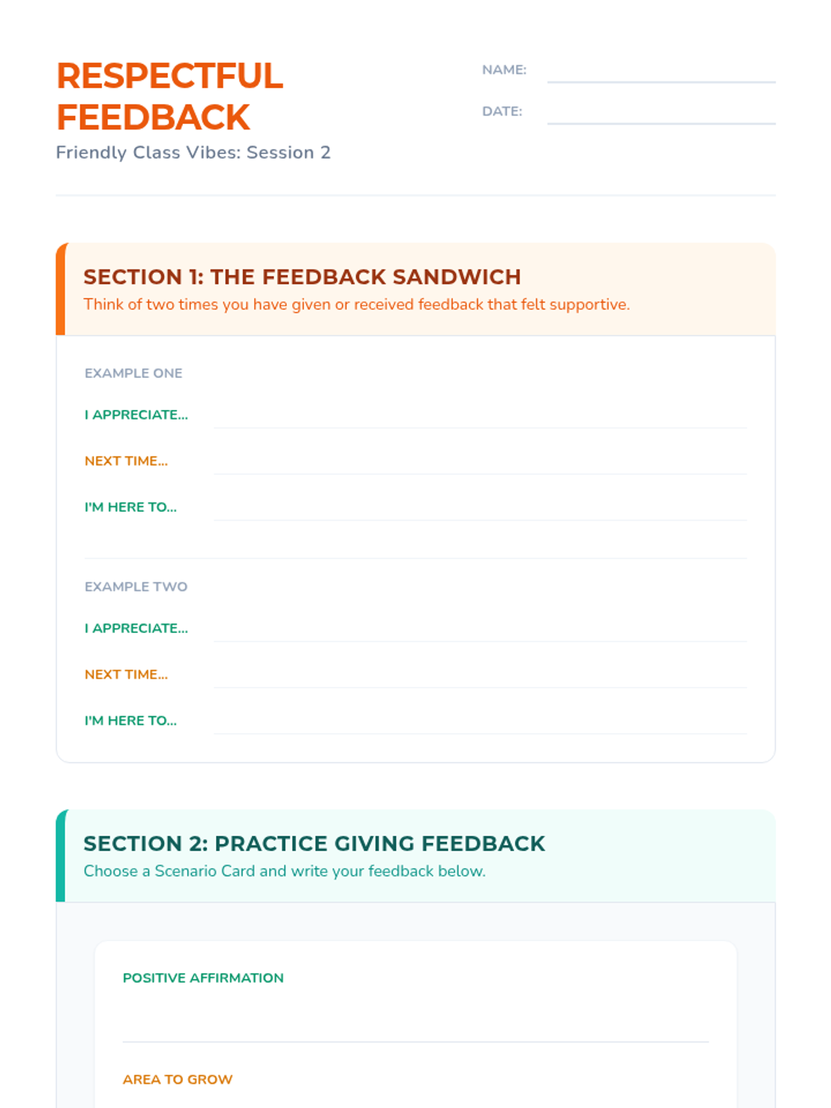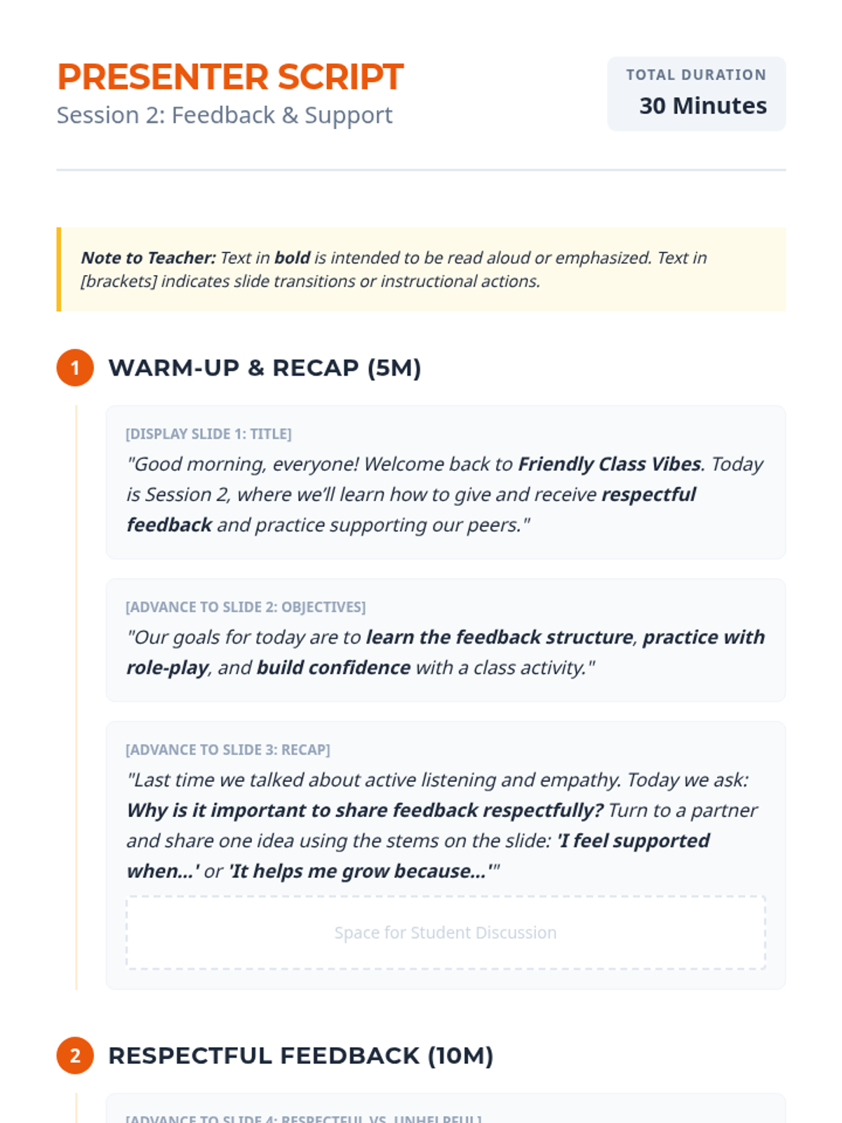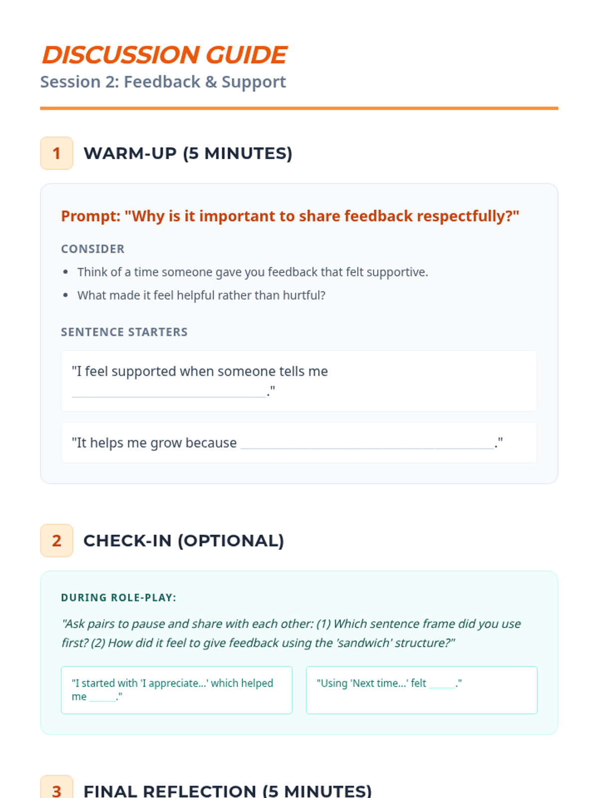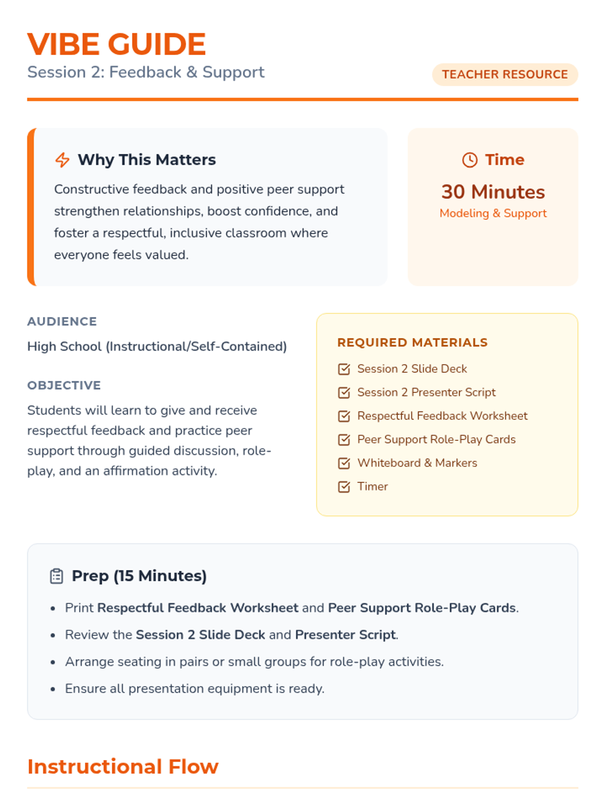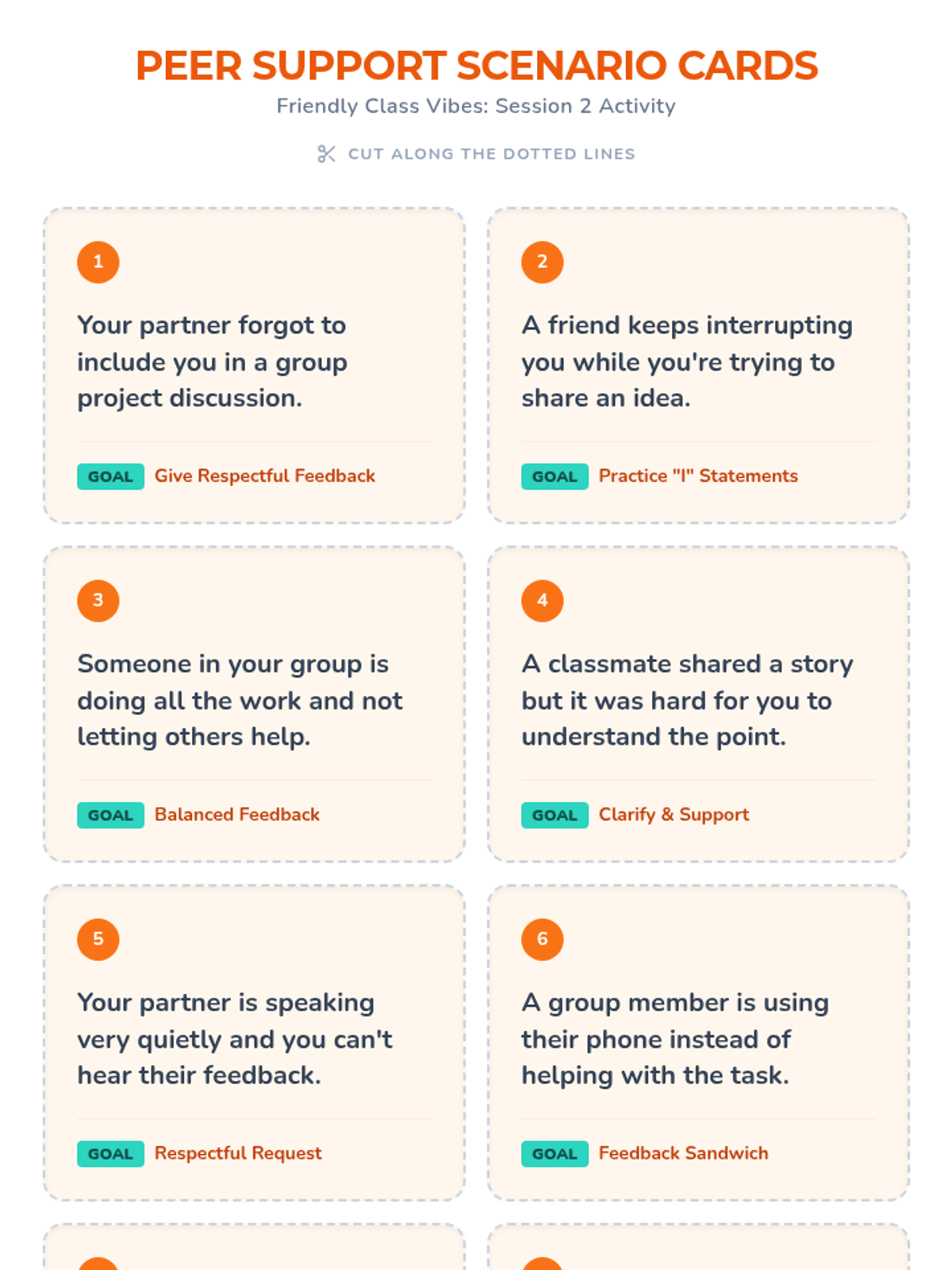 A two-session sequence designed for high school students in instructional settings to develop positive peer engagement strategies. Students practice active listening, empathy, and respectful feedback through interactive activities and role-play.