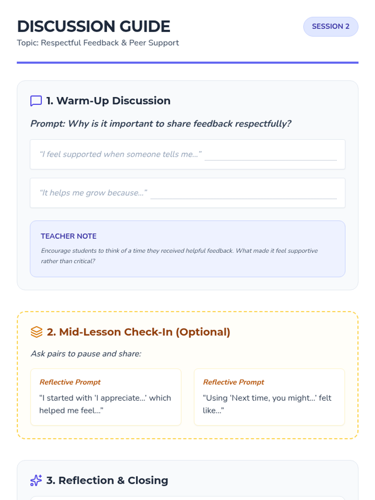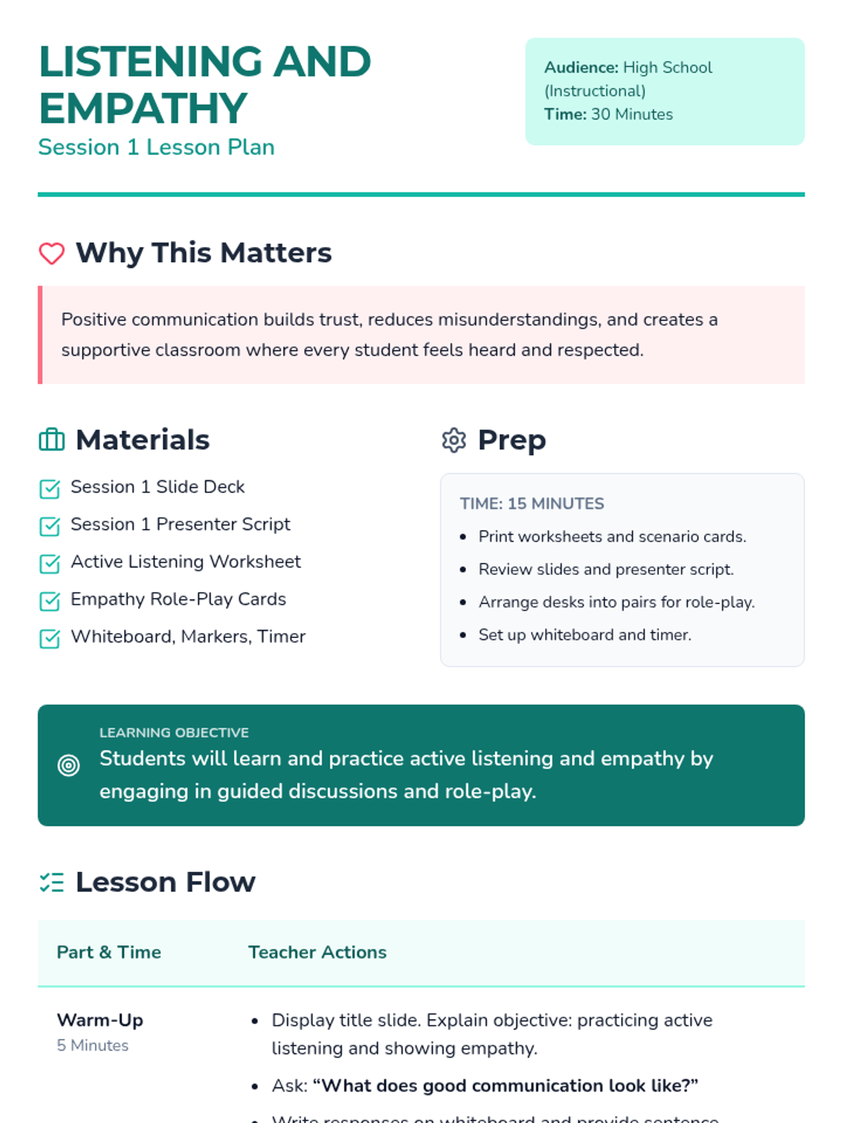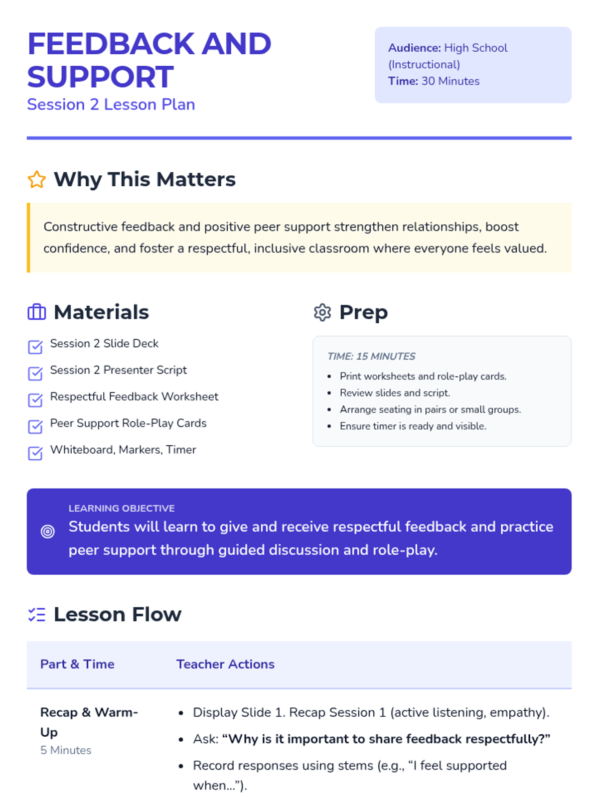 A two-session sequence for high school students in instructional settings to develop positive peer engagement strategies, focusing on active listening, empathy, and respectful feedback.