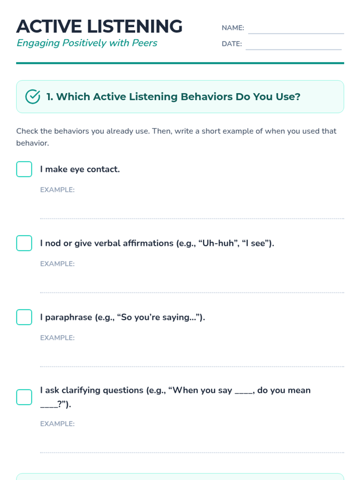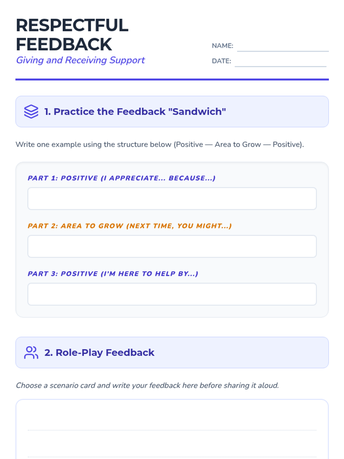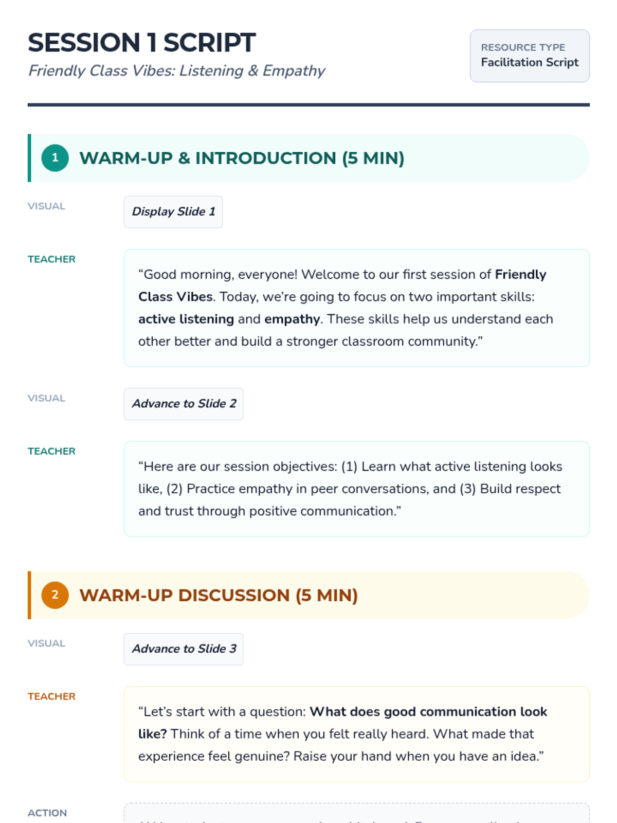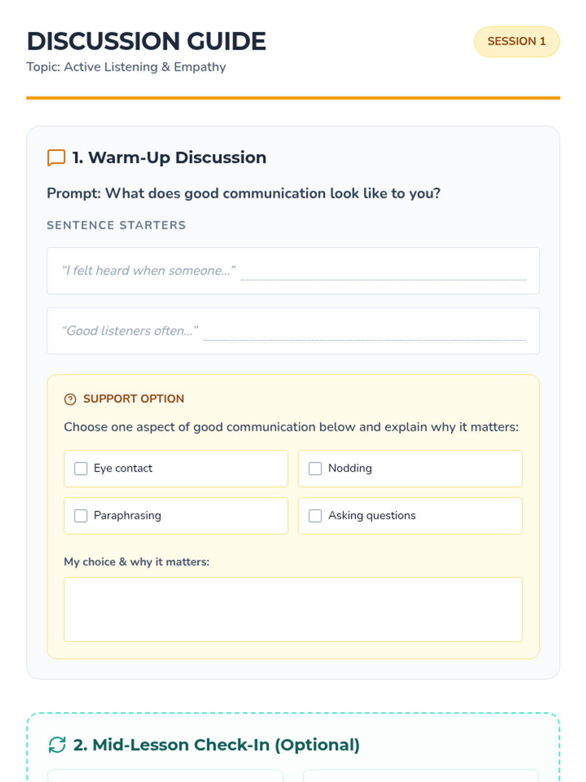 A two-session sequence for high school students in instructional settings to develop positive peer engagement strategies, focusing on active listening, empathy, and respectful feedback.