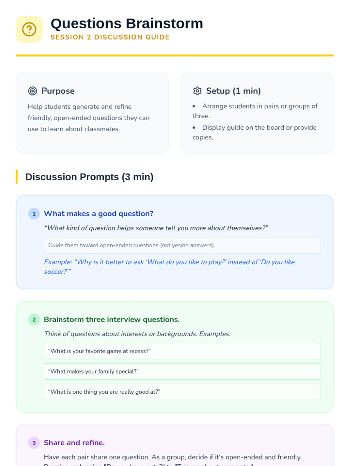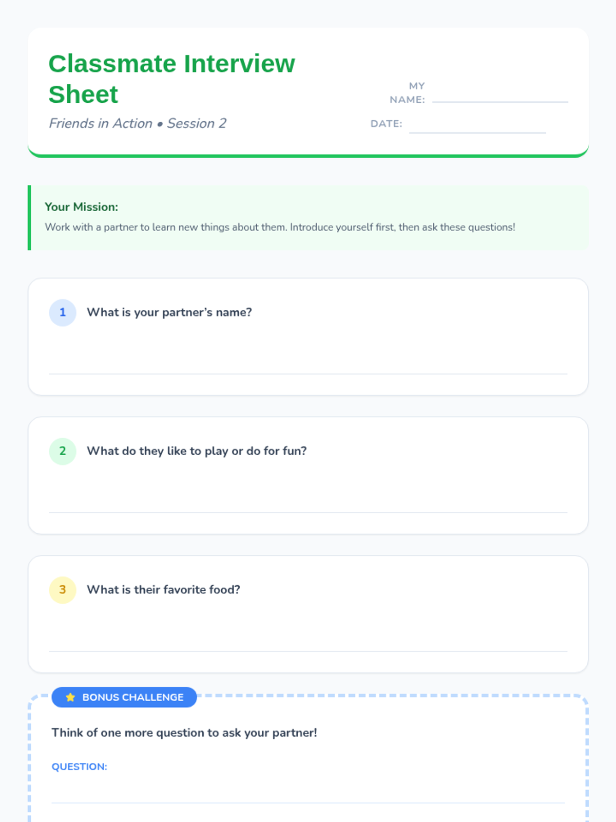 A 10-week mentorship program designed for short, 10-minute sessions focusing on friendship, conflict resolution, and coping skills. The sequence provides structured but flexible activities to build a strong mentor-mentee relationship while developing essential social-emotional skills.
