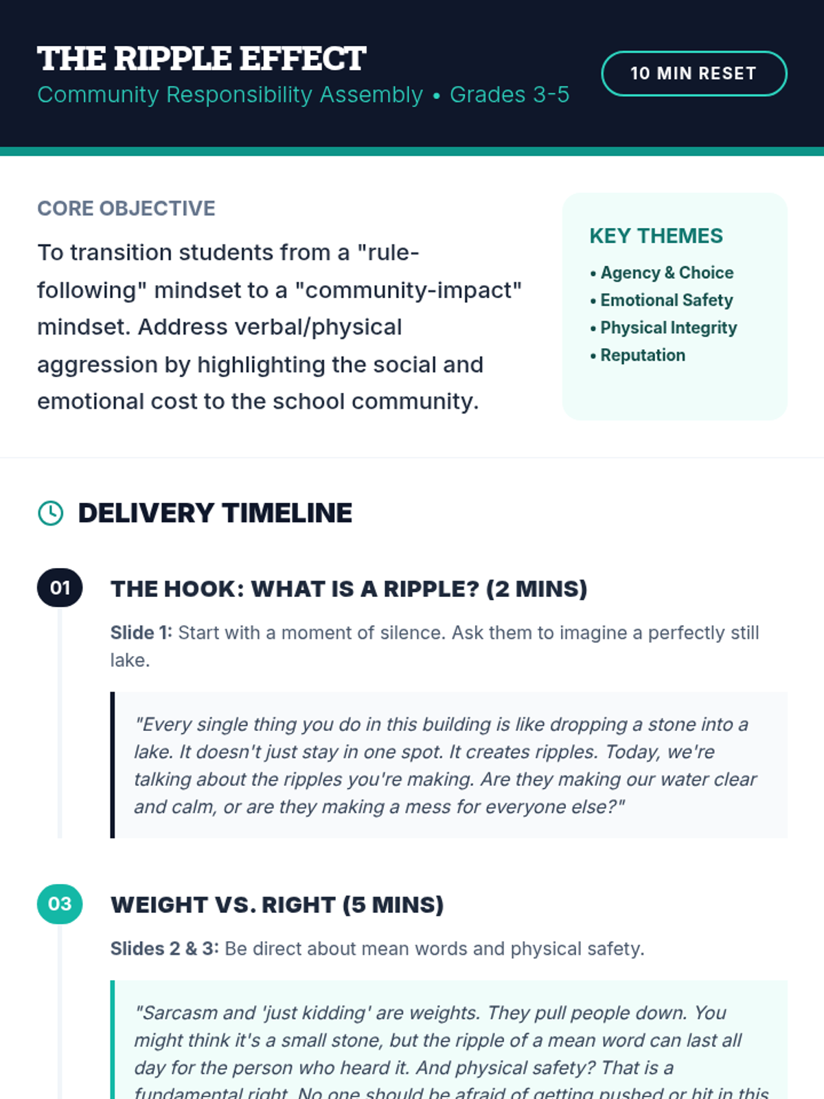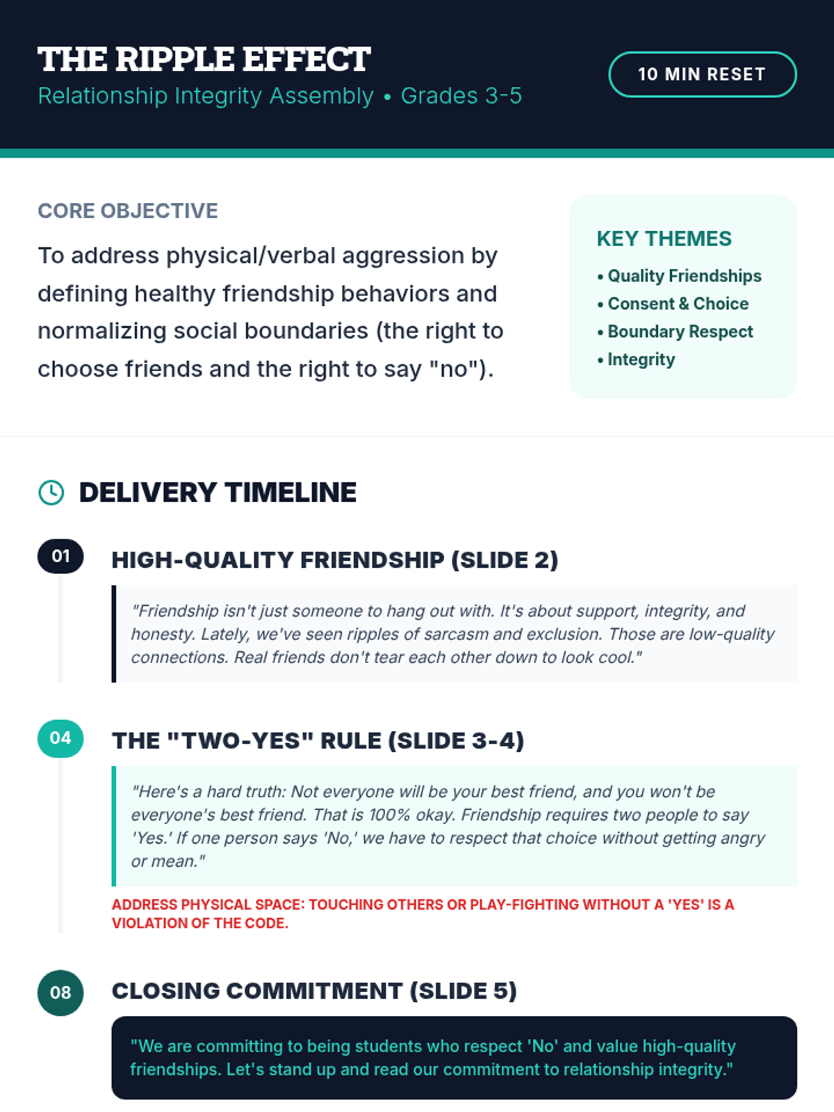 A pair of 10-minute assembly lessons focused on friendship, safety, and community respect for K-2 and 3-5 students, addressing physical and verbal behavior.