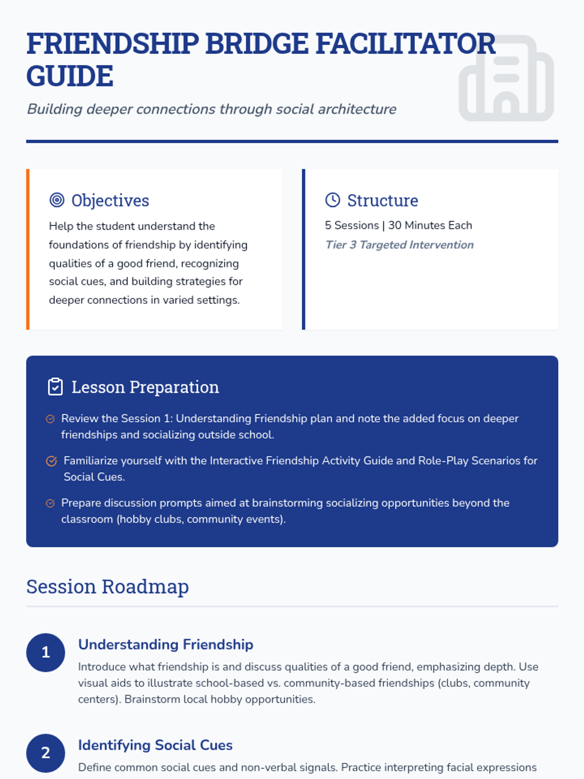A 5-session Tier 3 intervention sequence for 8th-grade students with autism, focusing on building deeper friendships, recognizing social cues, and developing empathy.