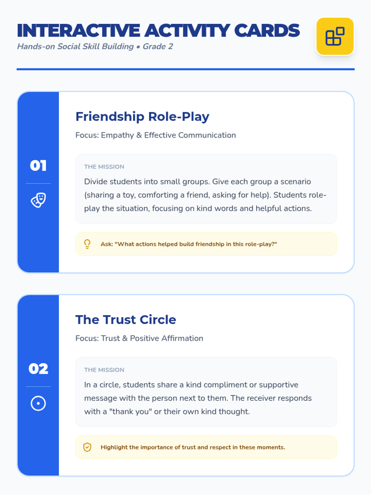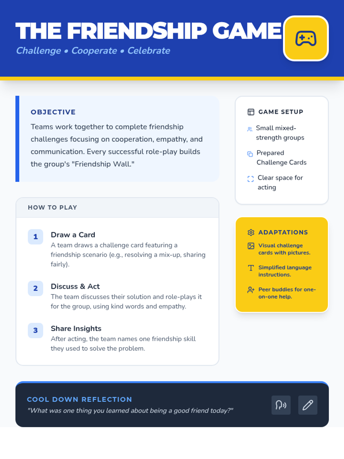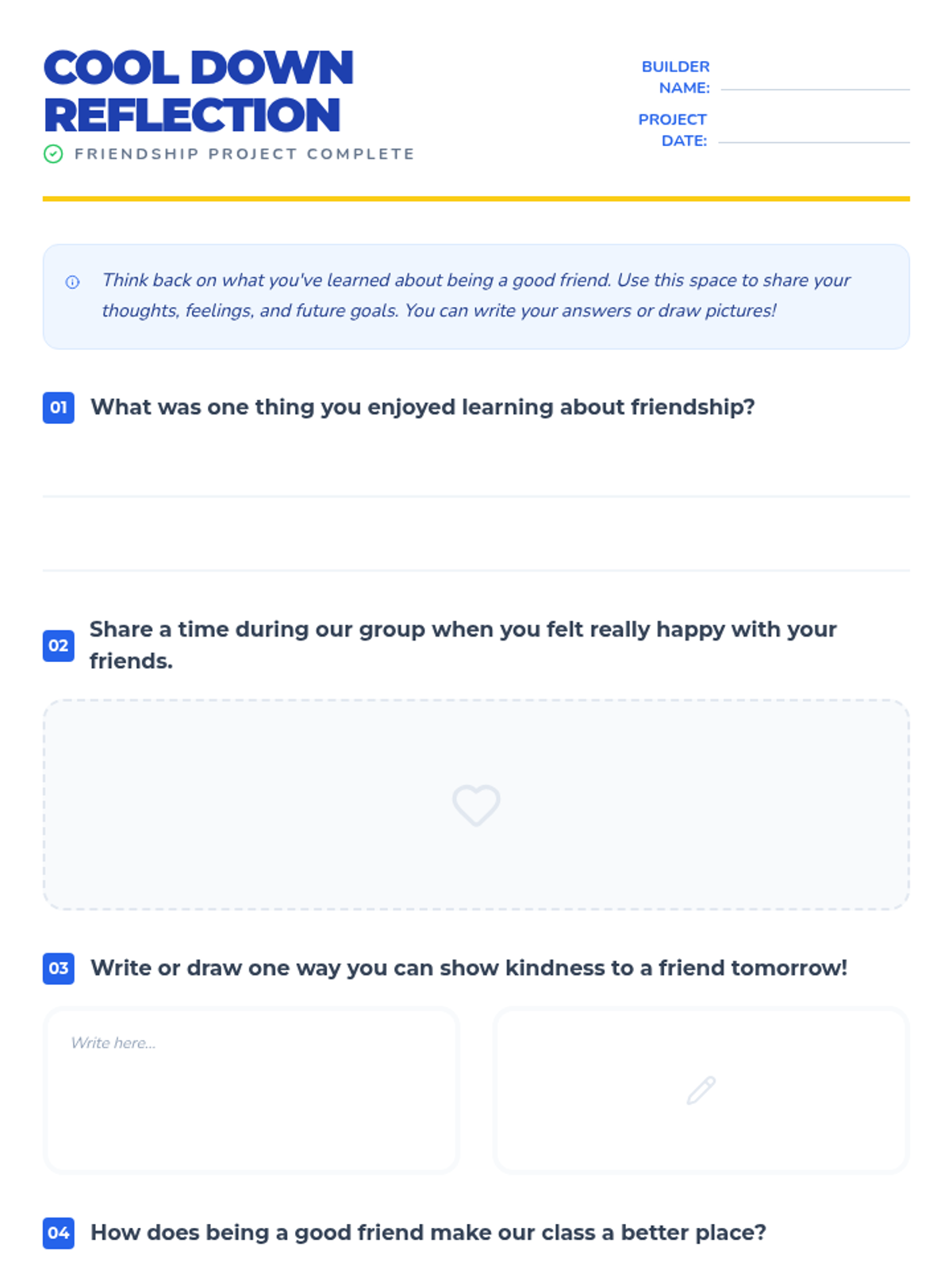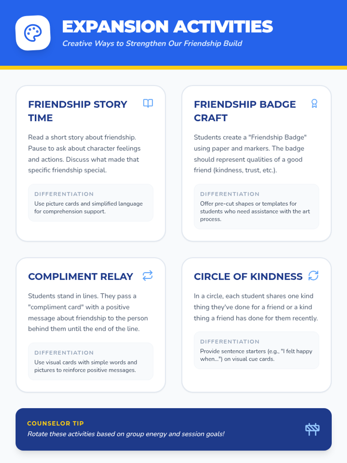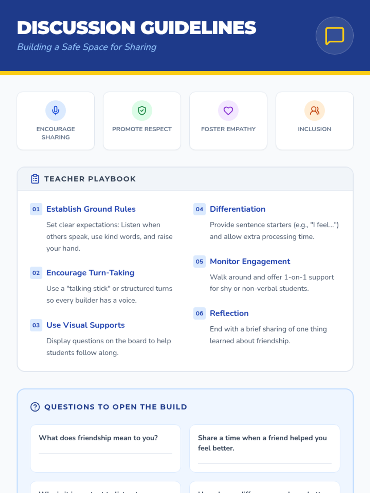 A 5-session small group counseling sequence for 2nd graders designed to build social-emotional skills, communication, empathy, and cooperation through a 'builder' theme. Students engage in hands-on activities like 'Friendship Soup' and cooperative games to foster a supportive classroom community.