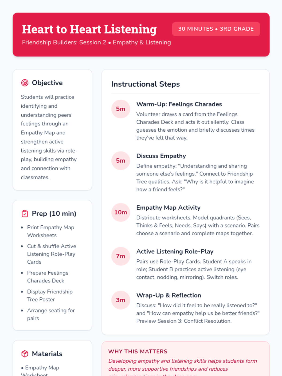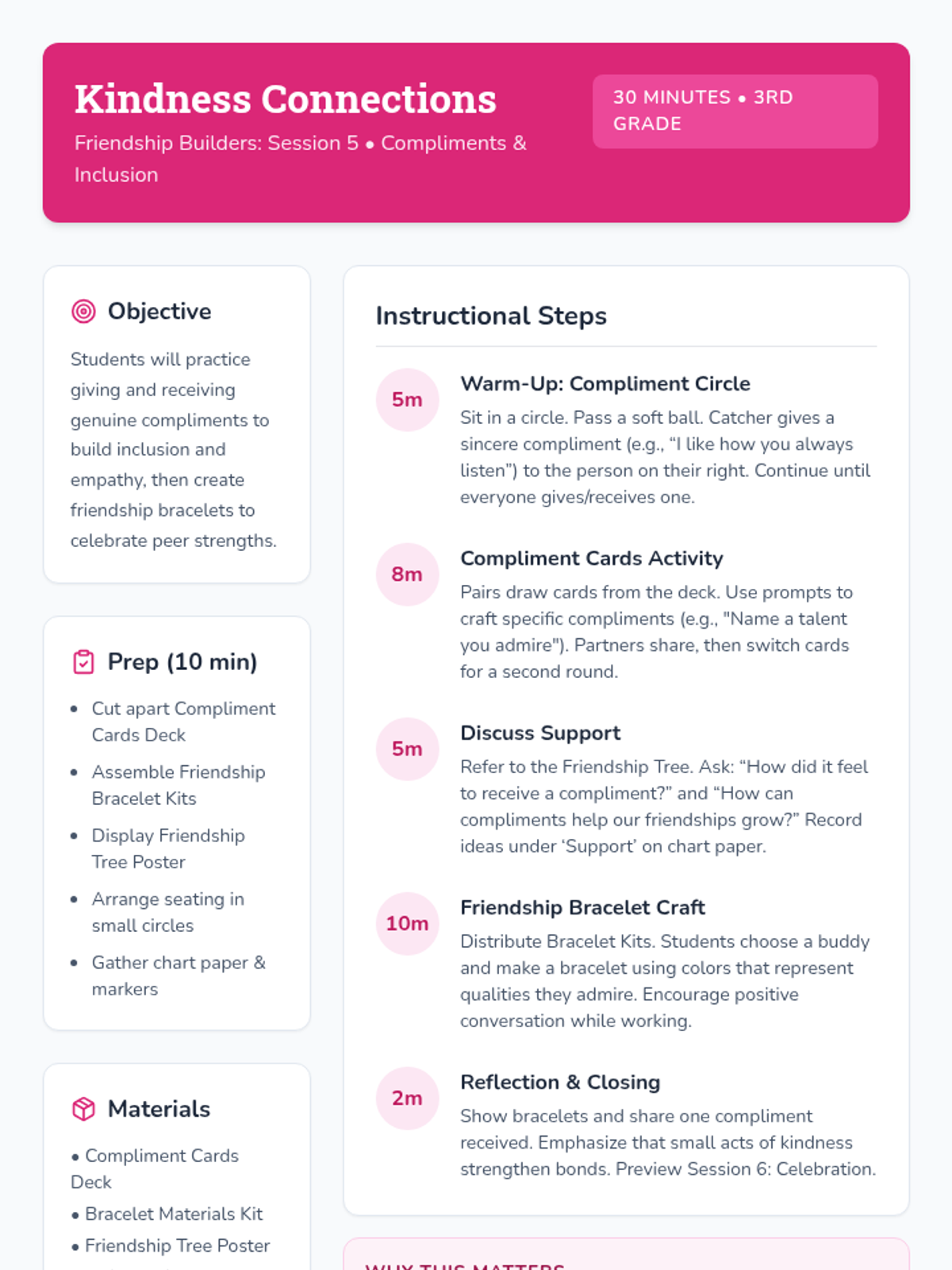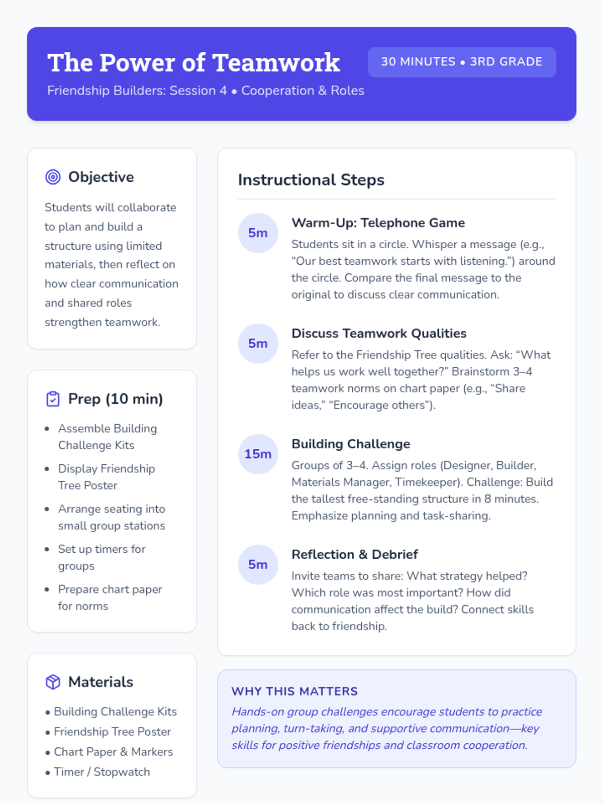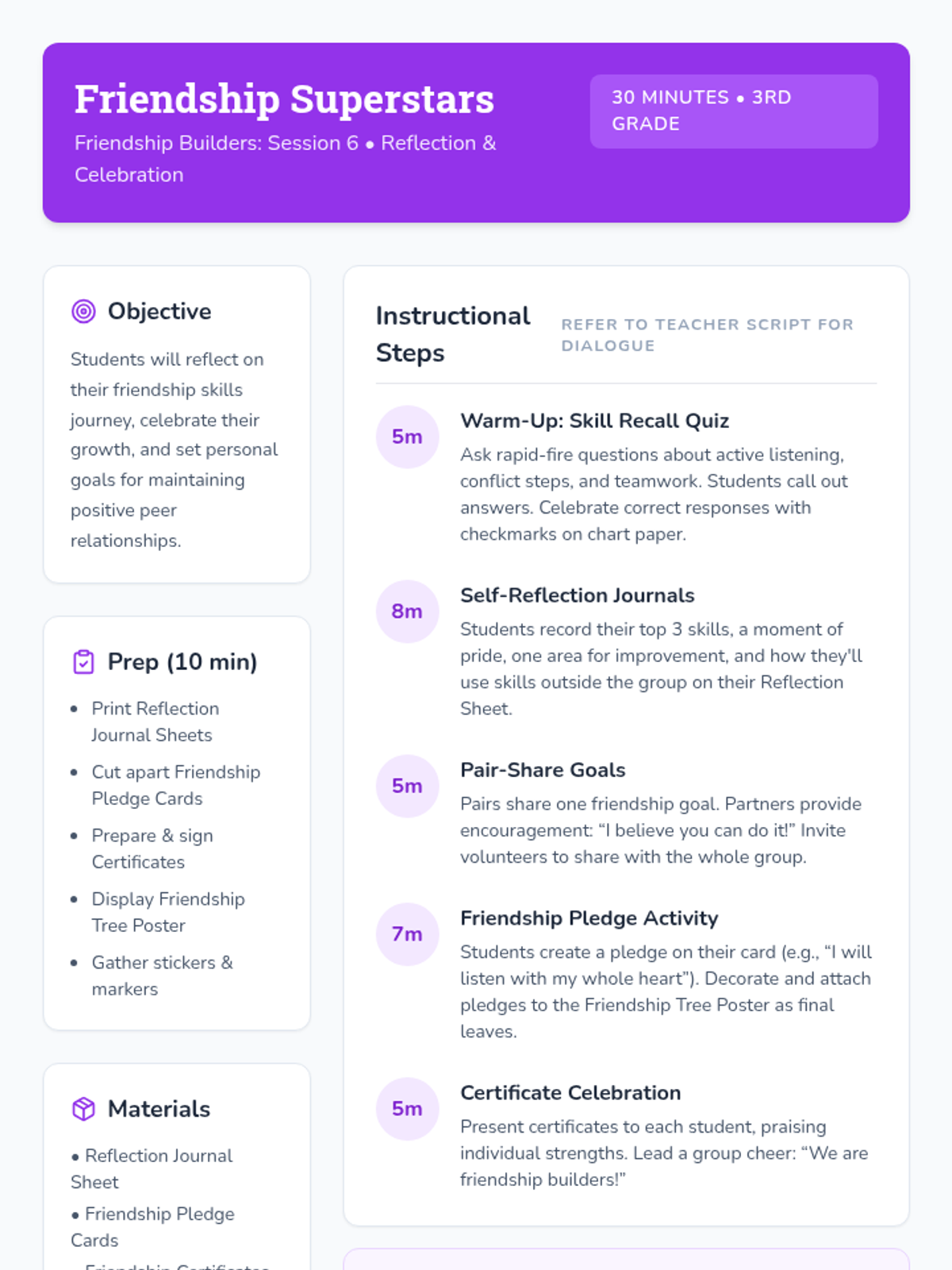 A 6-week Tier 2 group series for 3rd graders focused on building essential friendship skills, including empathy, active listening, conflict resolution, and teamwork, through interactive activities and reflection.