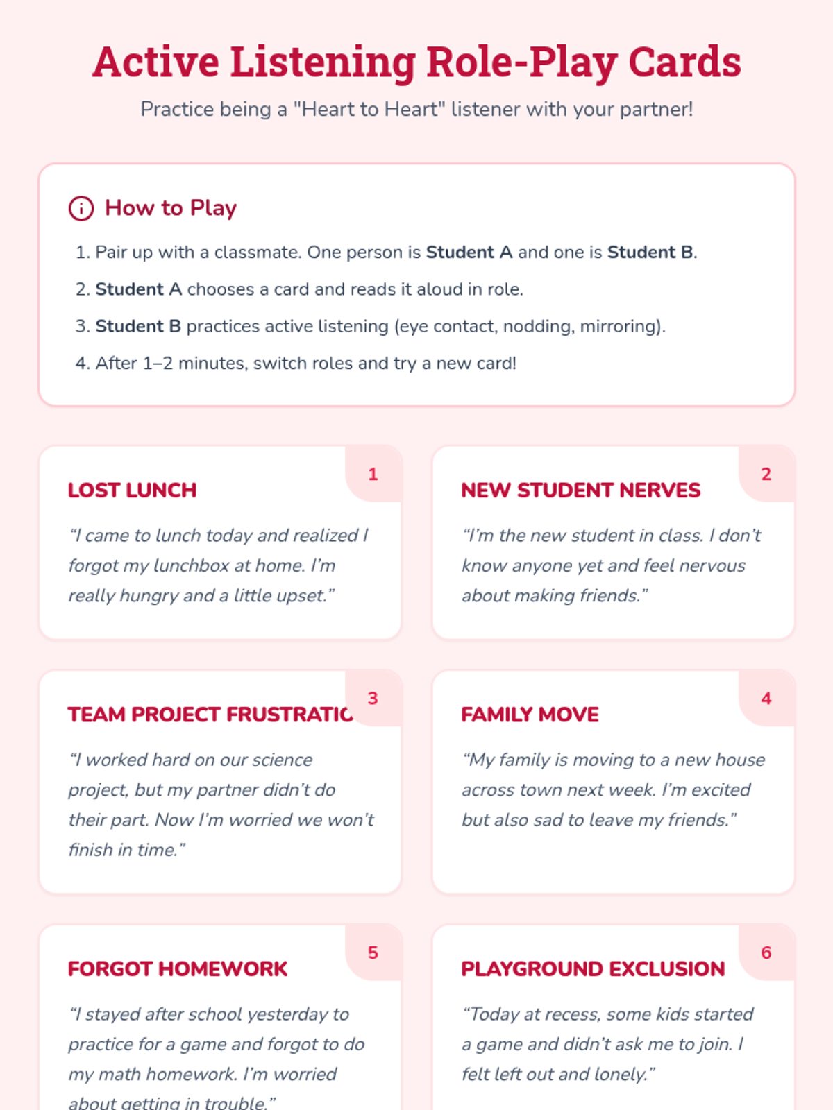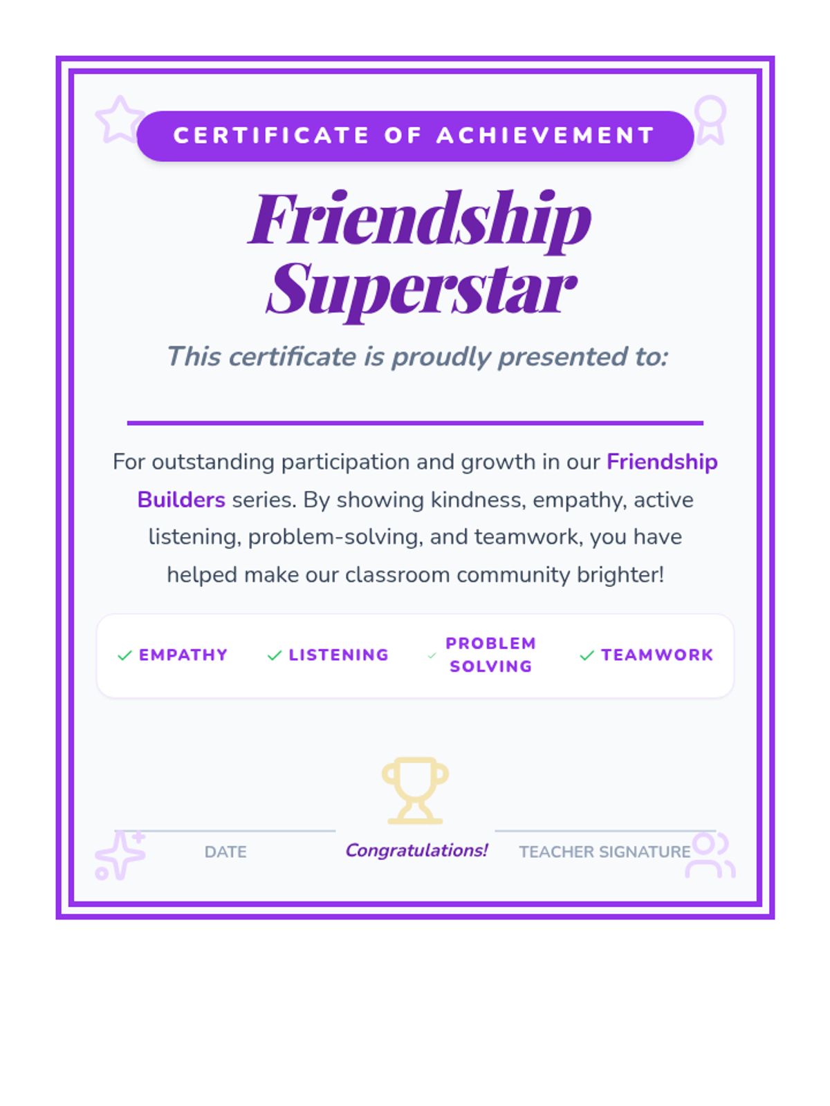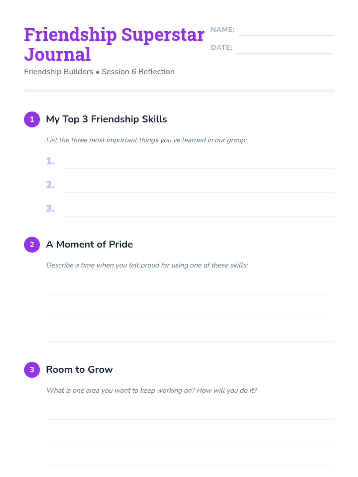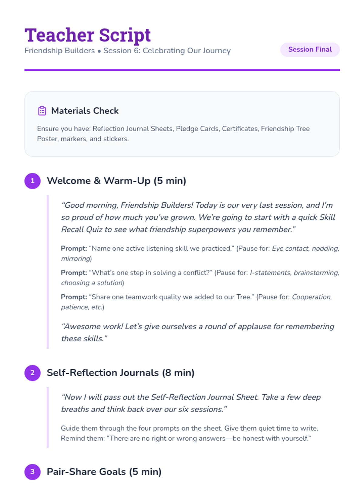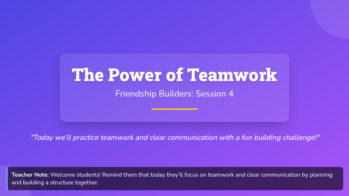 A 6-week Tier 2 group series for 3rd graders focused on building essential friendship skills, including empathy, active listening, conflict resolution, and teamwork, through interactive activities and reflection.