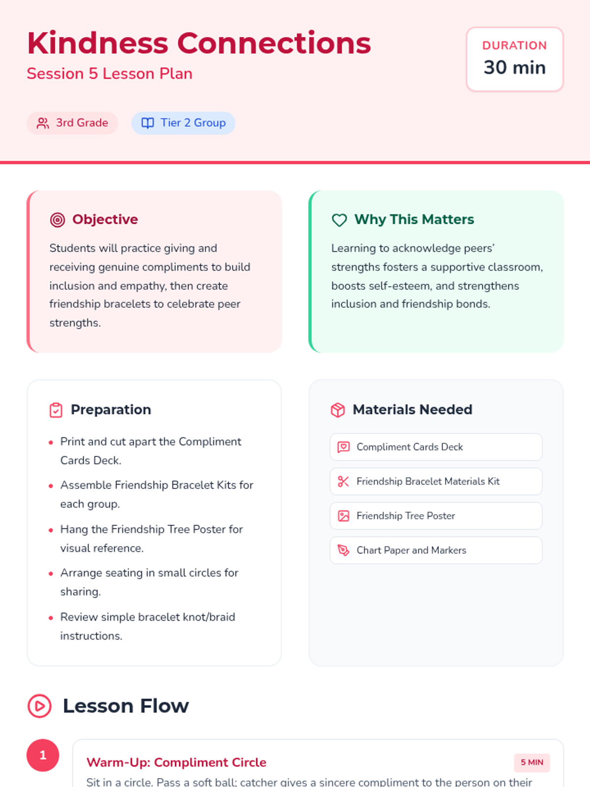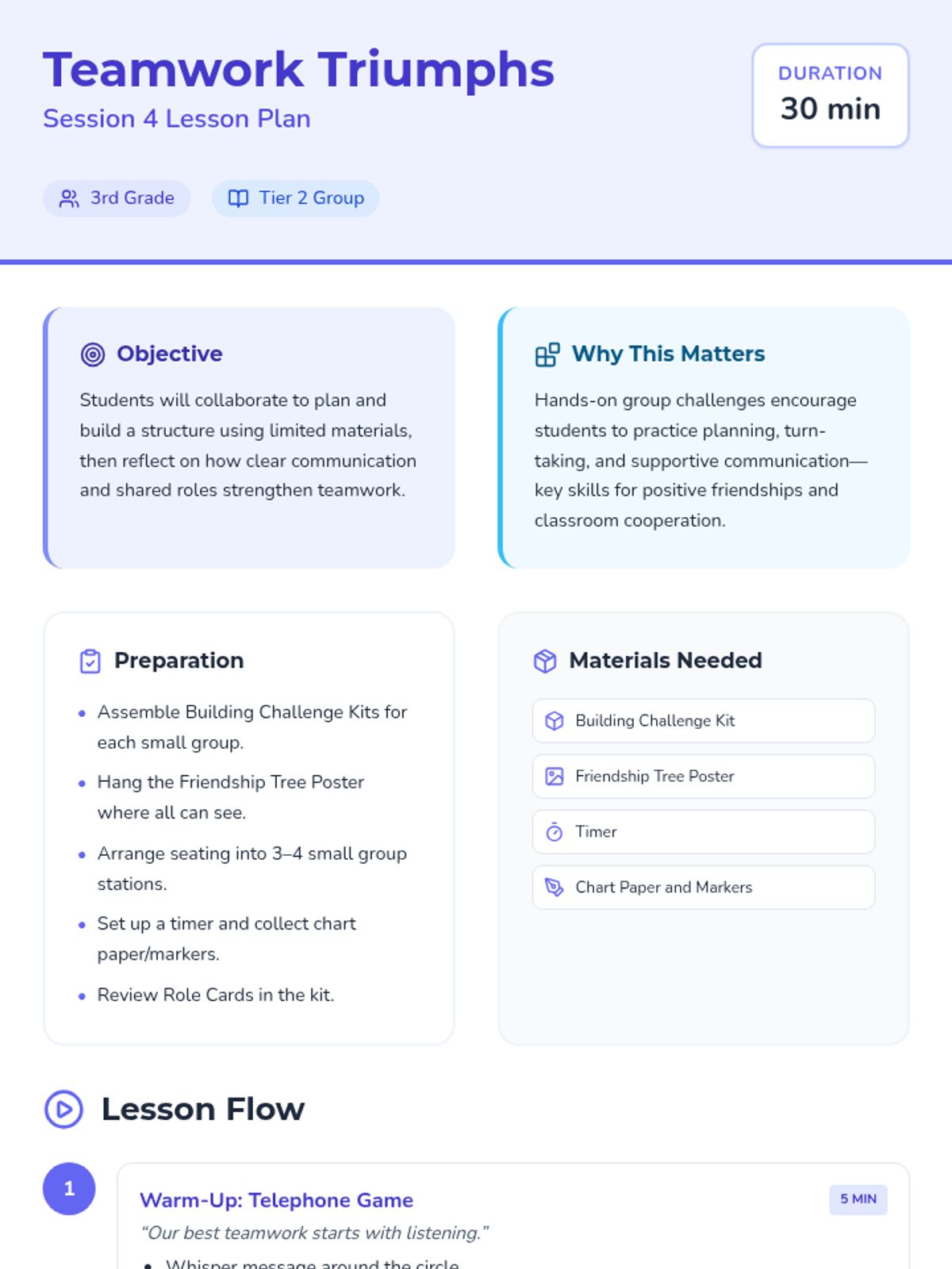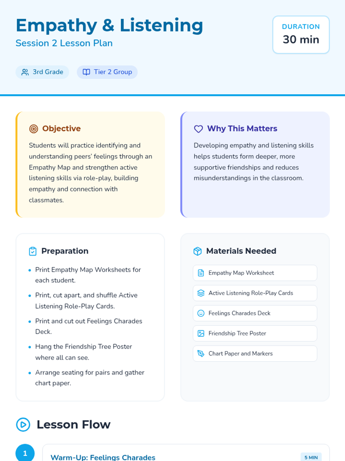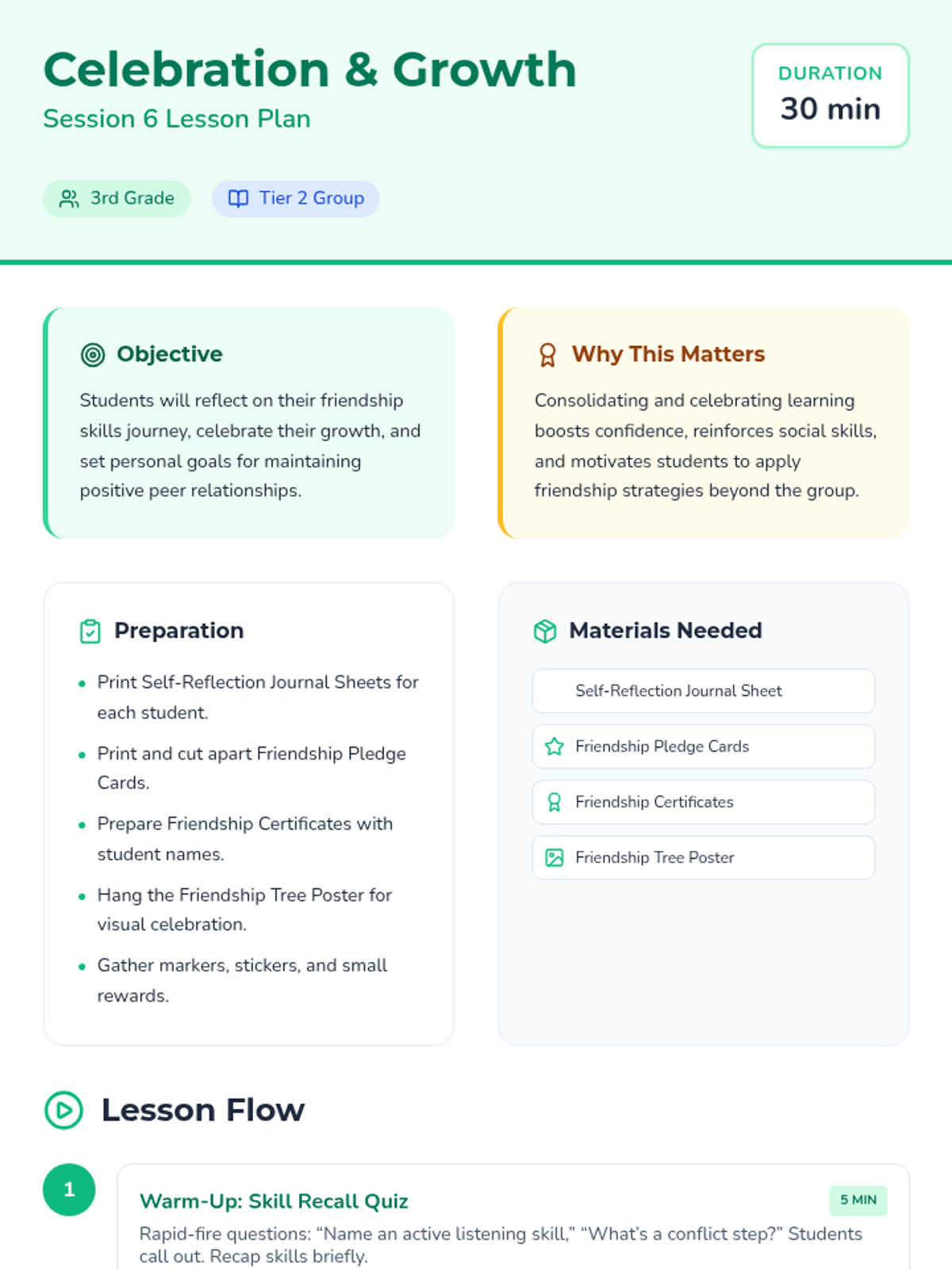 A 6-week Tier 2 social skills group for 3rd graders focused on empathy, communication, conflict resolution, and teamwork using a 'Friendship Tree' theme.