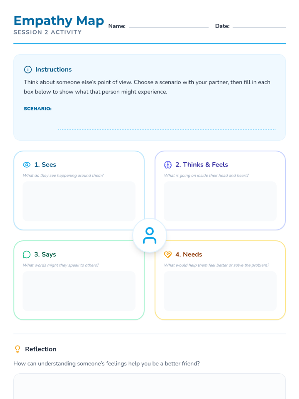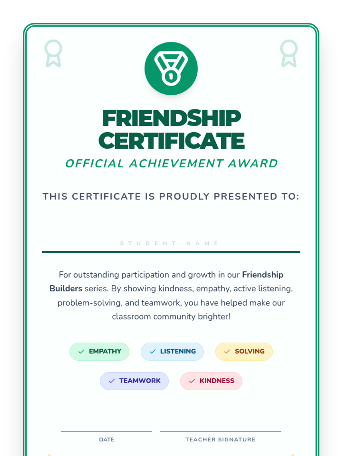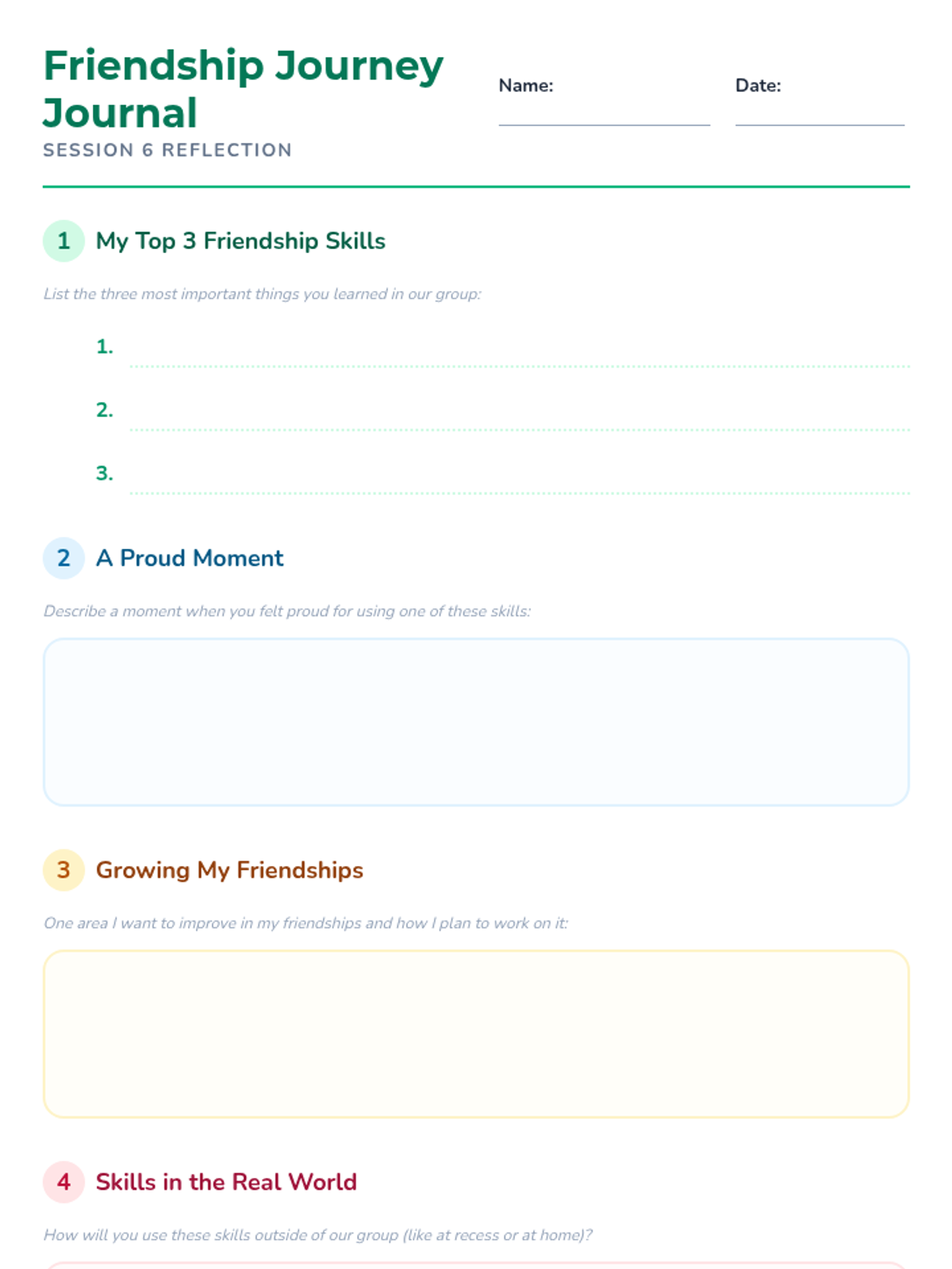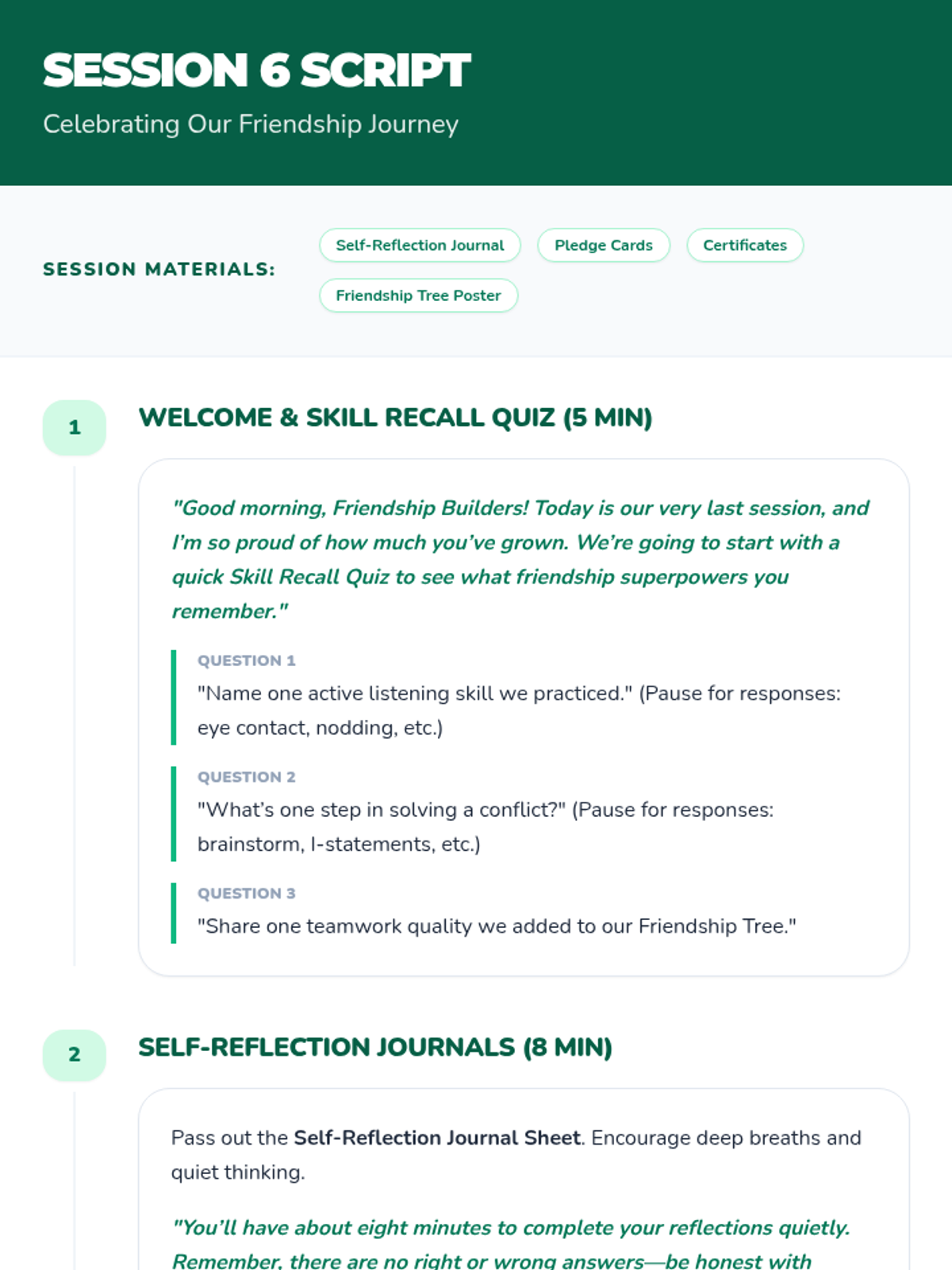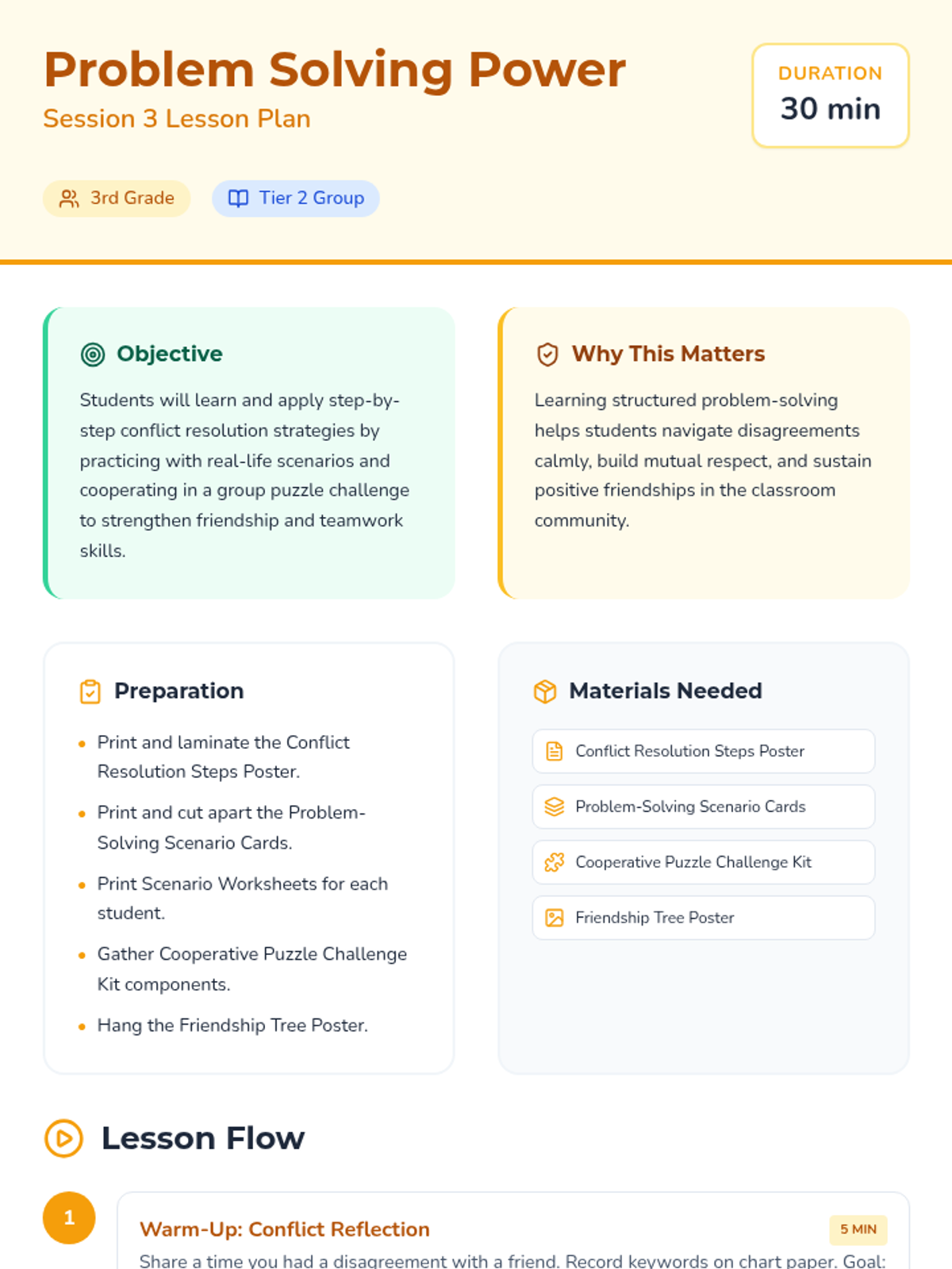 A 6-week Tier 2 social skills group for 3rd graders focused on empathy, communication, conflict resolution, and teamwork using a 'Friendship Tree' theme.