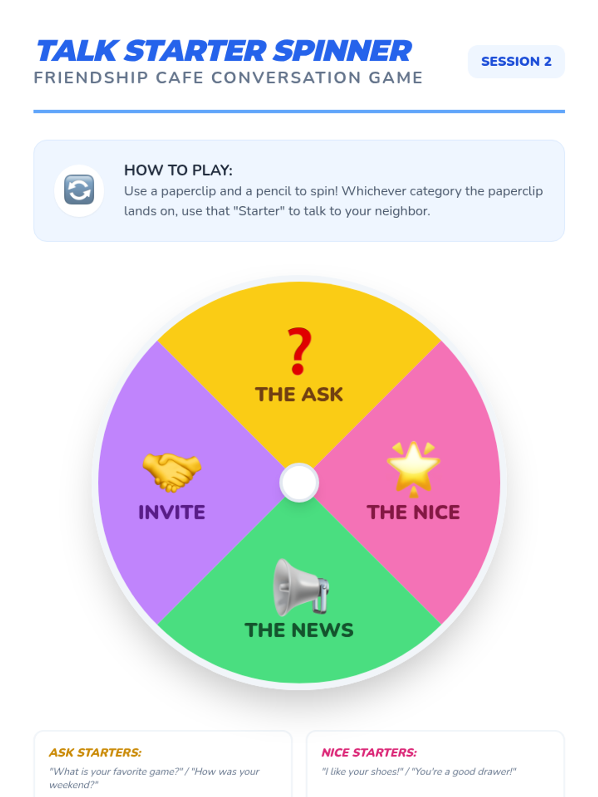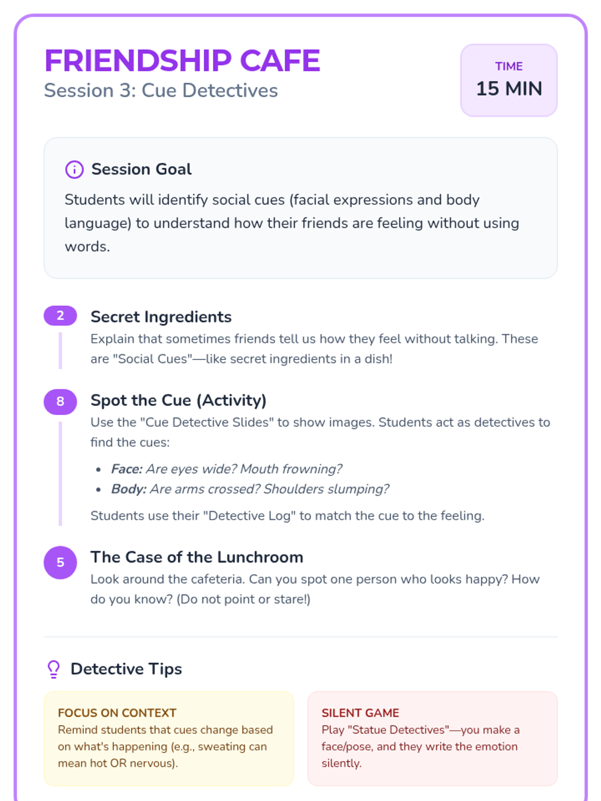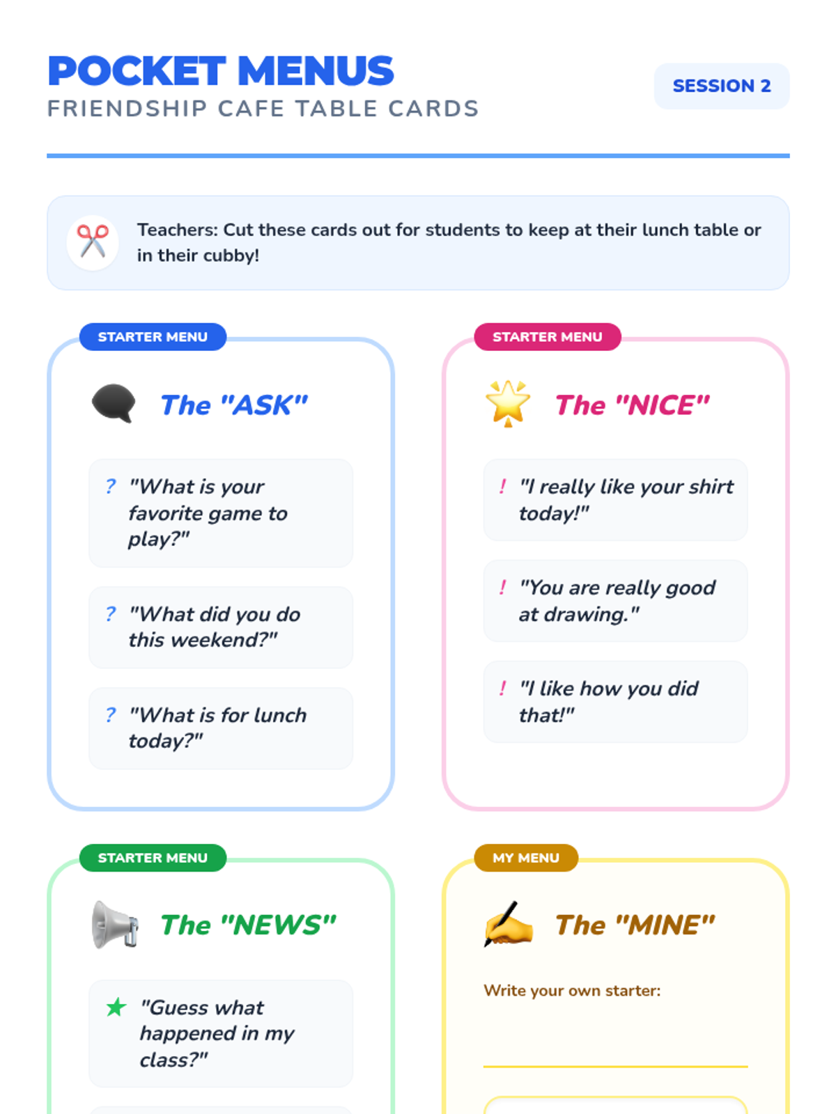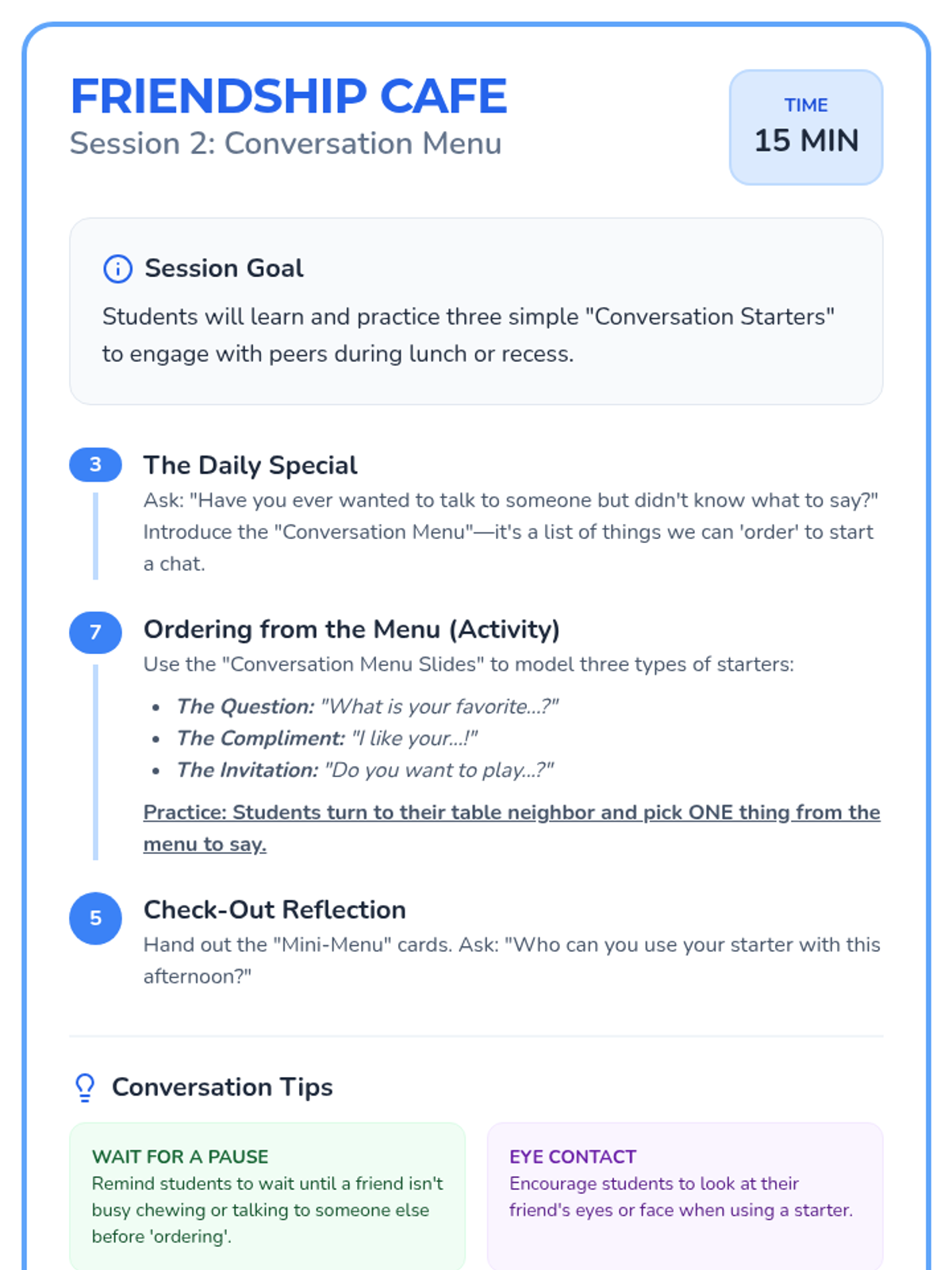 An 8-week lunch group curriculum for 2nd graders focused on building friendship skills through social stories, visual scenarios, and seated sorting activities. The program is designed for 15-minute sessions in a cafeteria or classroom setting.