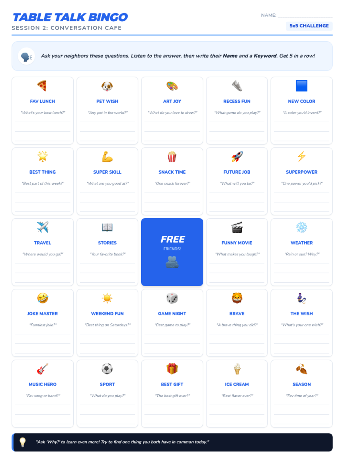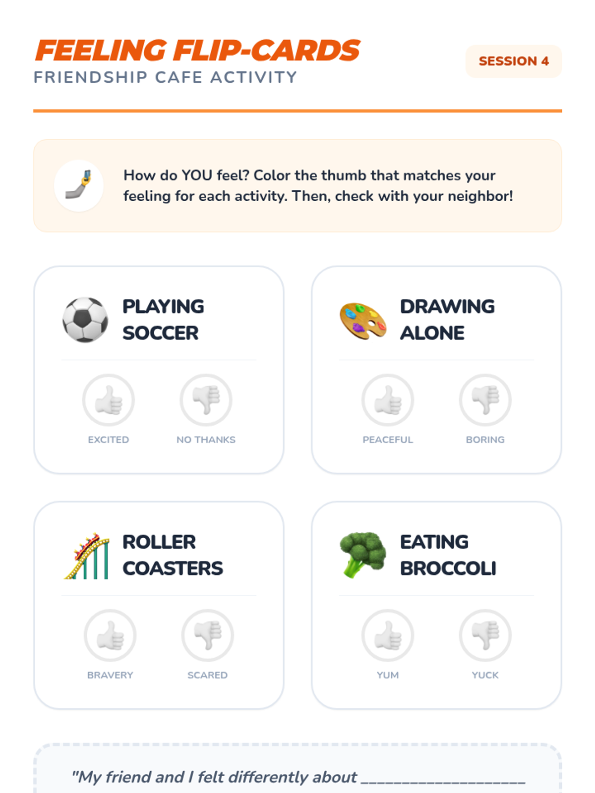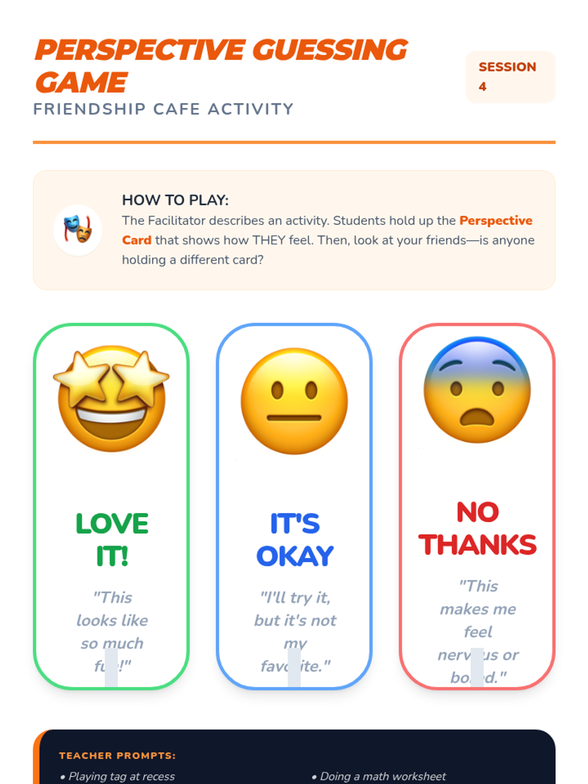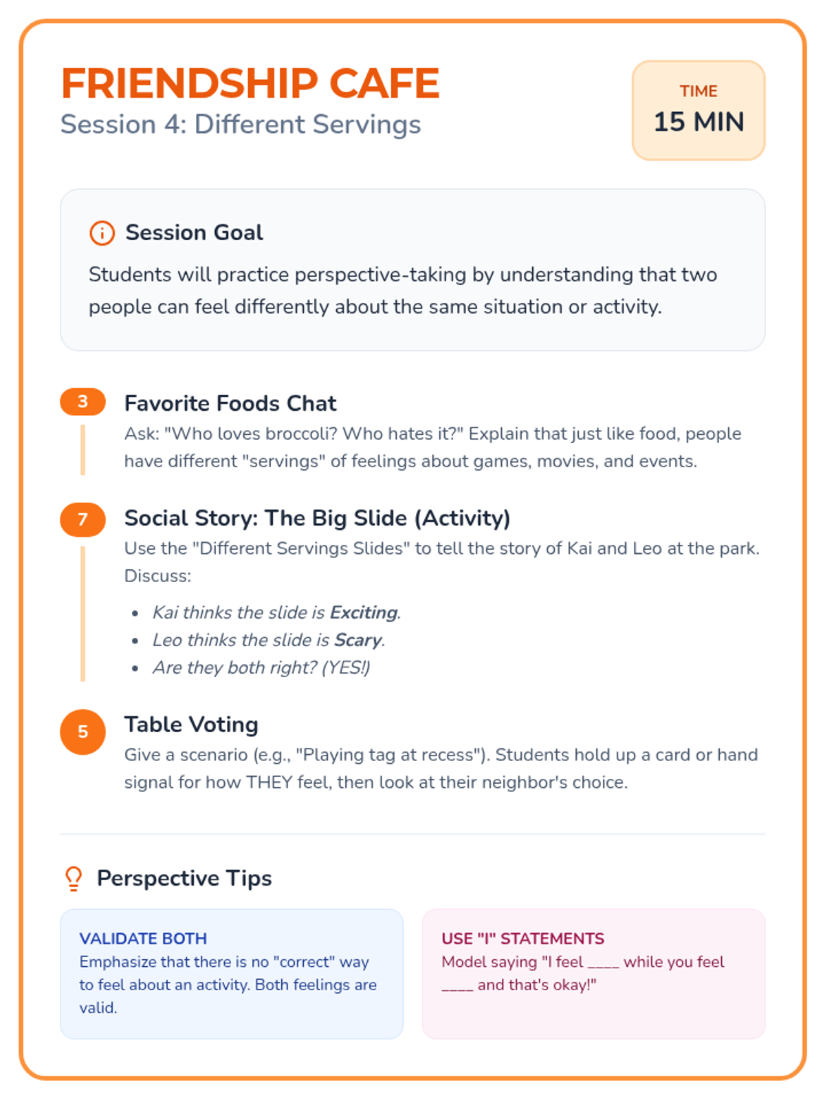 An 8-week lunch group curriculum for 2nd graders focused on building friendship skills through social stories, visual scenarios, and seated sorting activities. The program is designed for 15-minute sessions in a cafeteria or classroom setting.