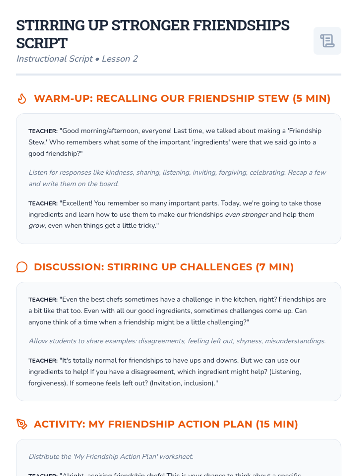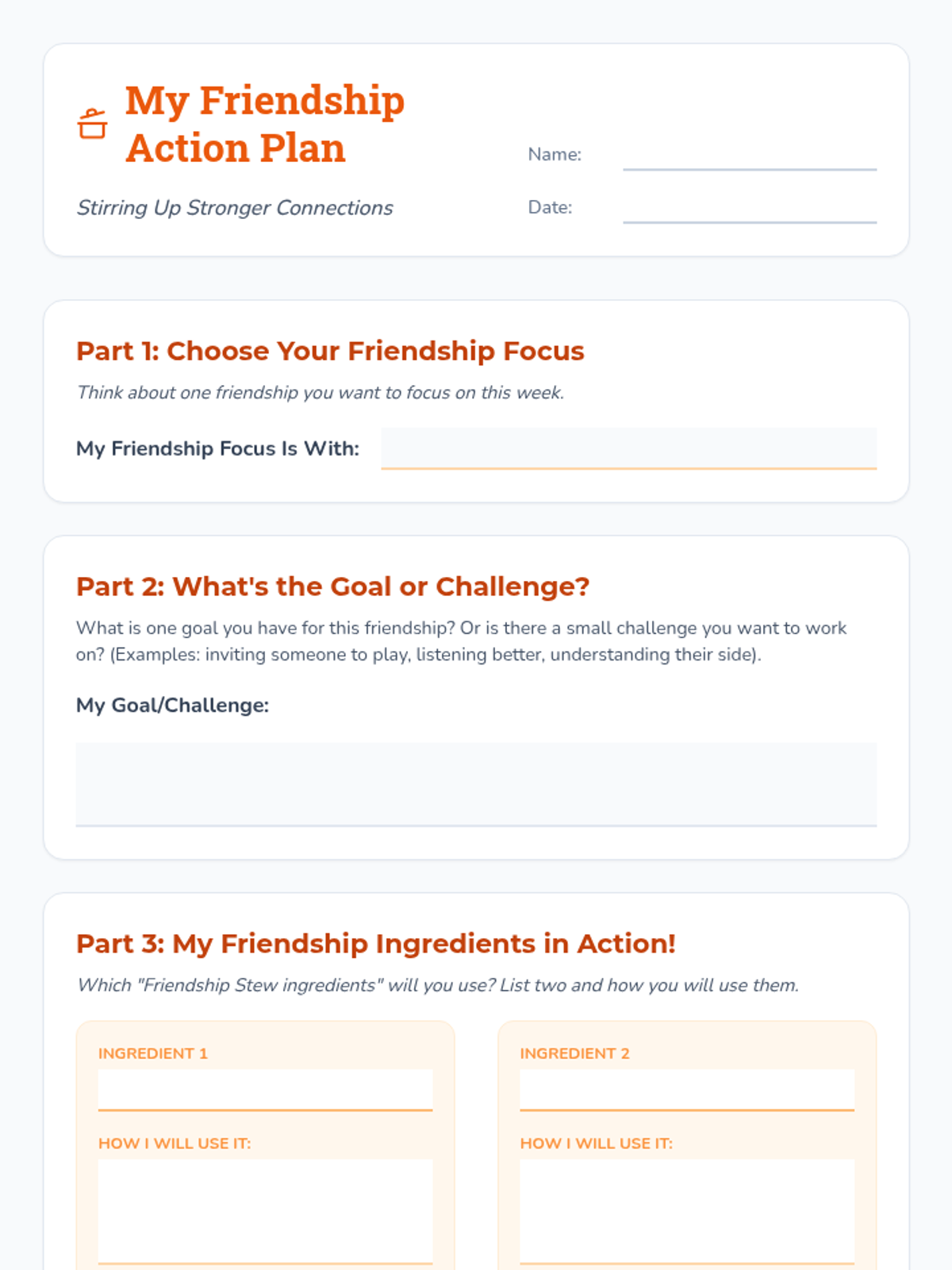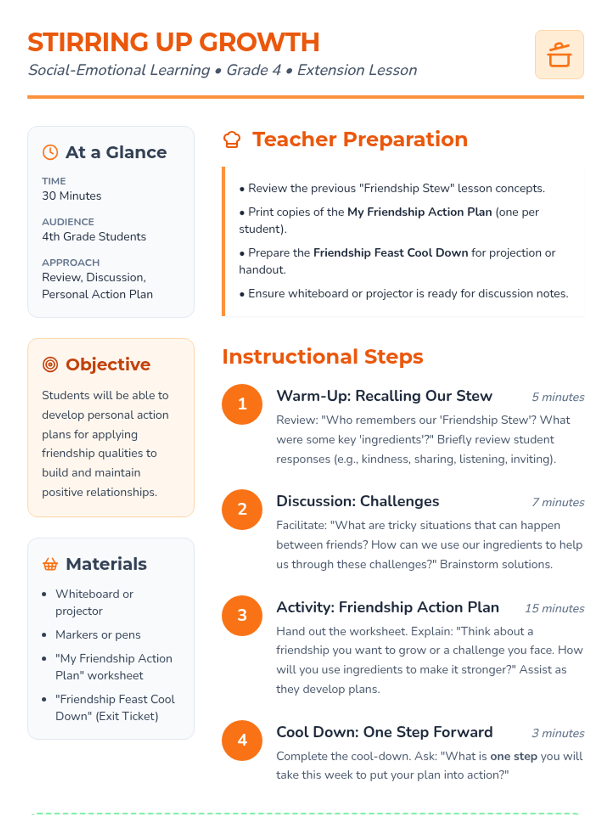 A two-part social-emotional learning sequence for 4th graders focused on identifying friendship qualities and creating actionable plans to strengthen relationships using a 'Friendship Stew' metaphor.