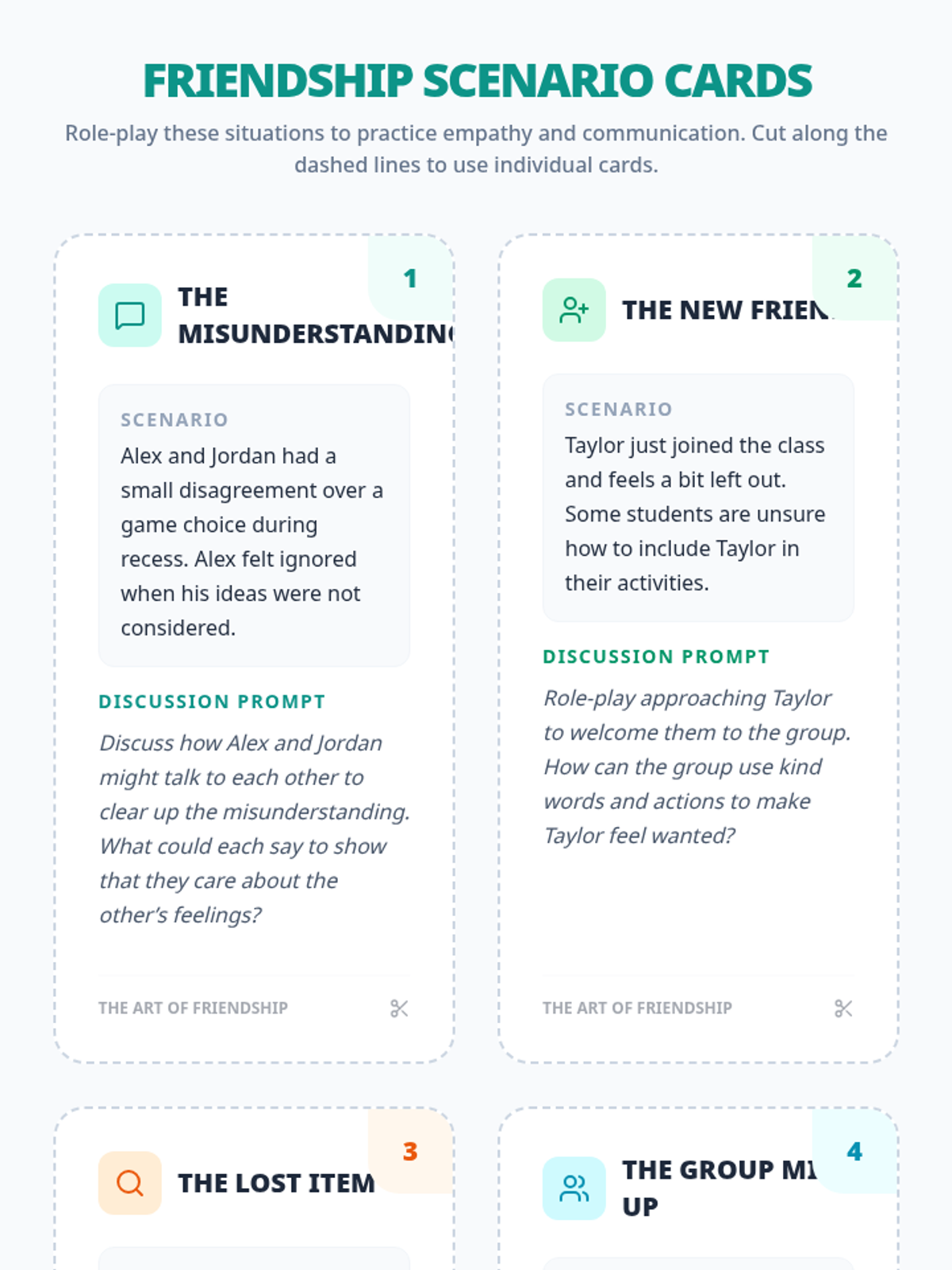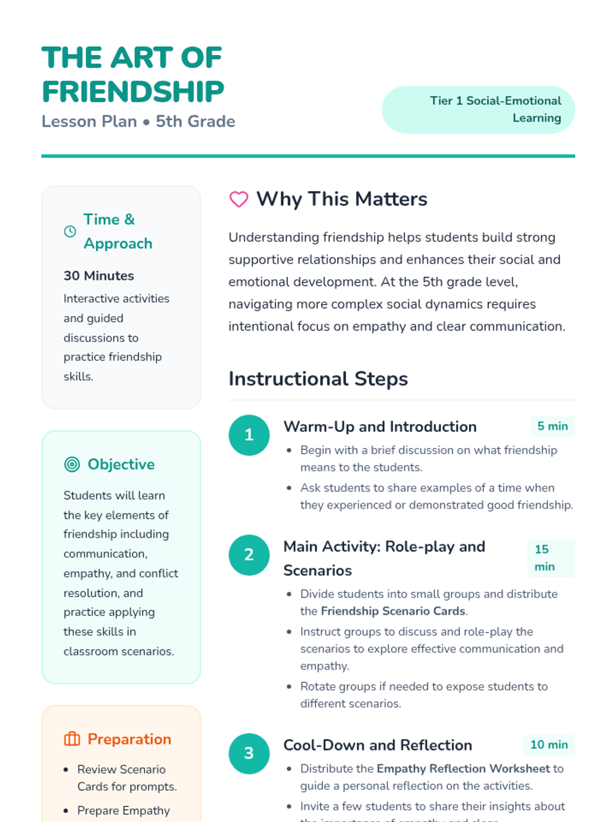 A developmental sequence exploring the fundamentals of friendship, tailored for both older elementary students (5th Grade) and early learners (Pre-K 4). The materials focus on empathy, communication, and the joy of sharing.