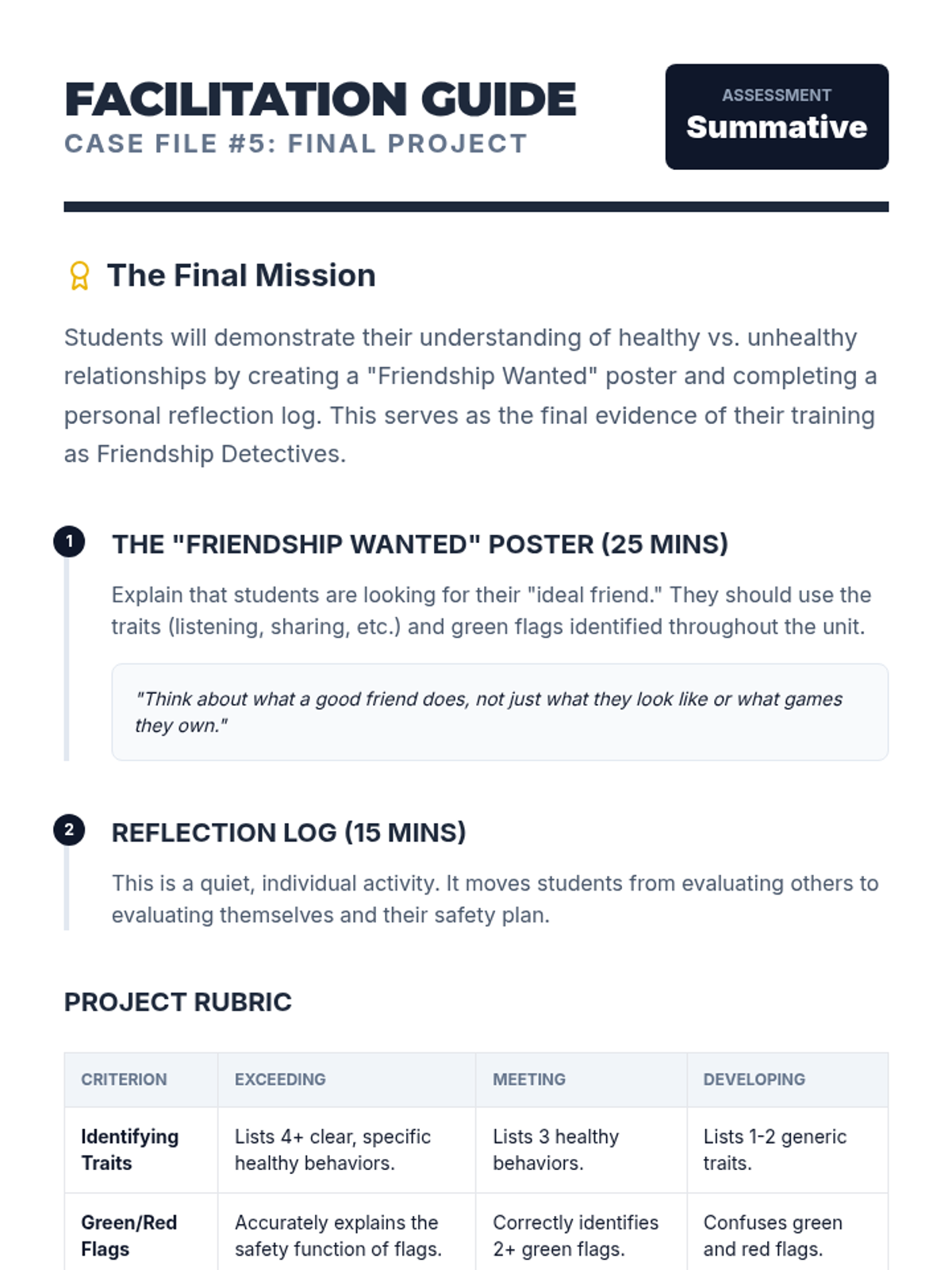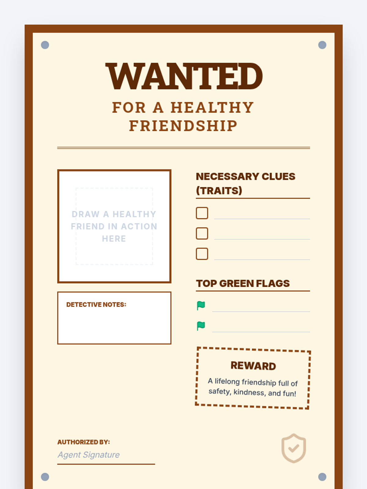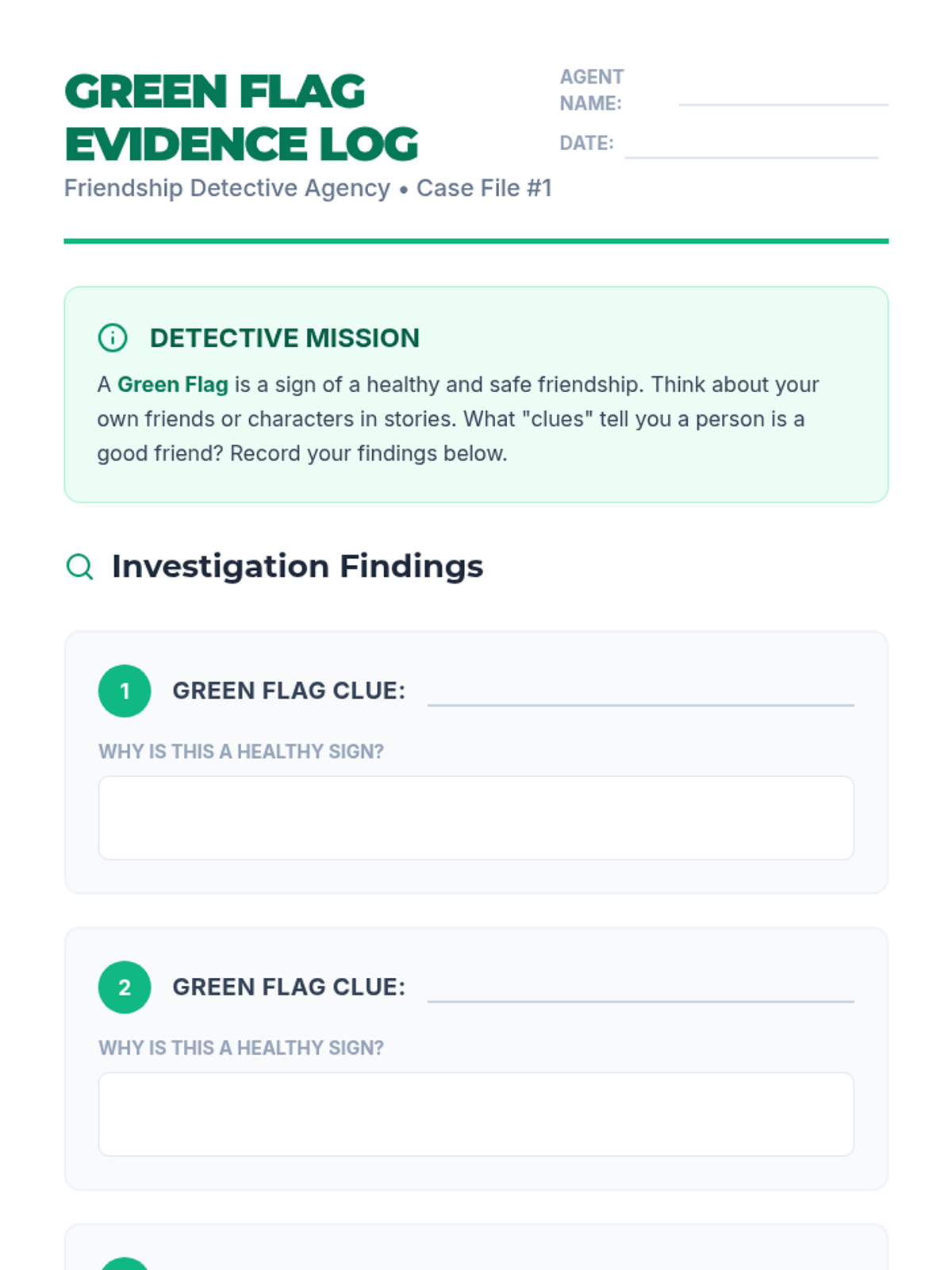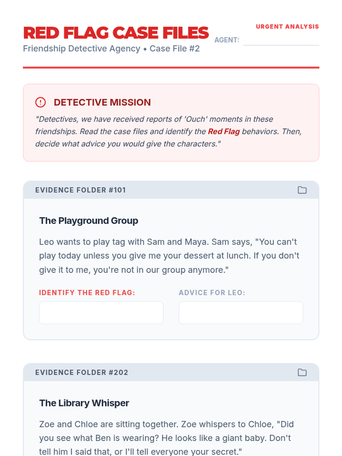 A 5-lesson unit where students become 'Friendship Detectives' to identify healthy and unhealthy relationship dynamics. Using case studies, sorting games, and creative projects, students learn to recognize green and red flags, distinguish between teasing and bullying, and resolve conflicts safely.
