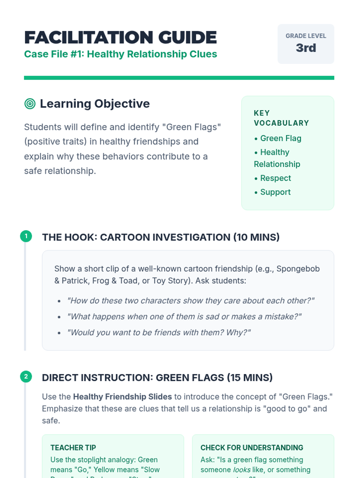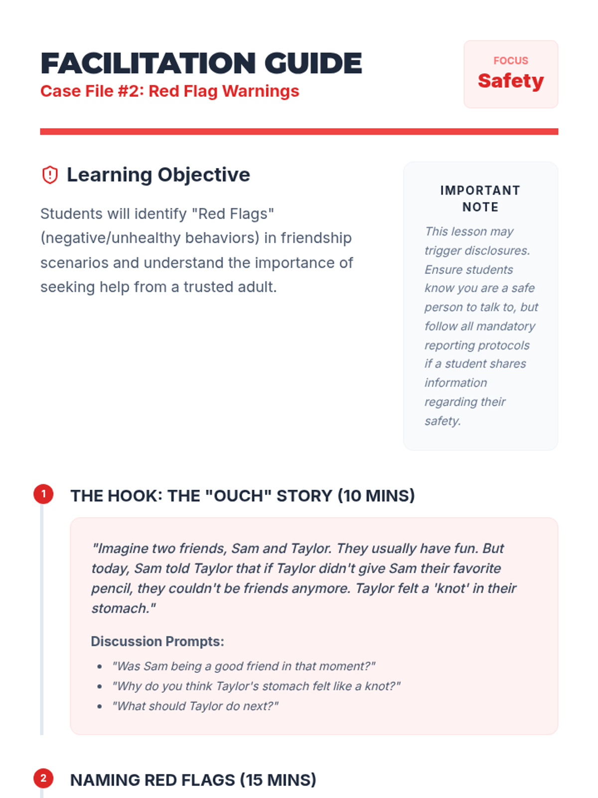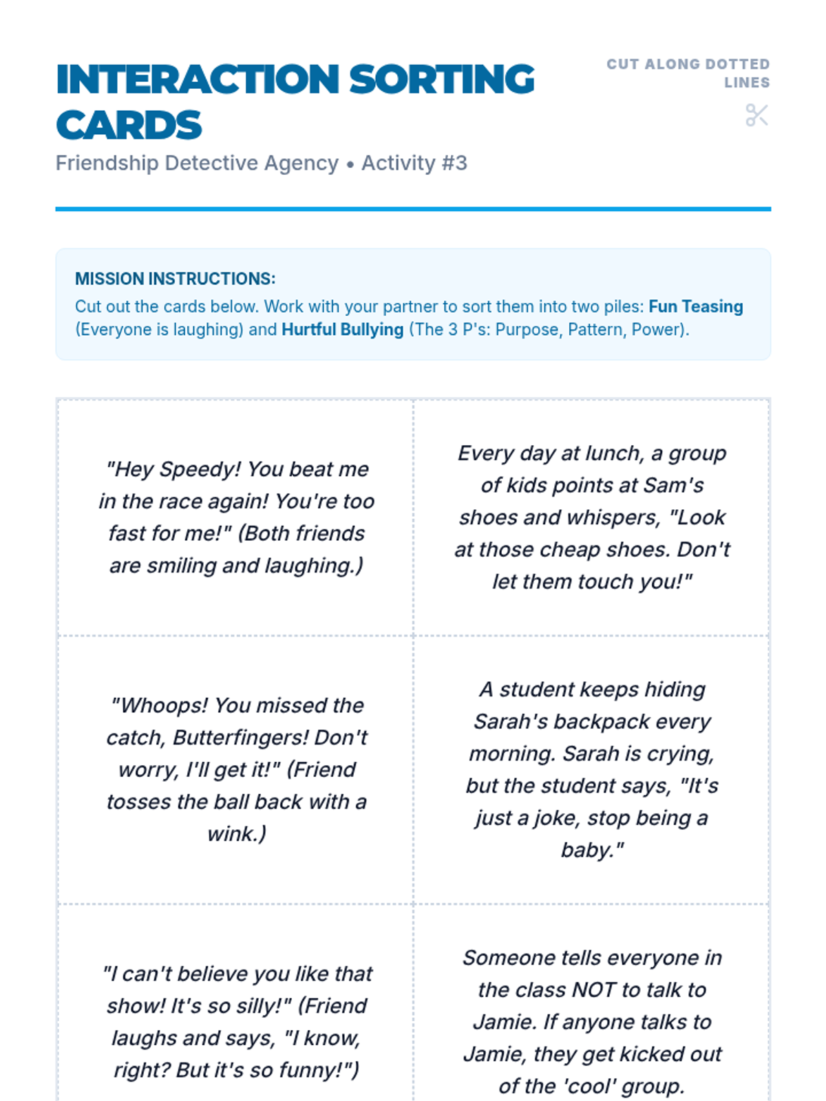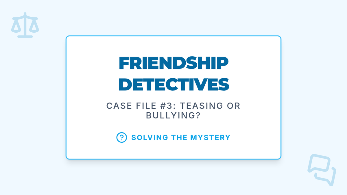 A 5-lesson unit where students become 'Friendship Detectives' to identify healthy and unhealthy relationship dynamics. Using case studies, sorting games, and creative projects, students learn to recognize green and red flags, distinguish between teasing and bullying, and resolve conflicts safely.