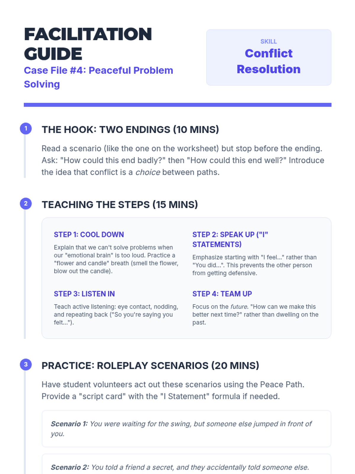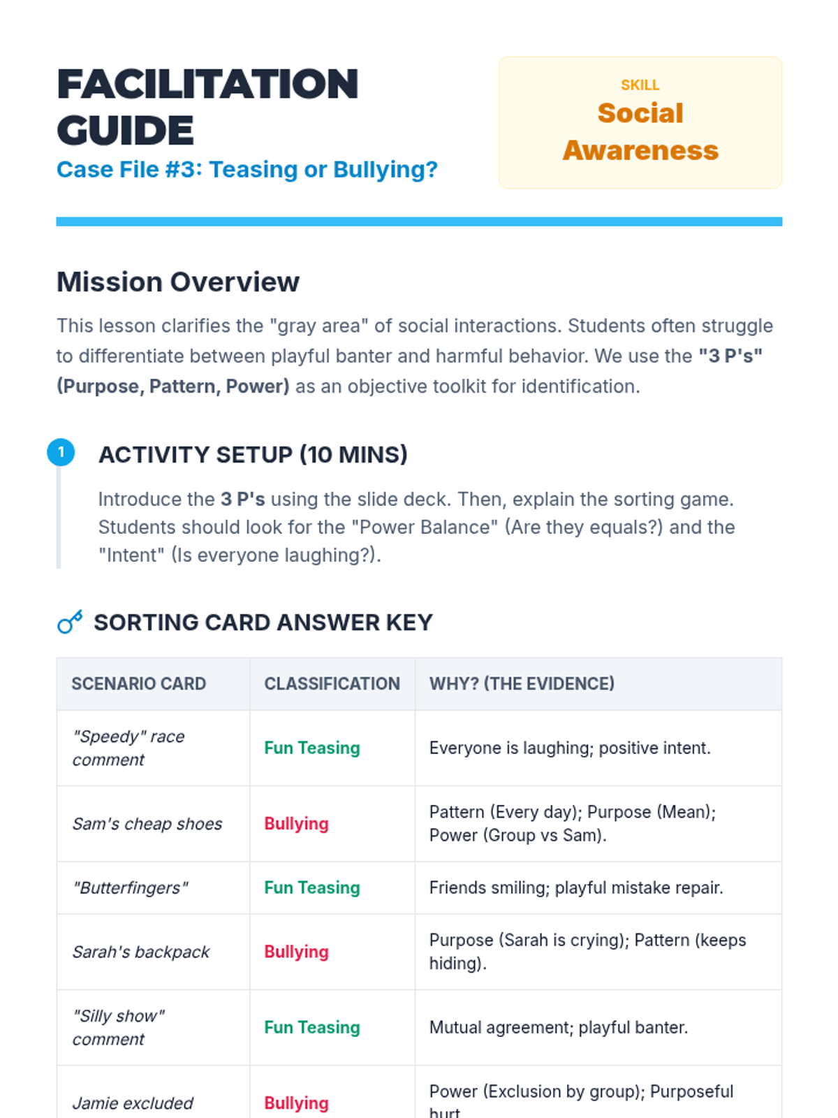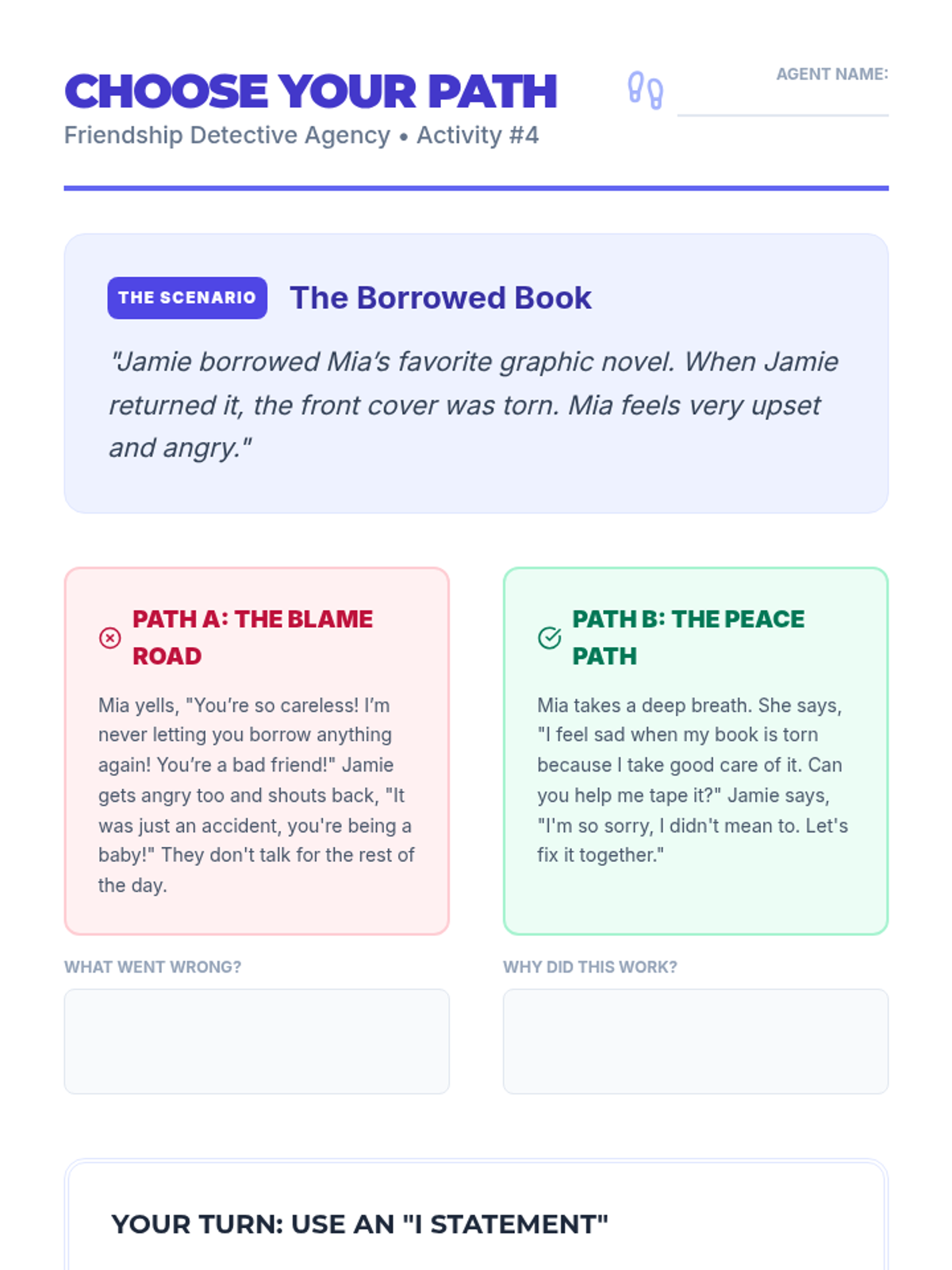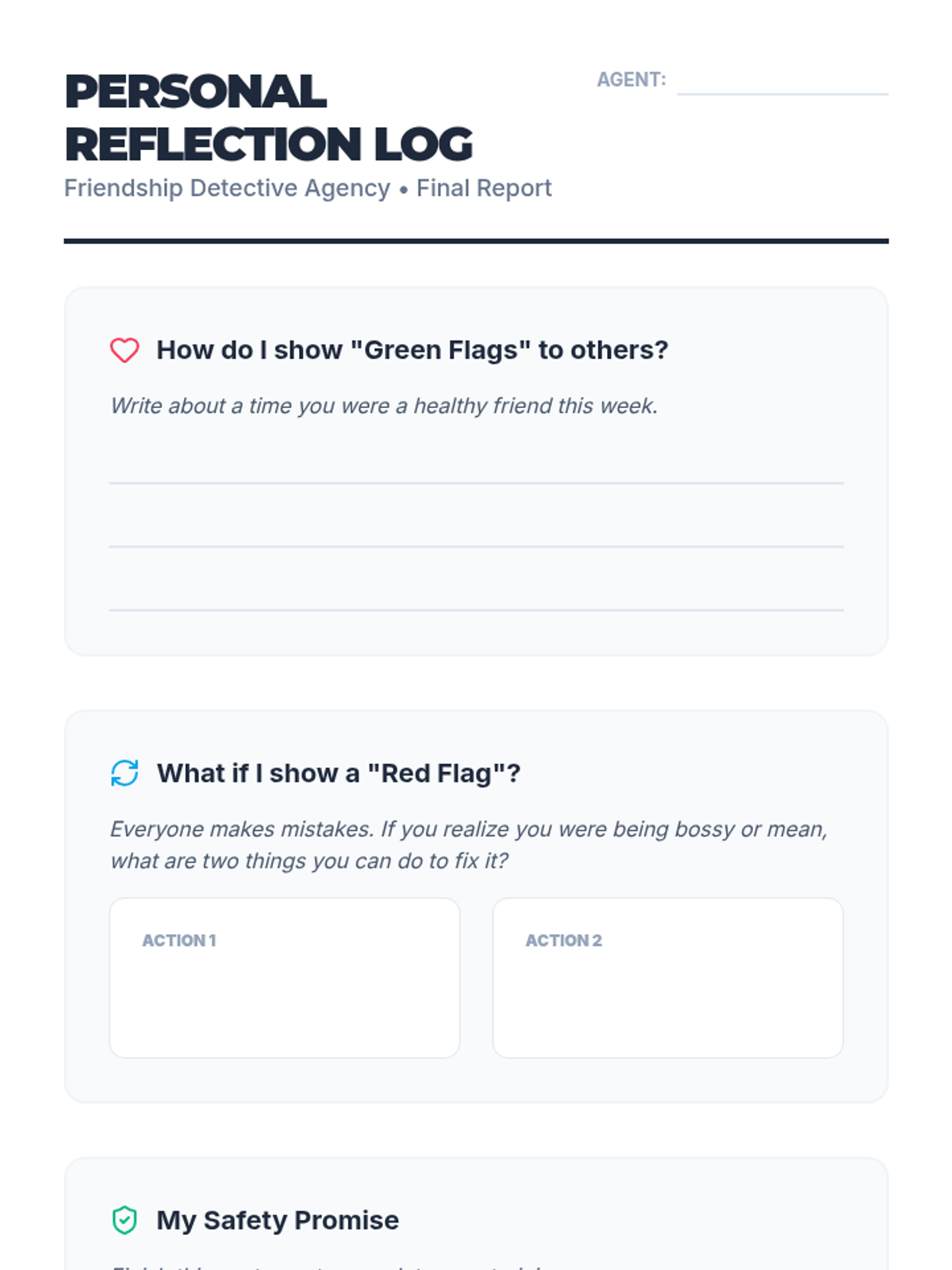 A 5-lesson unit where students become 'Friendship Detectives' to identify healthy and unhealthy relationship dynamics. Using case studies, sorting games, and creative projects, students learn to recognize green and red flags, distinguish between teasing and bullying, and resolve conflicts safely.