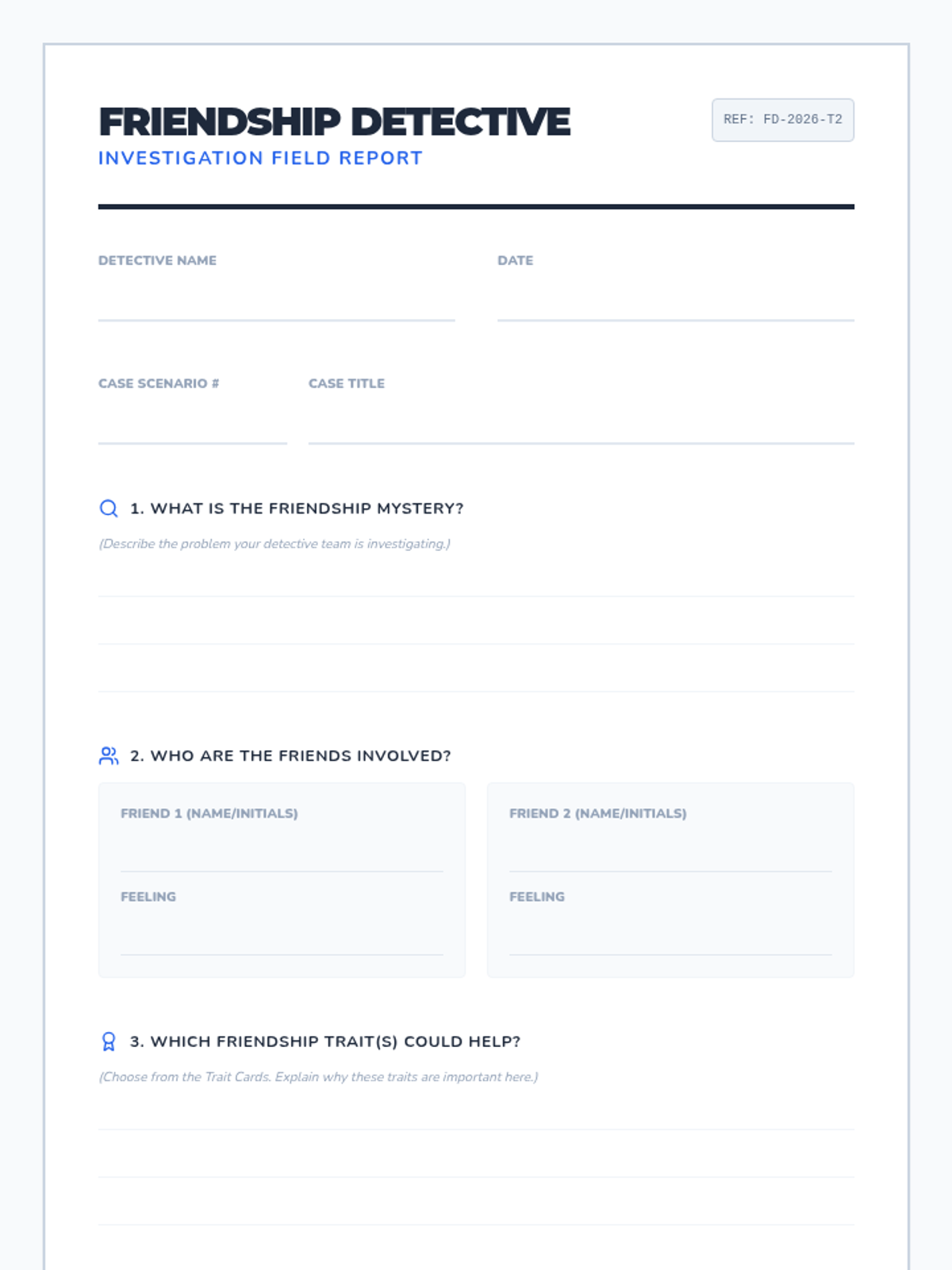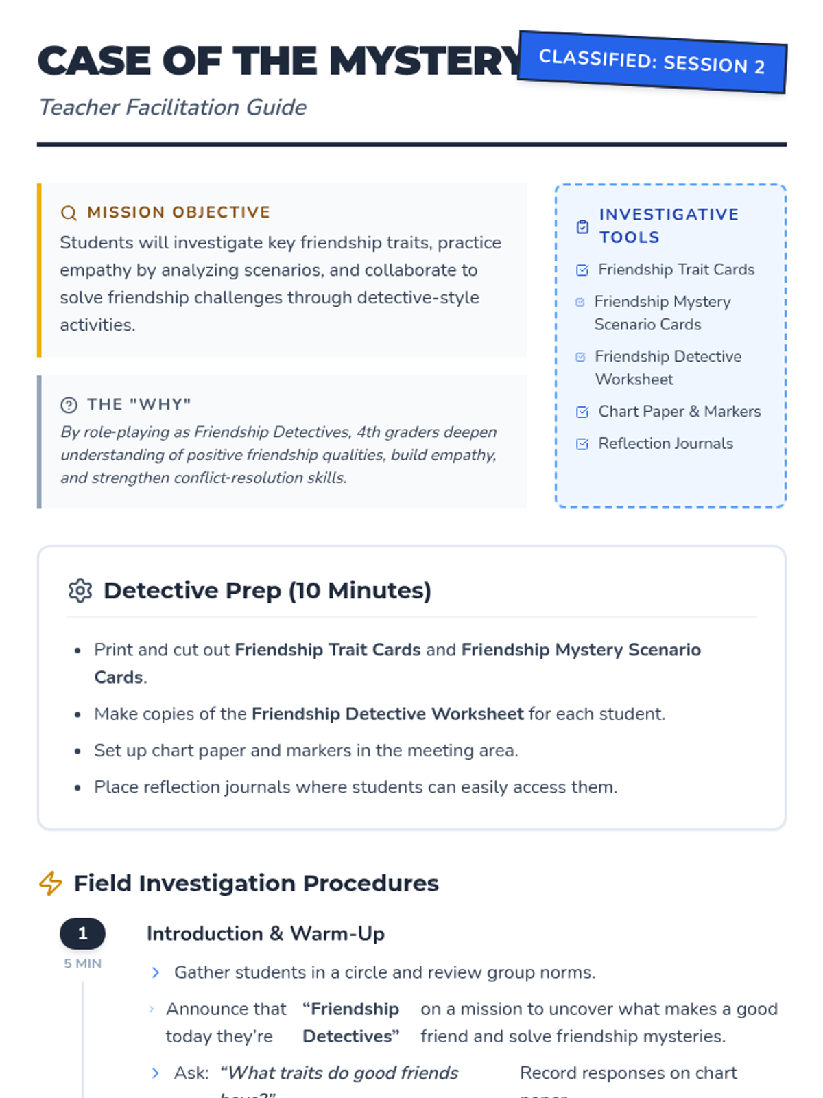 A 2-session Tier 2 social skills sequence for 4th graders focused on identifying friendship traits, practicing empathy, and solving interpersonal conflicts through a fun detective-themed investigation.