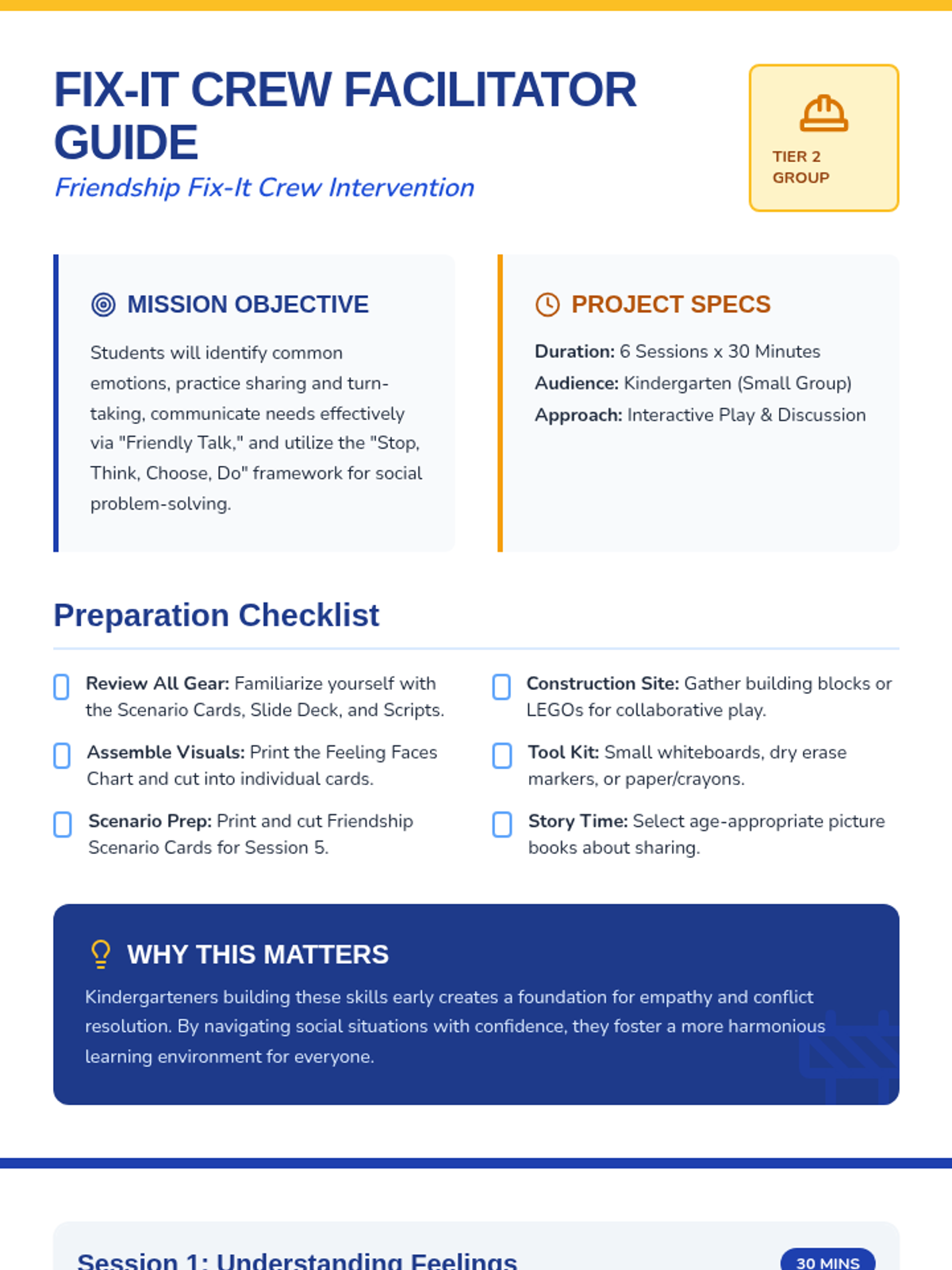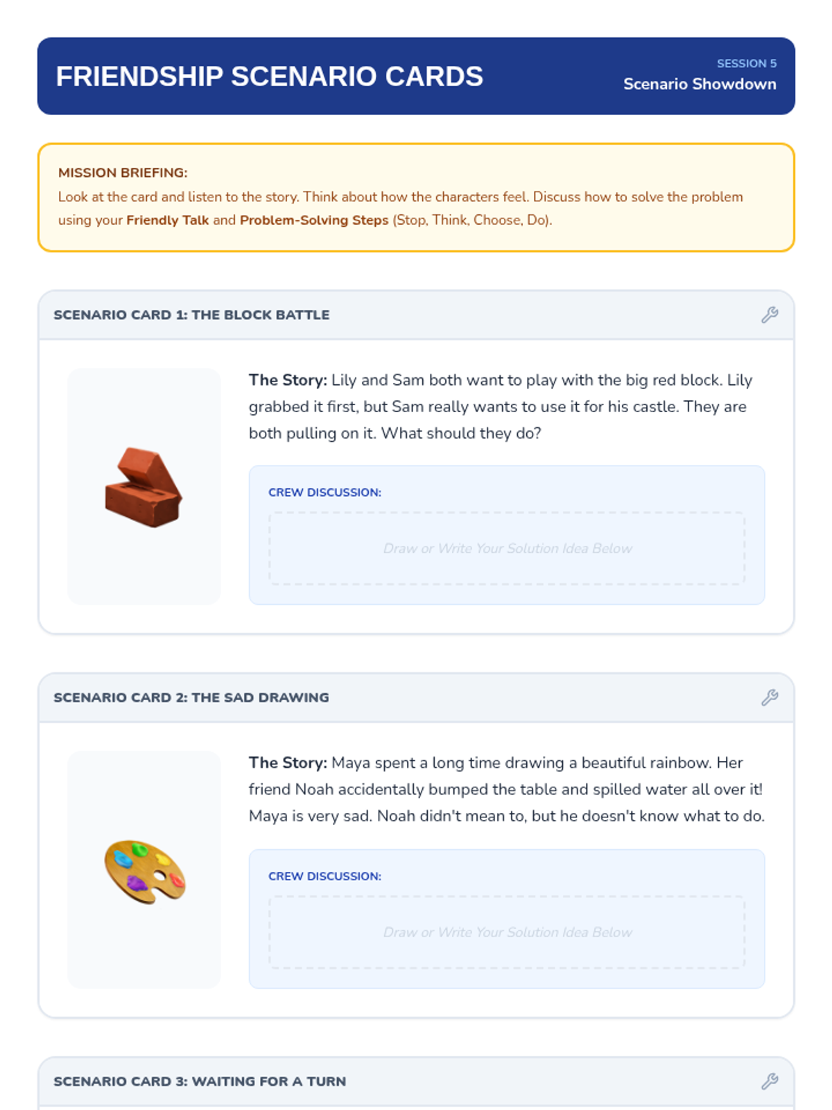 A six-session social-skills intervention for Kindergarten students focusing on identifying emotions, sharing, communication, and collaborative problem-solving.