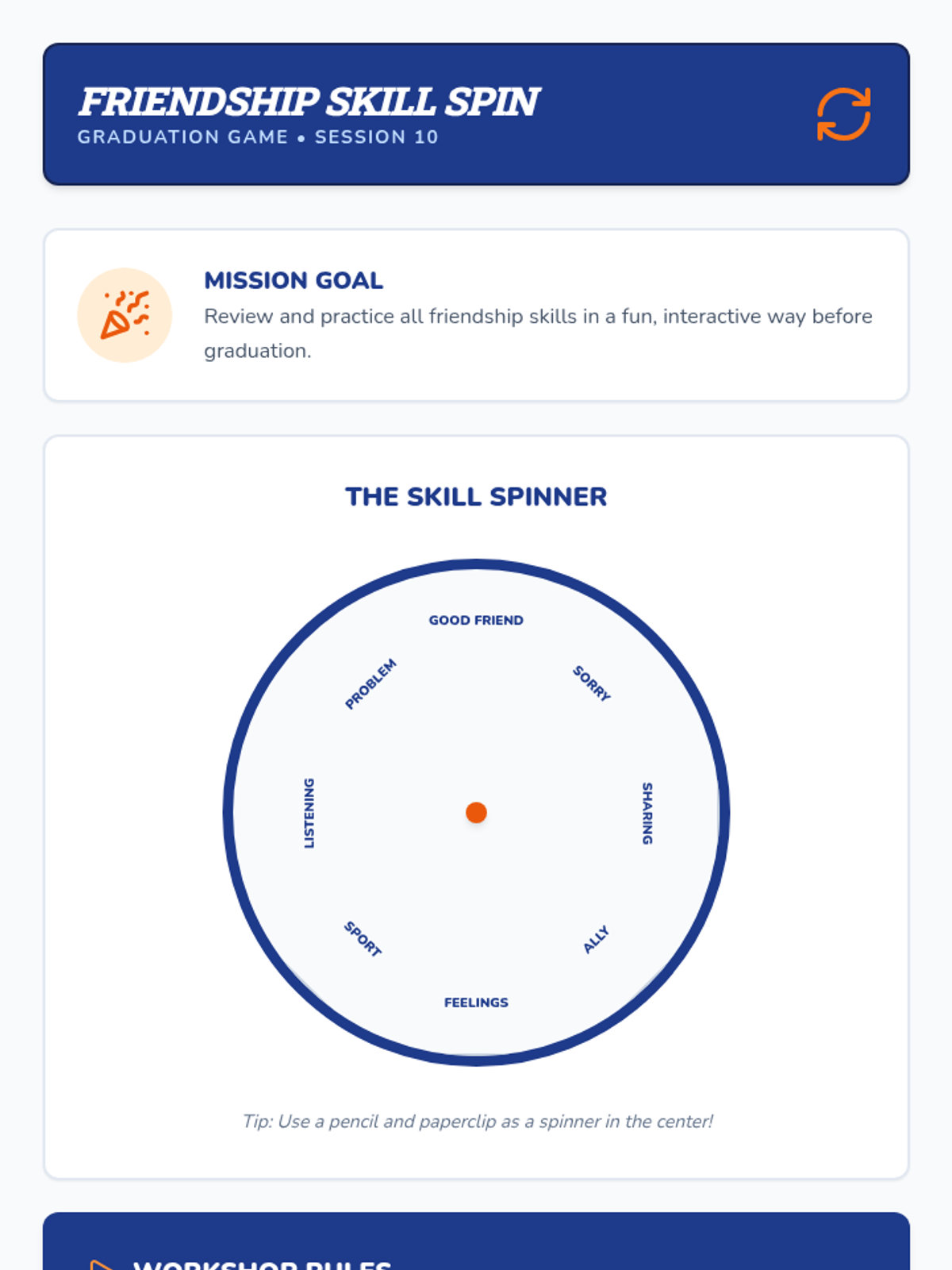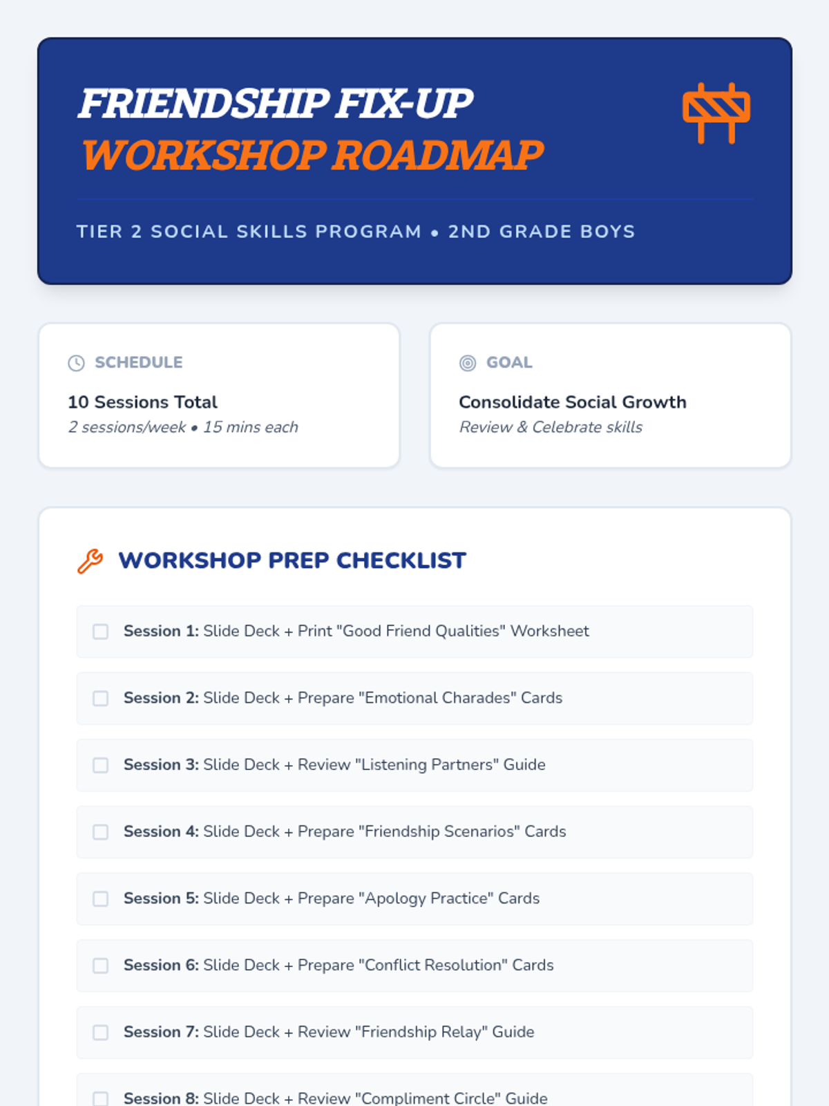 A 5-week social skills group for 2nd-grade boys focused on developing positive peer relationships, understanding emotions, and practicing conflict resolution skills through a workshop-themed approach.