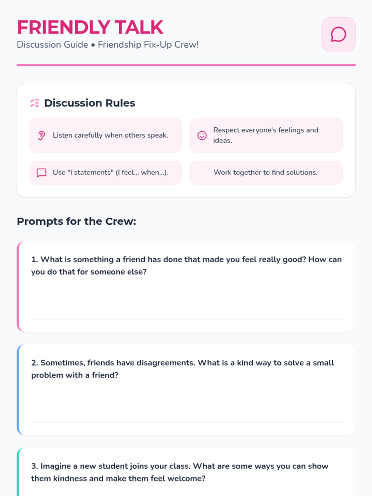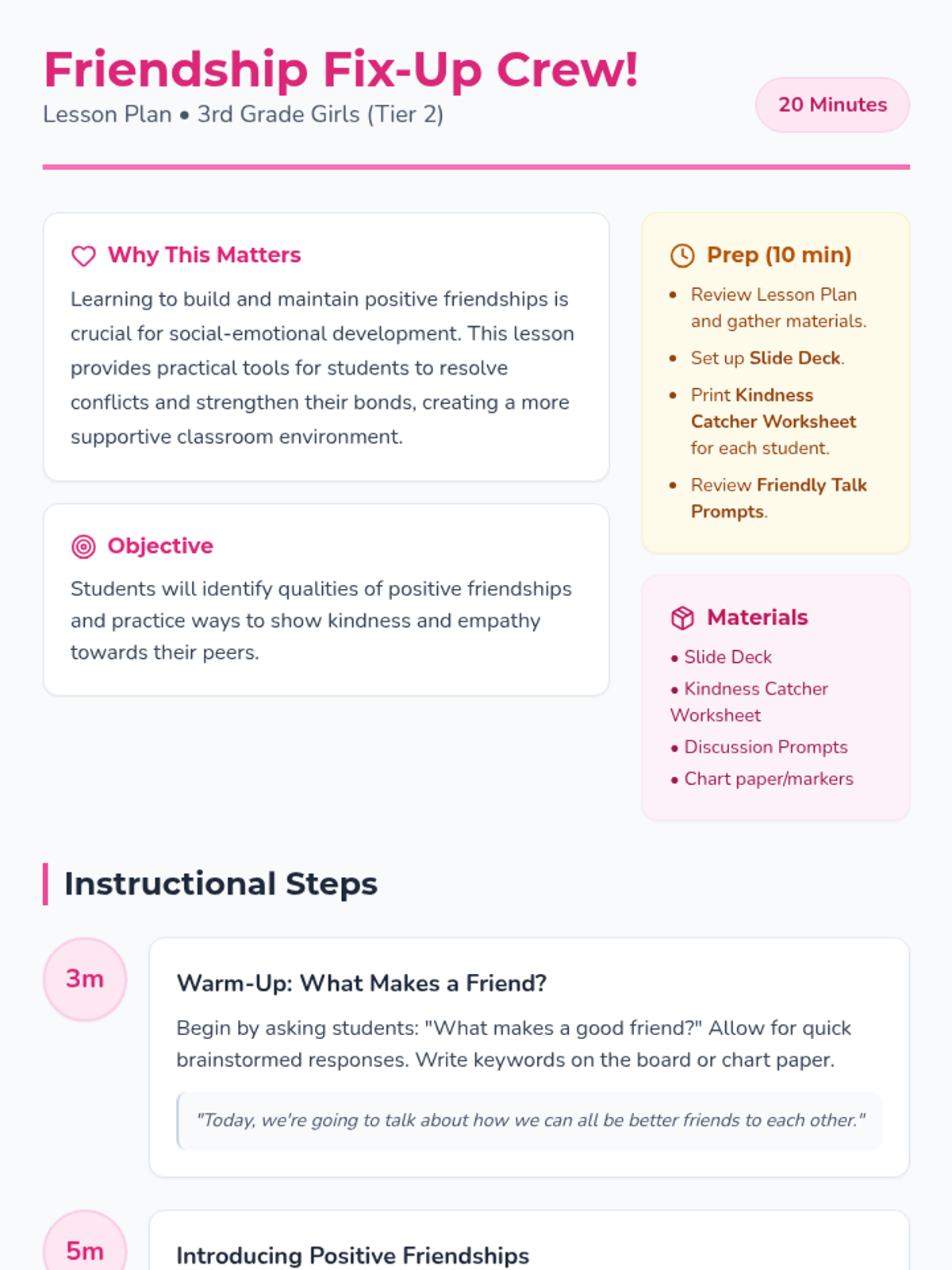 A social-emotional learning sequence for 3rd-grade girls focused on building positive friendships, practicing kindness, and resolving conflicts through 'I statements'. Students will learn to identify friend qualities, practice empathy, and communicate their feelings constructively.