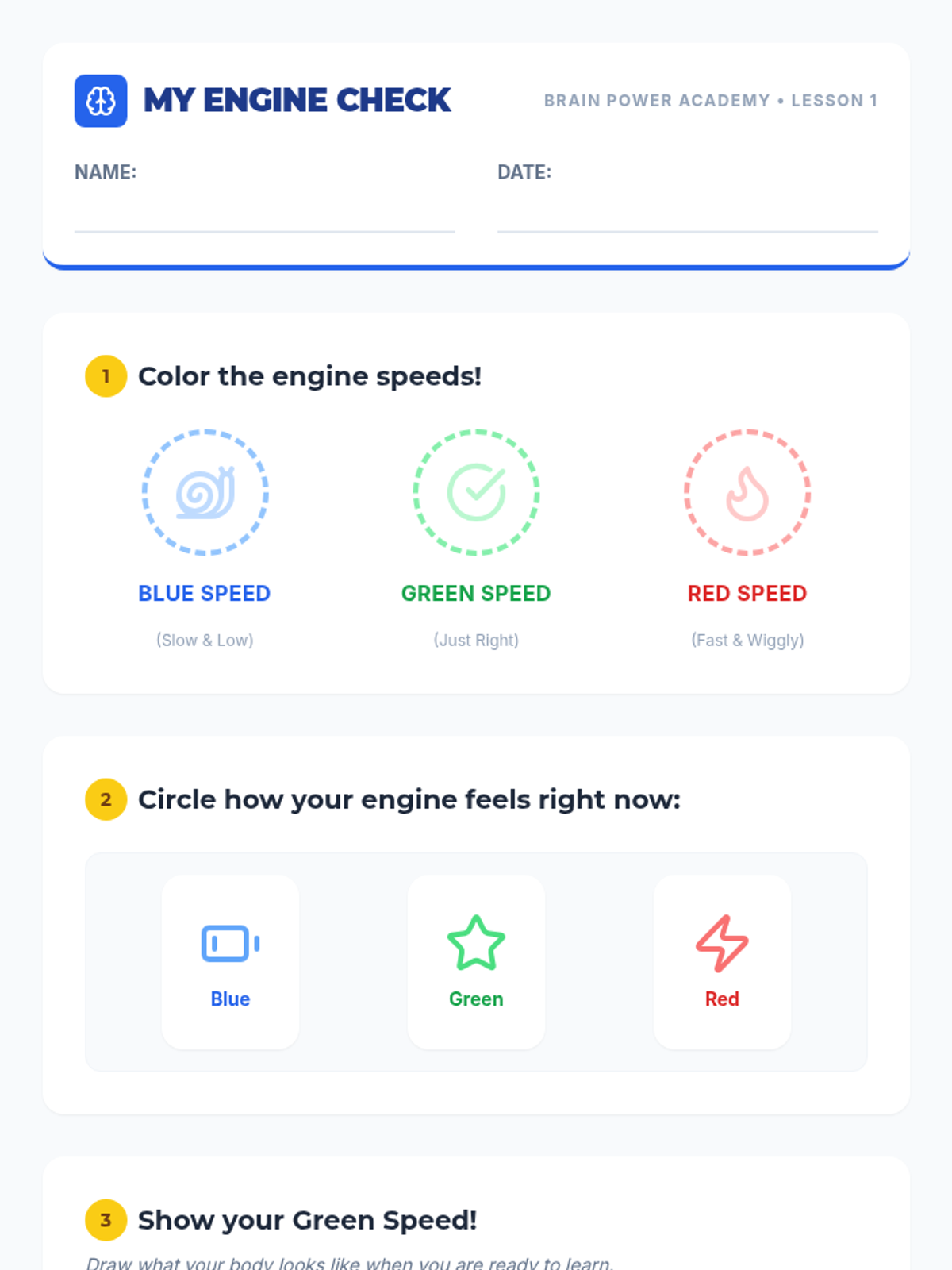 A 6-week social-emotional learning program for 1st graders focused on developing self-regulation skills and cognitive flexibility through the 'Brain Power Academy' theme. Students learn to identify their internal 'engine speed,' build a toolkit of coping strategies, and transition from 'stuck' to 'stretchy' thinking.
