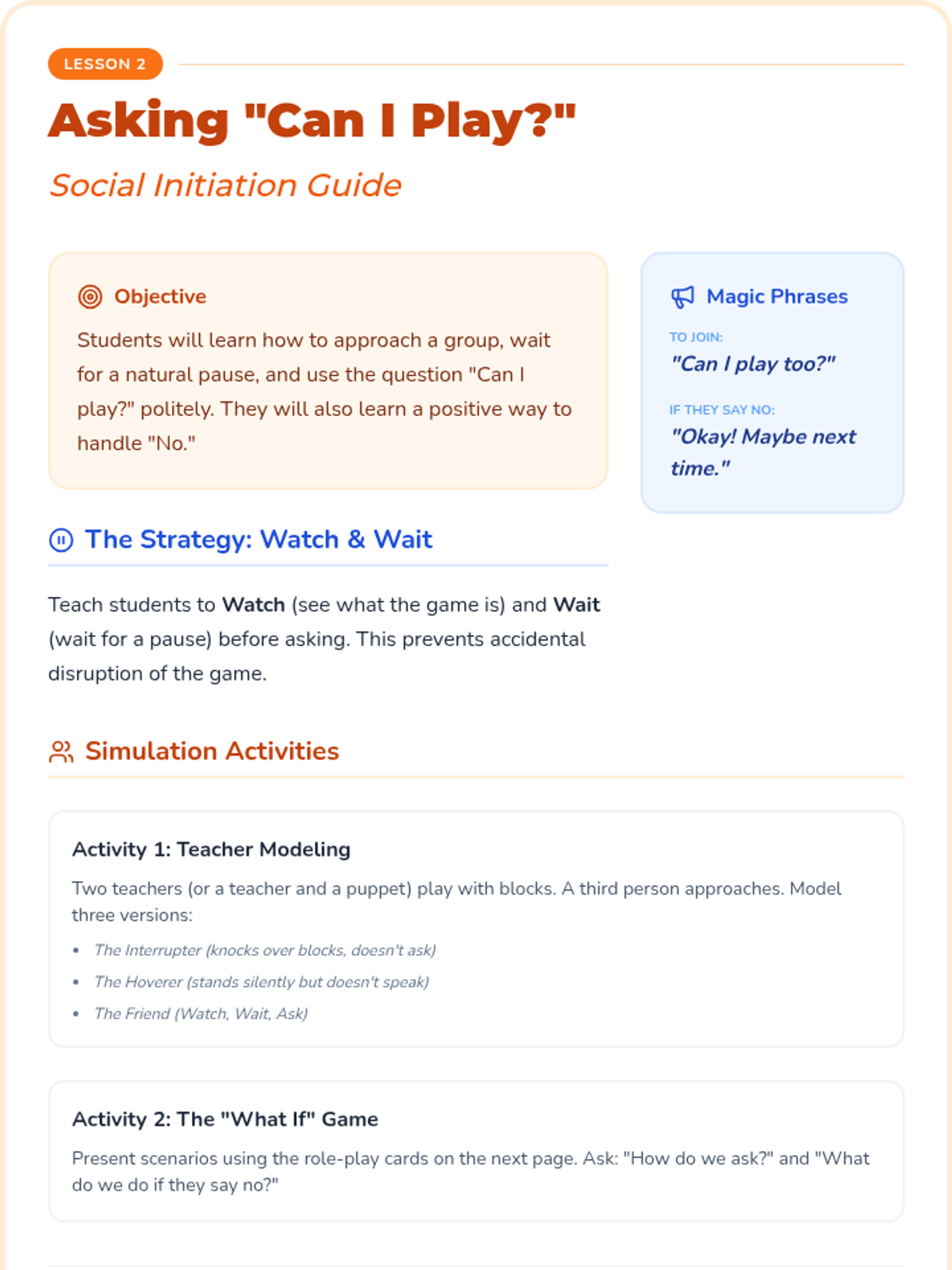 A Pre-K sequence focused on social-emotional learning, specifically greeting peers, joining play, inviting others, and practicing polite manners in a group setting. Students use role-play, games, and simulation to build confidence and empathy.