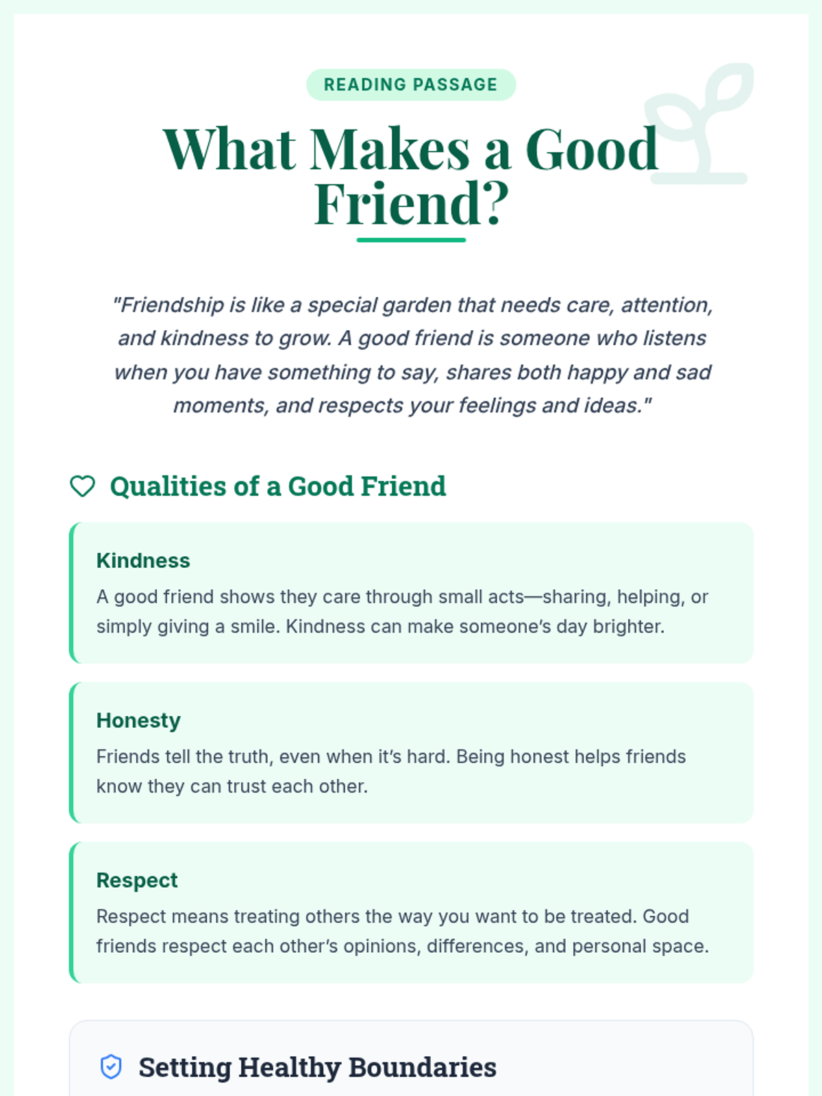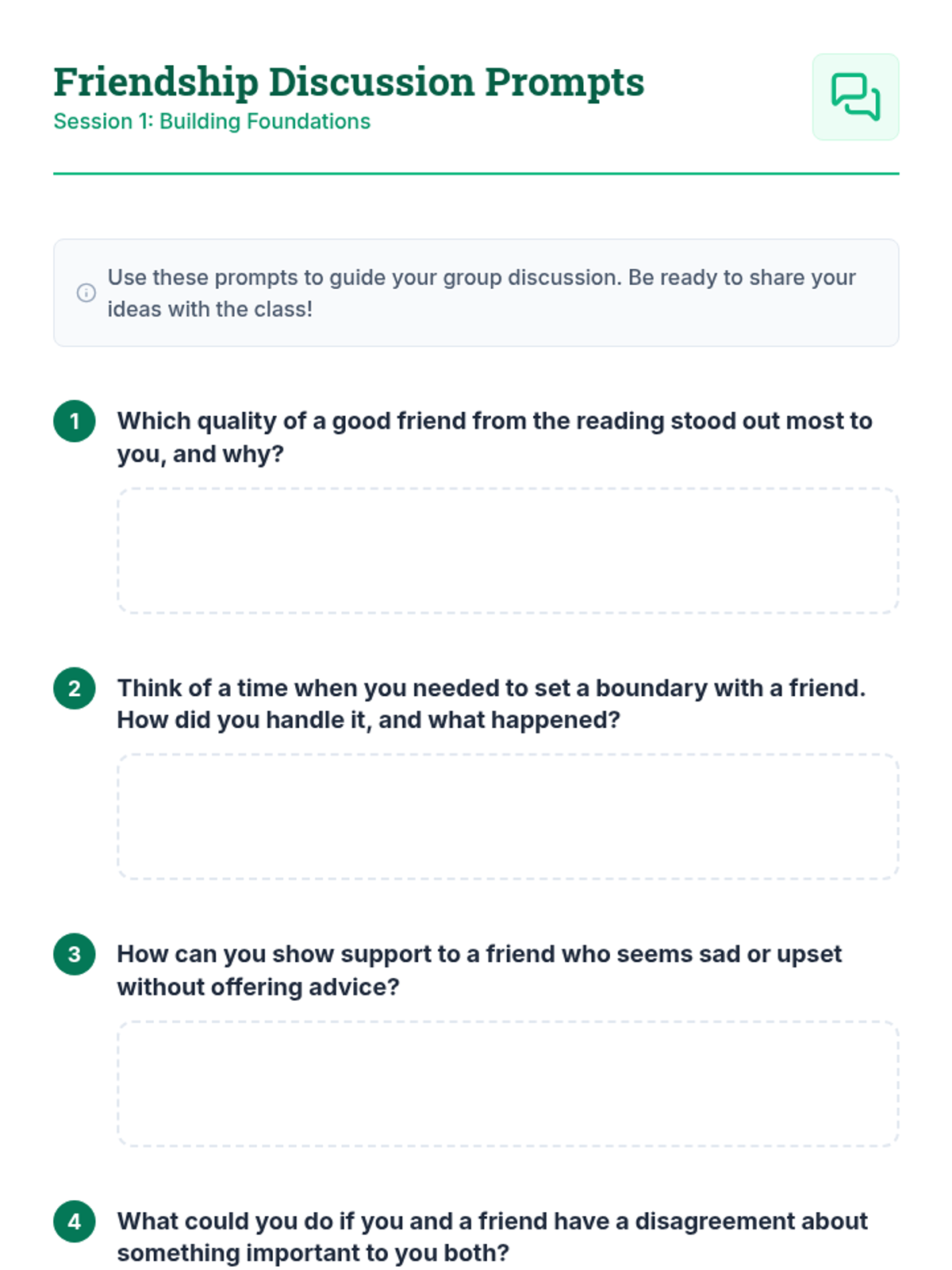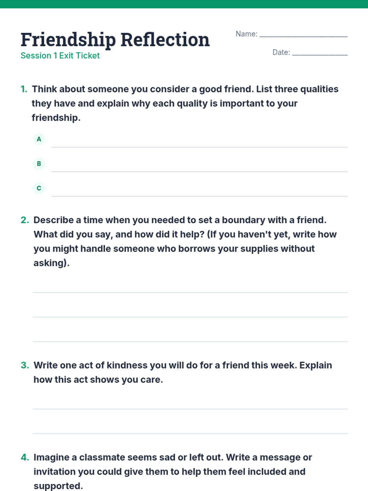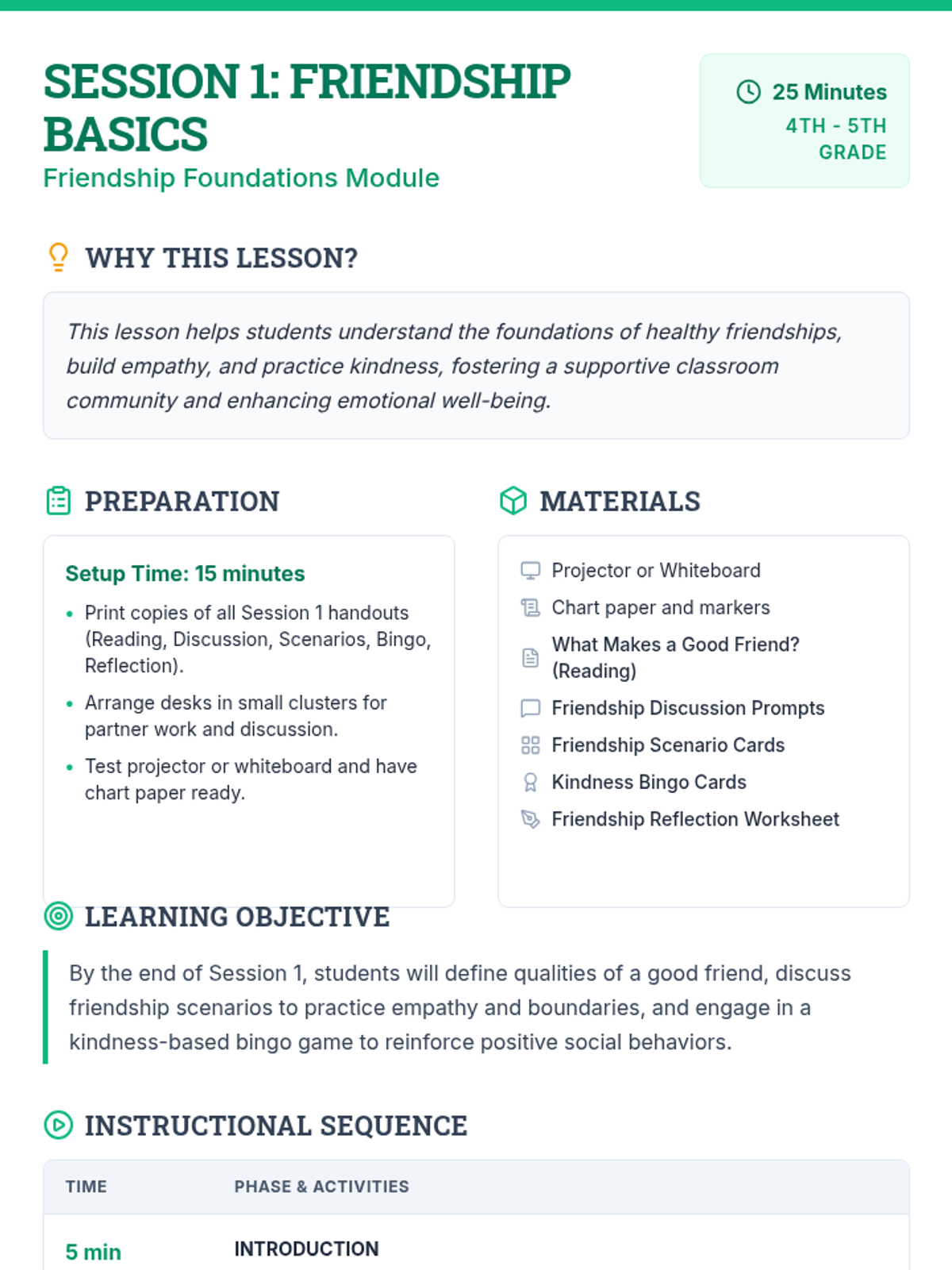 A two-session module for 4th and 5th graders focused on building healthy friendships, setting boundaries, and resolving conflicts through empathy and kindness.