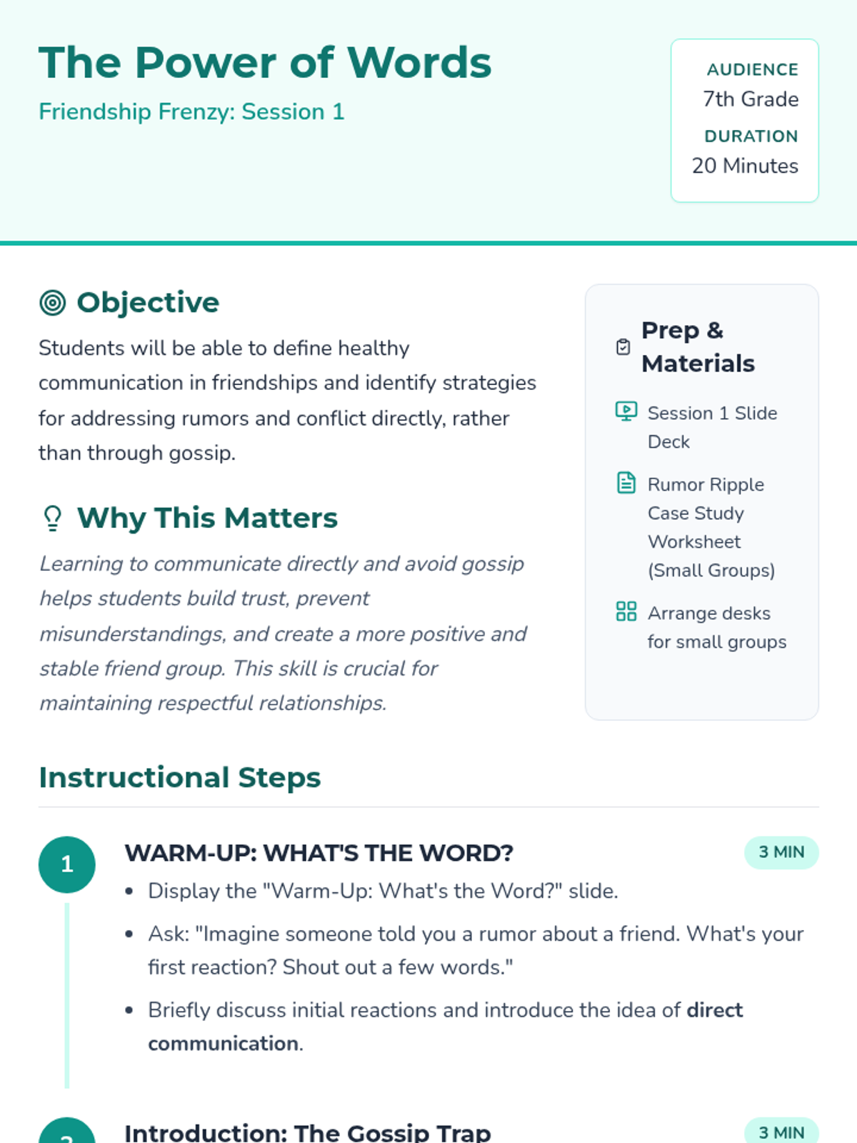 A four-session workshop for 7th-grade students focused on building healthy friendships, preventing drama, and navigating social challenges like rumors and boundaries.
