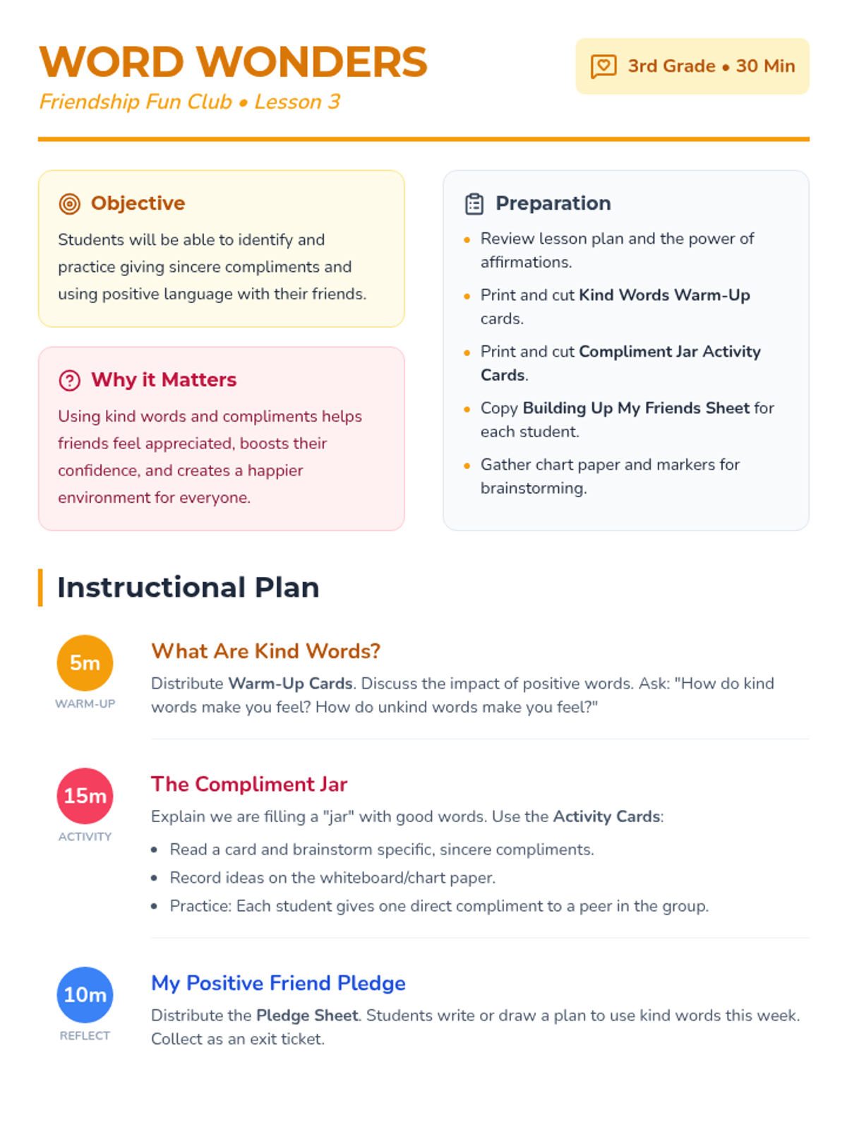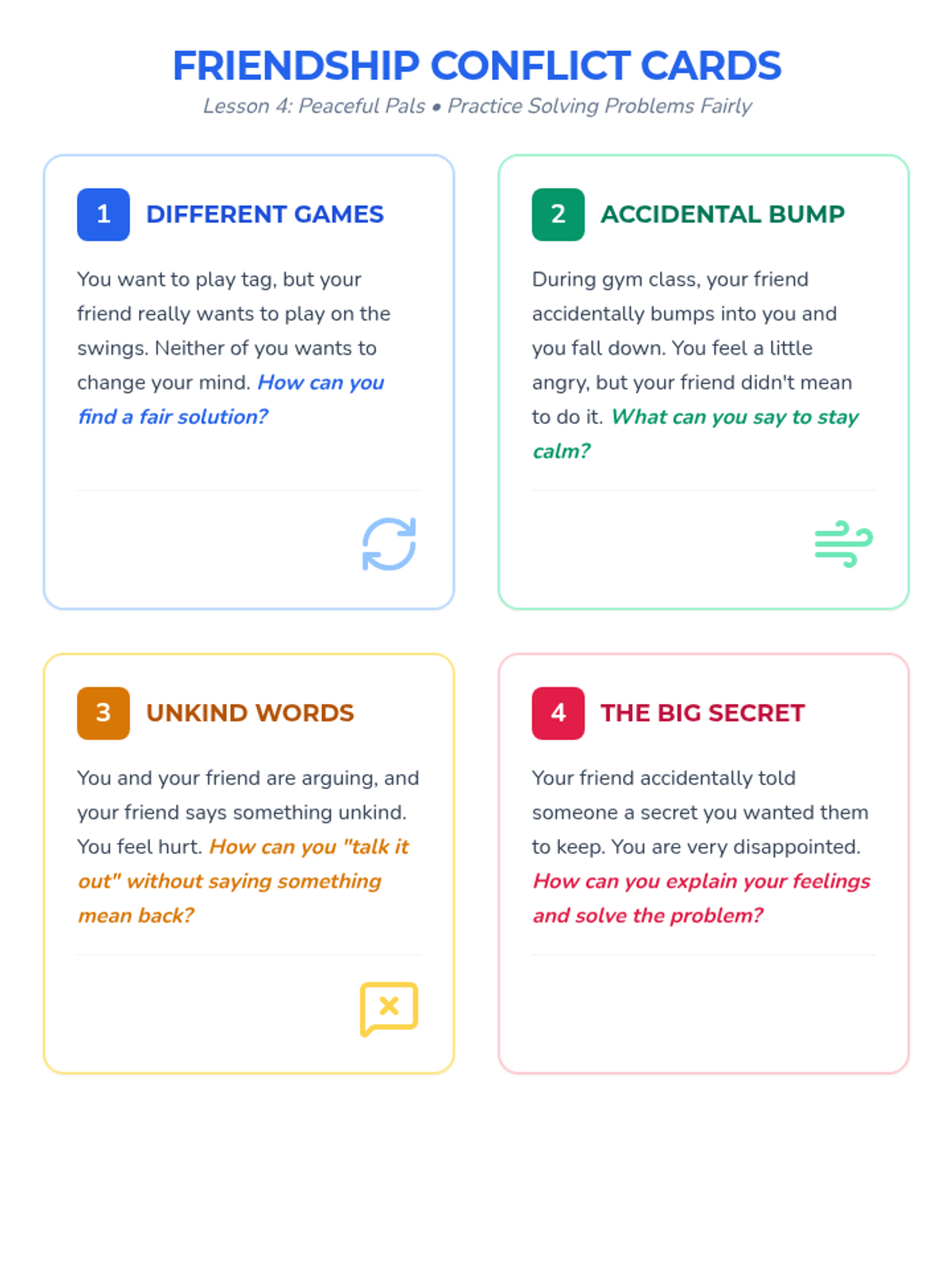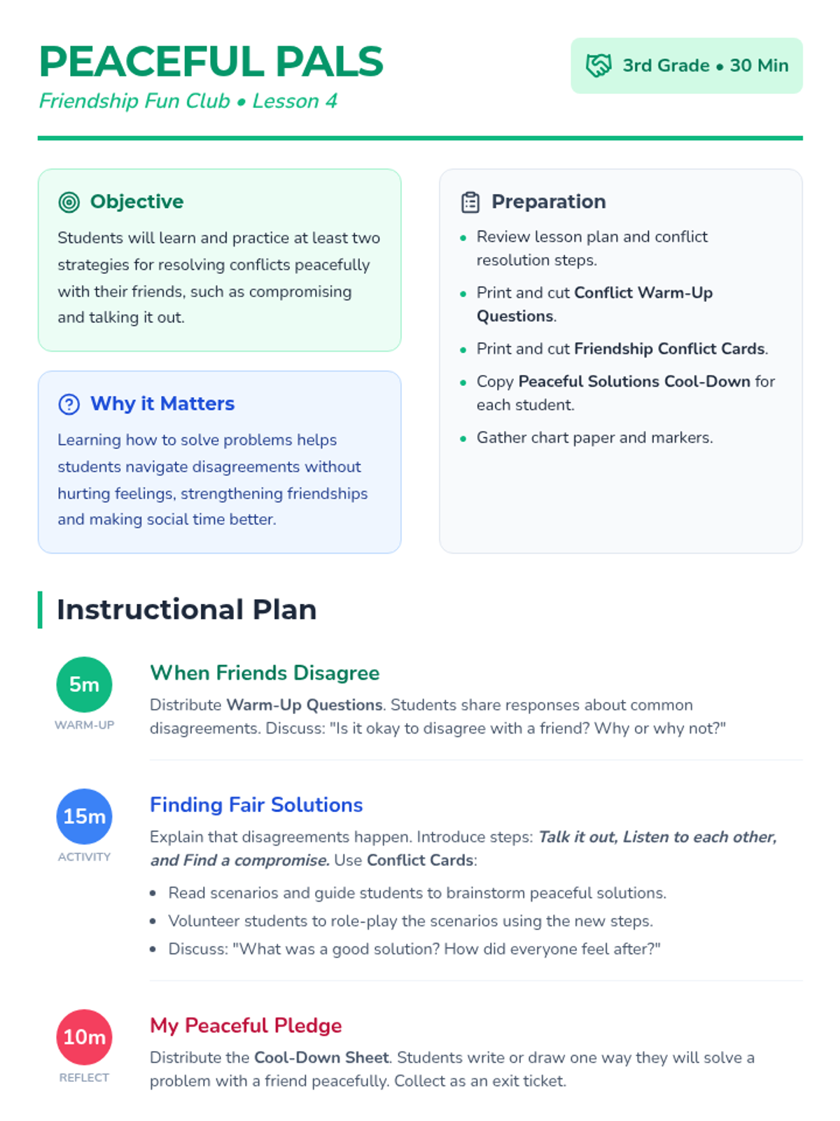 A four-part social-emotional learning sequence for 3rd graders designed to build essential friendship skills including communication, empathy, positive affirmation, and conflict resolution. Students participate in small-group discussions, role-plays, and reflective activities to foster a supportive classroom environment.