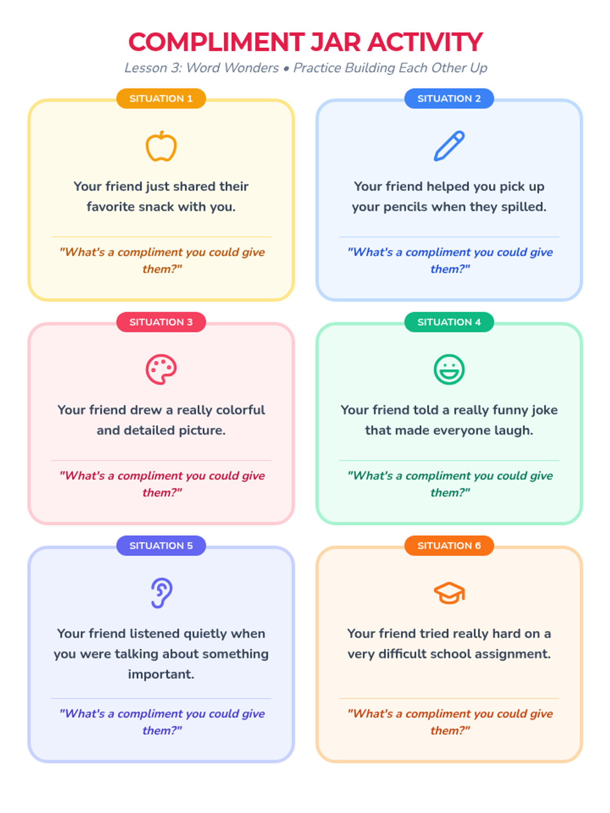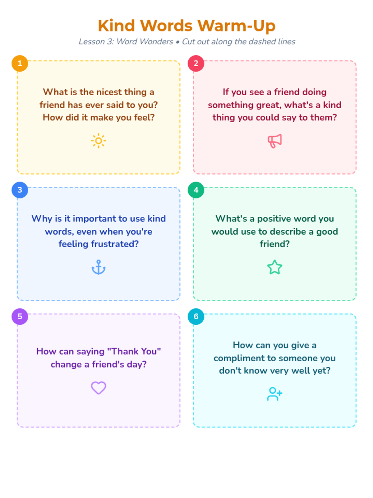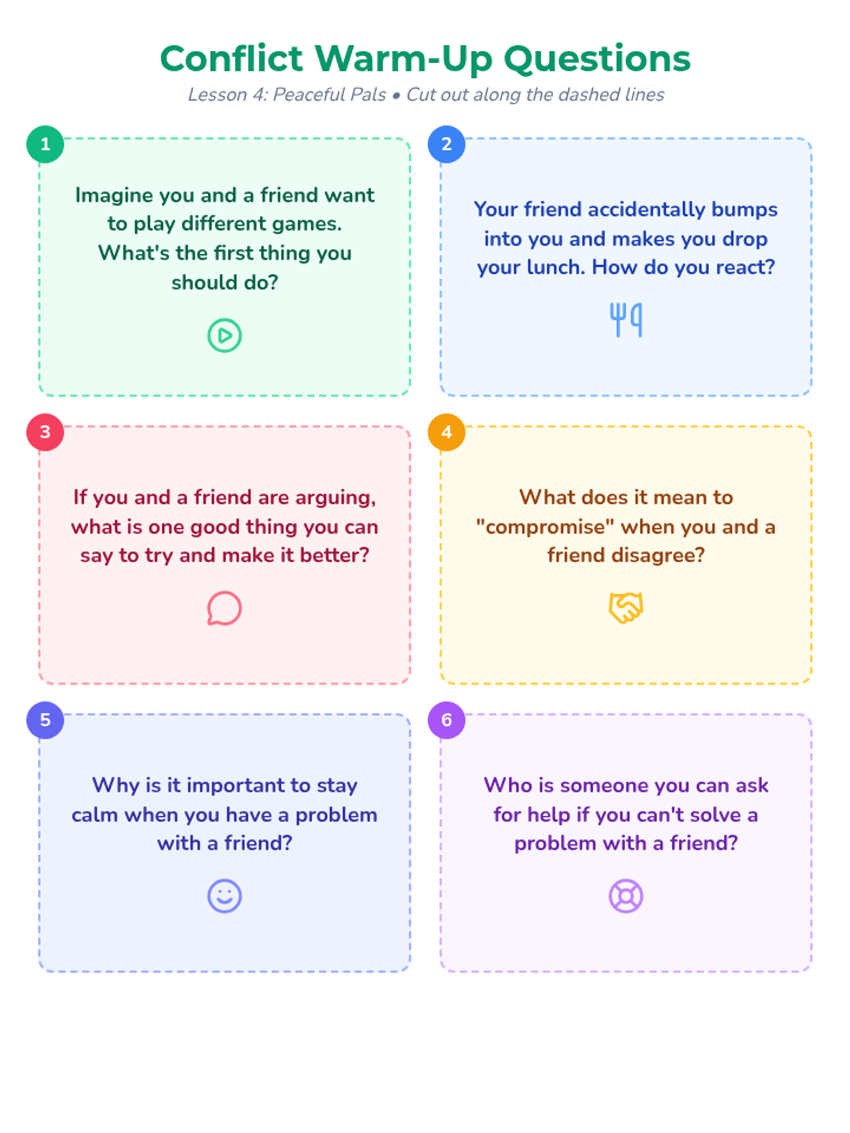 A four-part social-emotional learning sequence for 3rd graders designed to build essential friendship skills including communication, empathy, positive affirmation, and conflict resolution. Students participate in small-group discussions, role-plays, and reflective activities to foster a supportive classroom environment.
