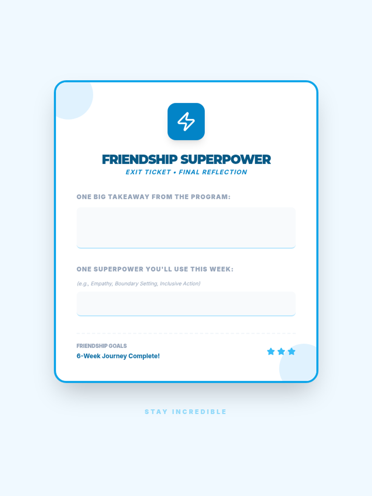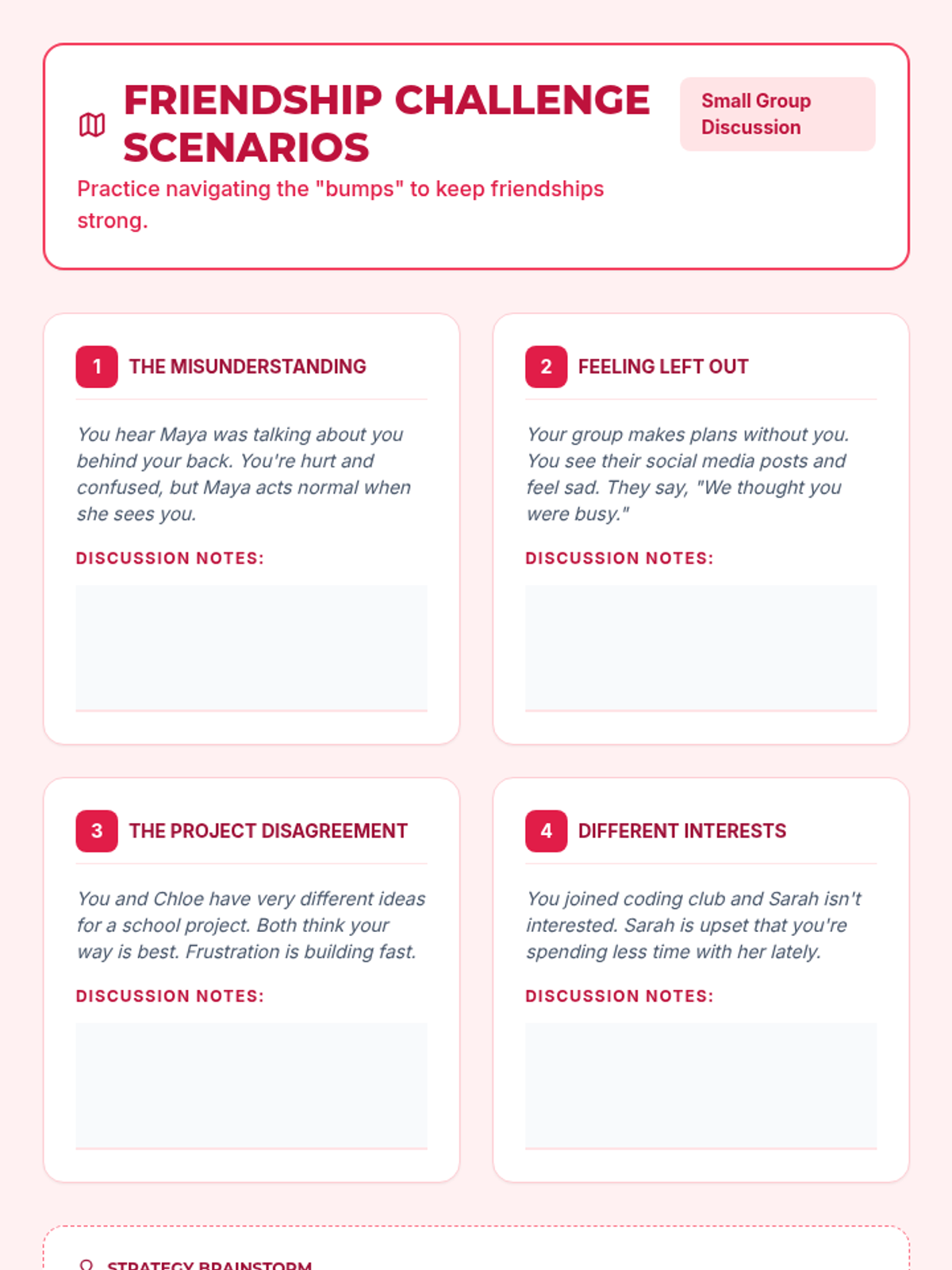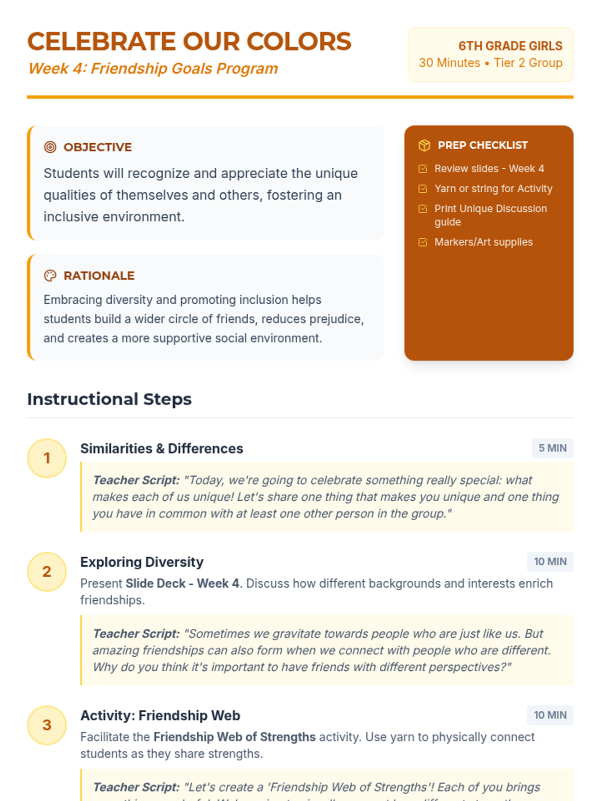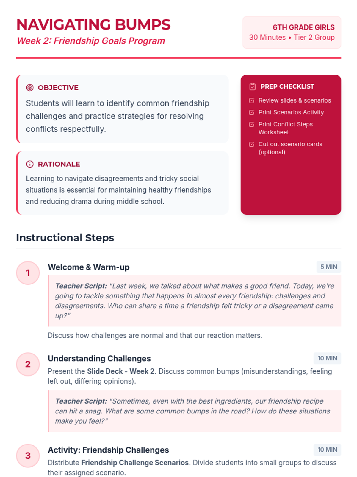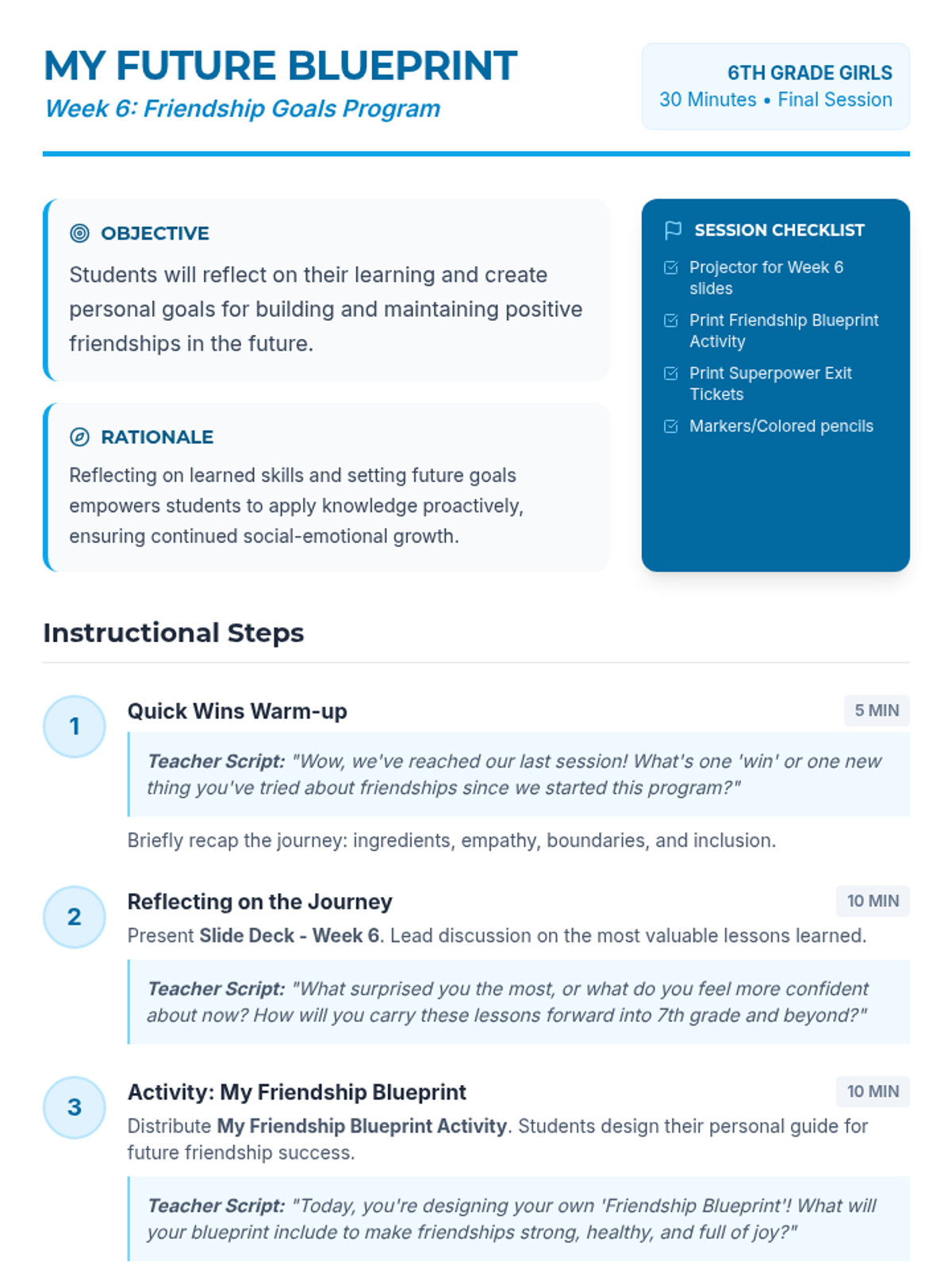 A 6-week social-emotional learning program for 6th-grade girls focused on building healthy friendships, resolving conflicts, practicing empathy, and setting boundaries.