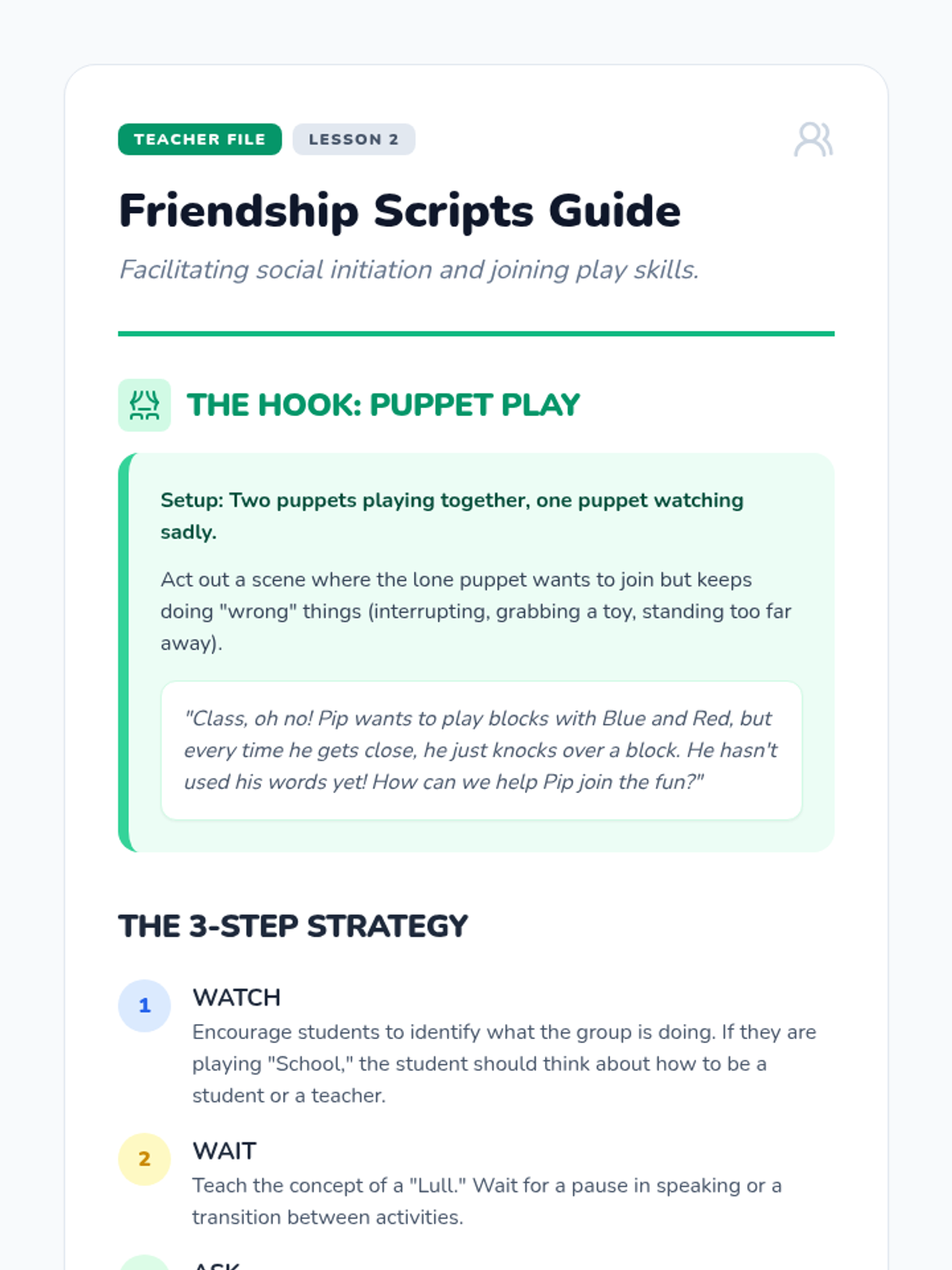 A comprehensive 6-lesson unit for preschool students focused on a 5-step social problem-solving process. Using the 'Solution Squad' theme, students learn to identify problems, express feelings, brainstorm solutions, and reflect on outcomes through interactive scenarios like sharing, personal space, and joining play.