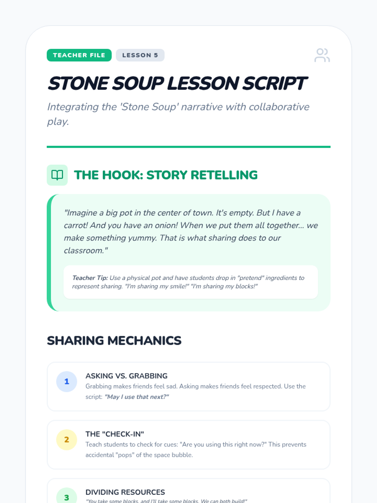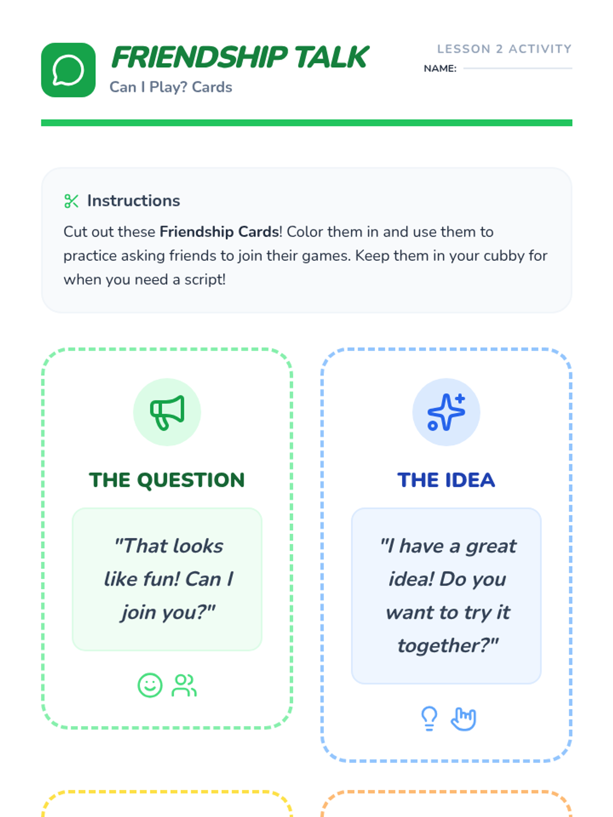 A Kindergarten sequence focused on social-emotional learning through social stories, helping students navigate personal space, joining play, turn-taking, sportsmanship, and sharing.