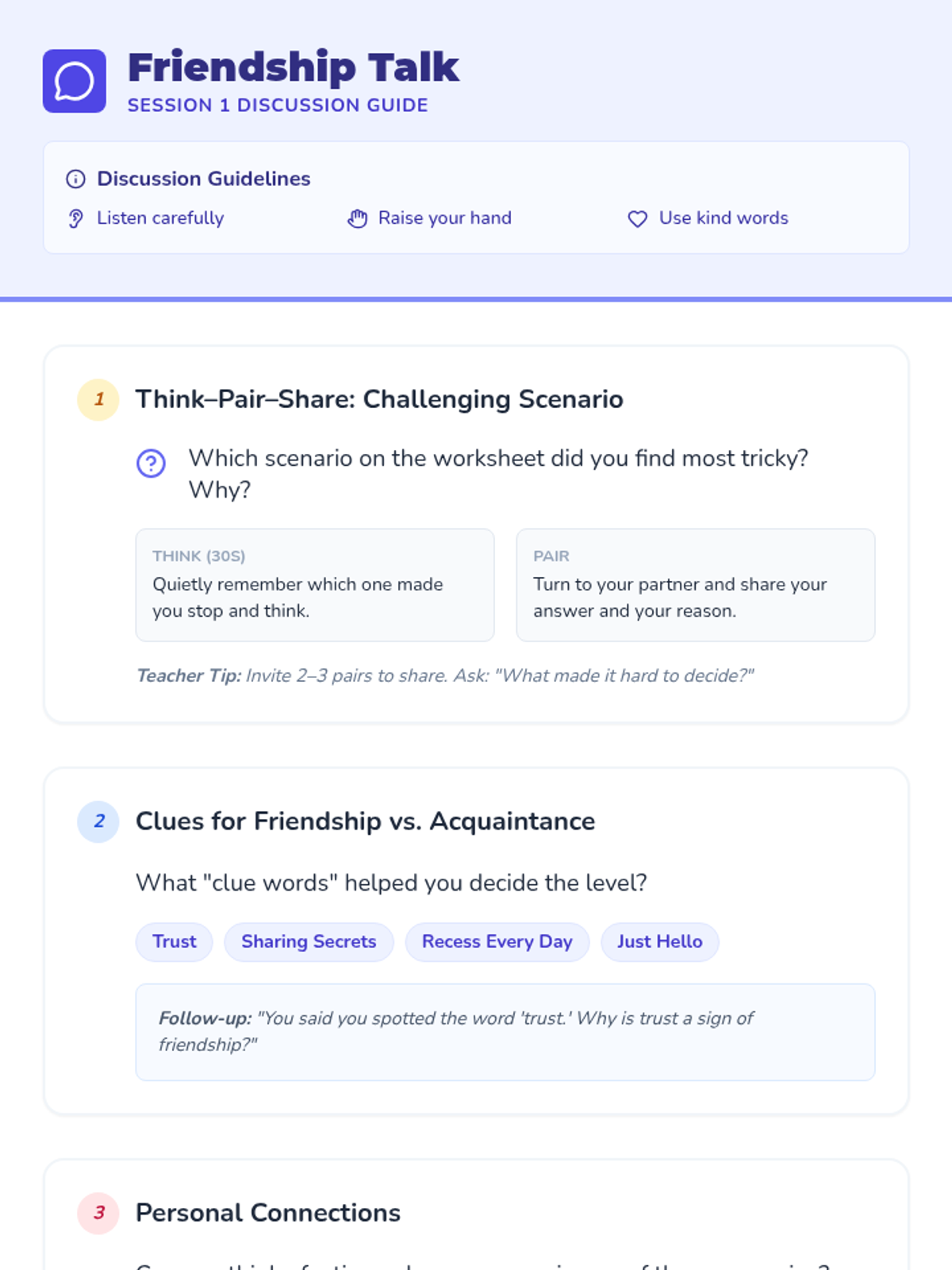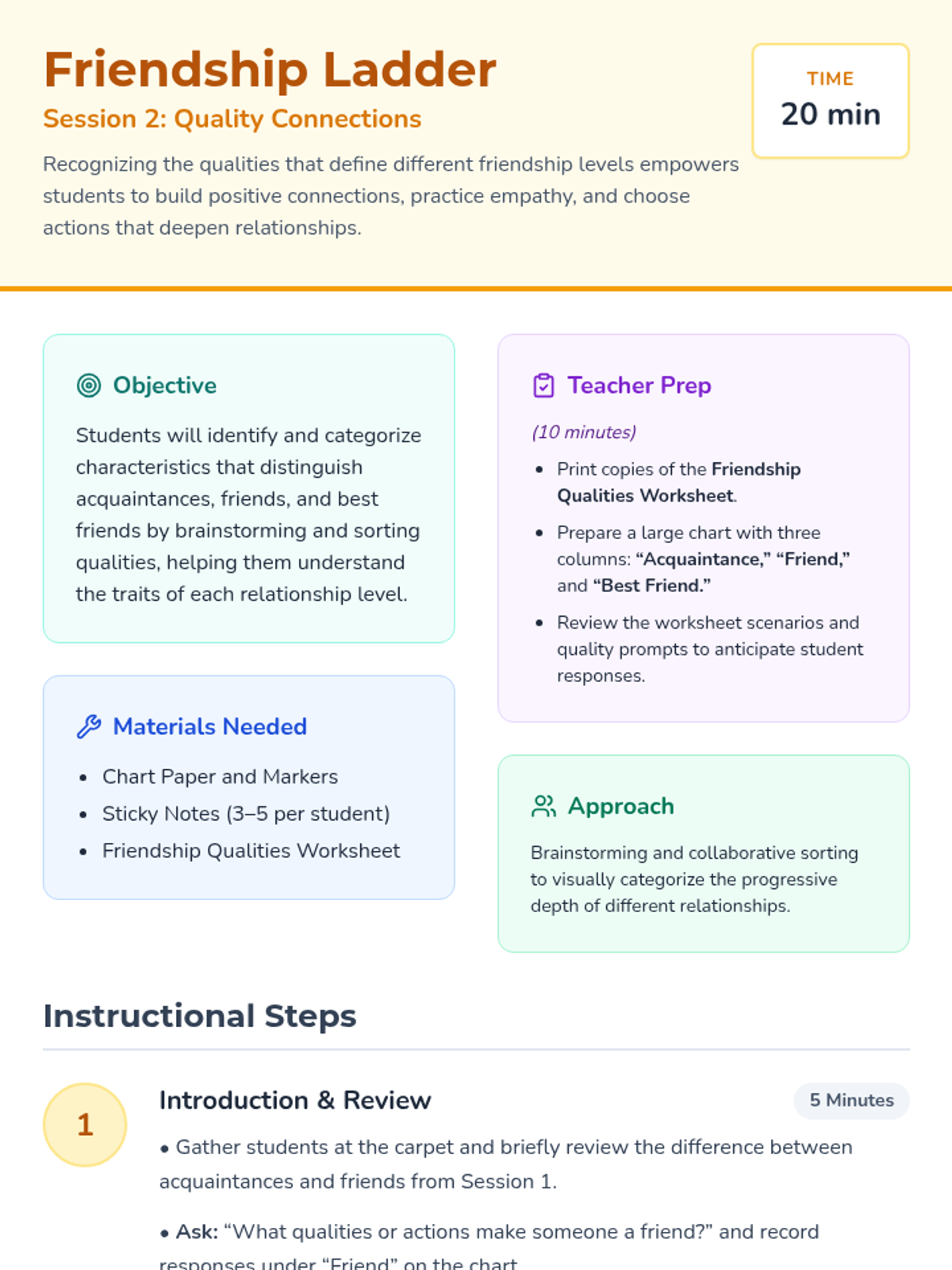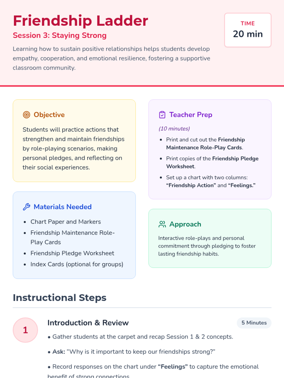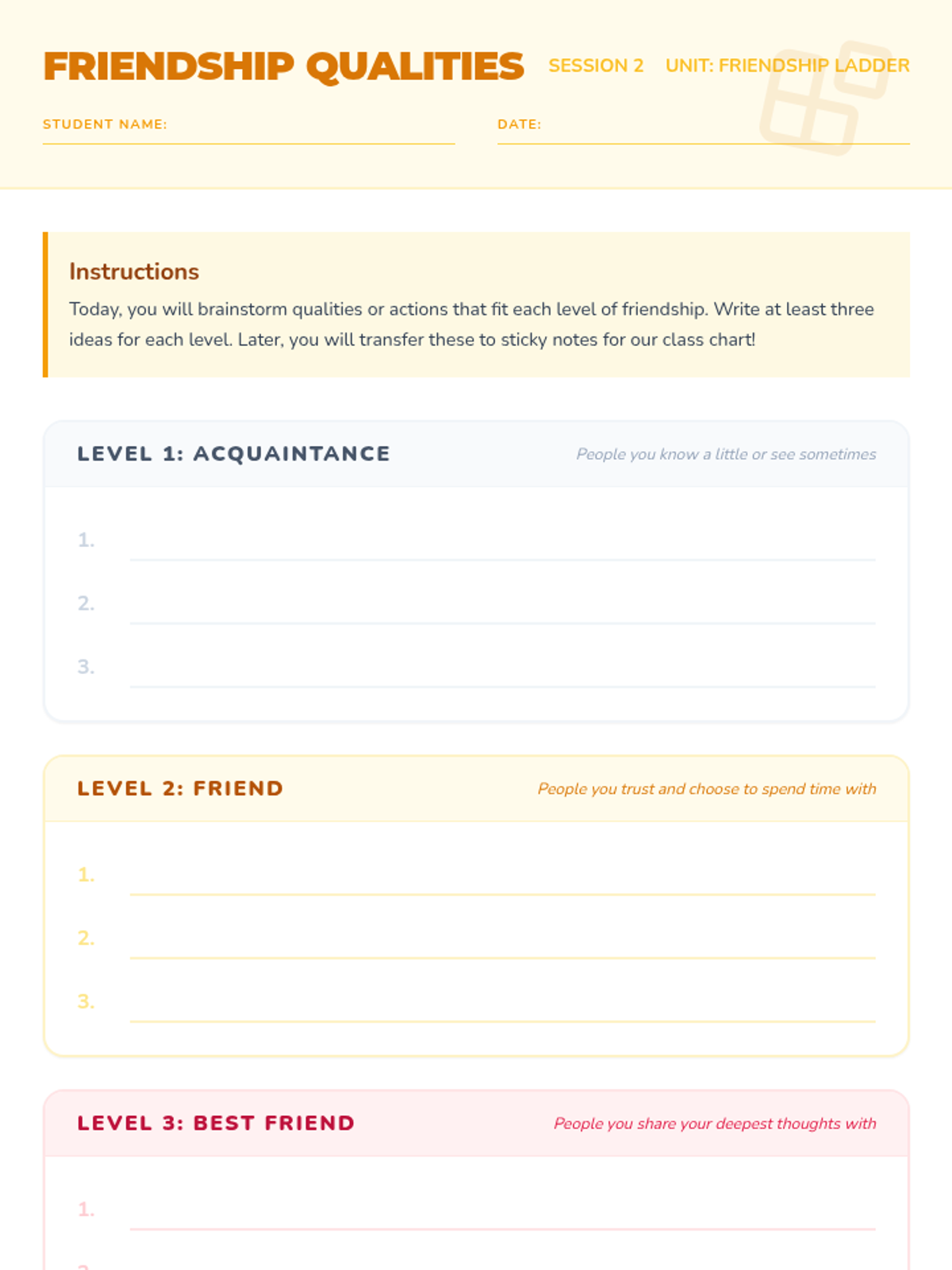 A three-session unit for 3rd graders to explore levels of friendship, recognize qualities of healthy relationships, and practice skills to maintain positive connections.
