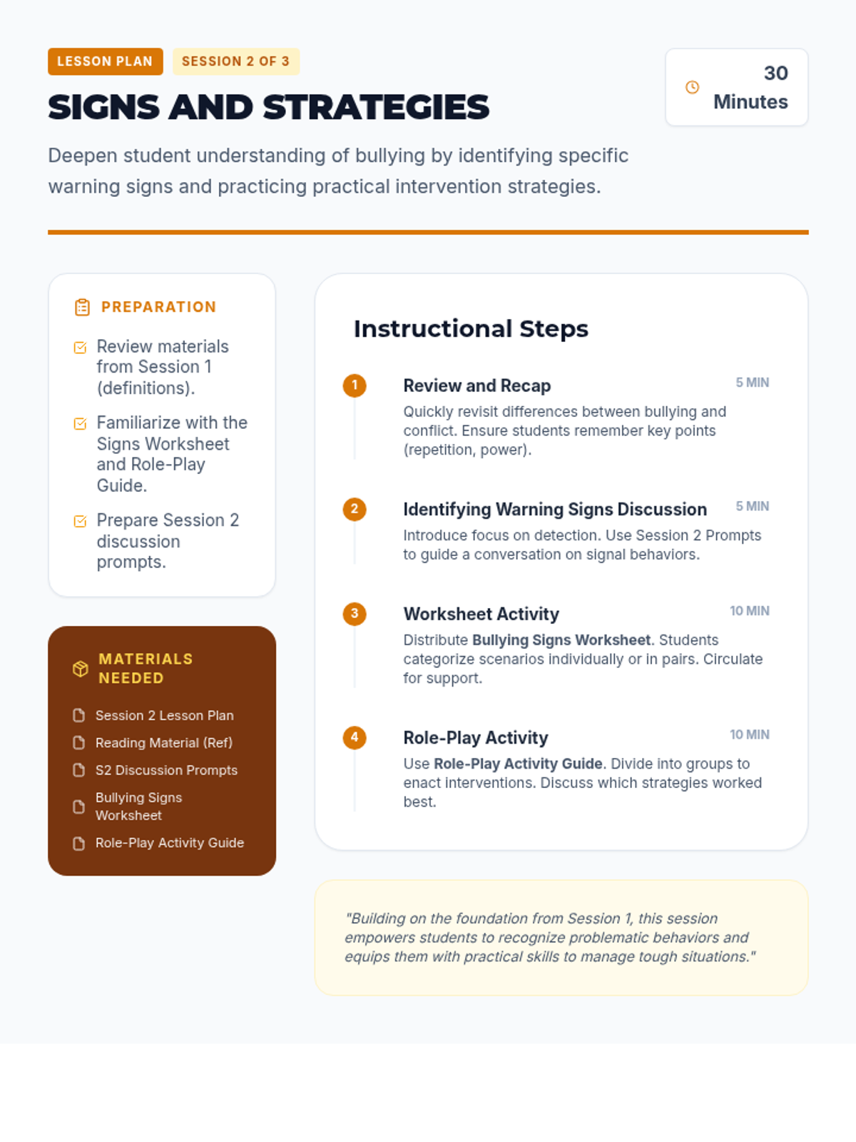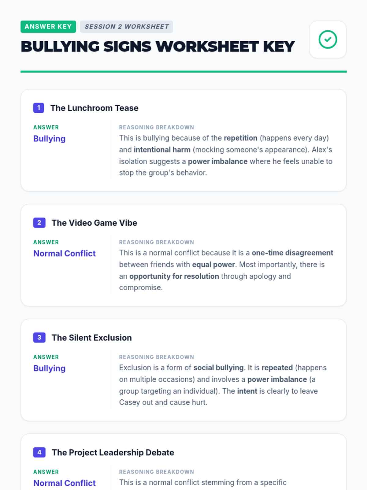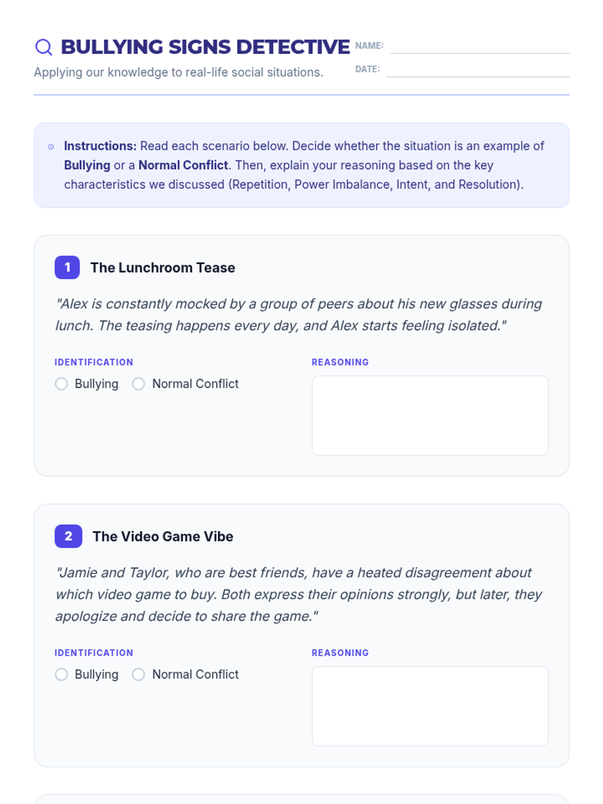 This 3-session sequence helps middle school students differentiate between bullying and normal conflict. It provides students with definitions, real-life scenarios, role-play activities, and reflection tools to foster a safer school environment.