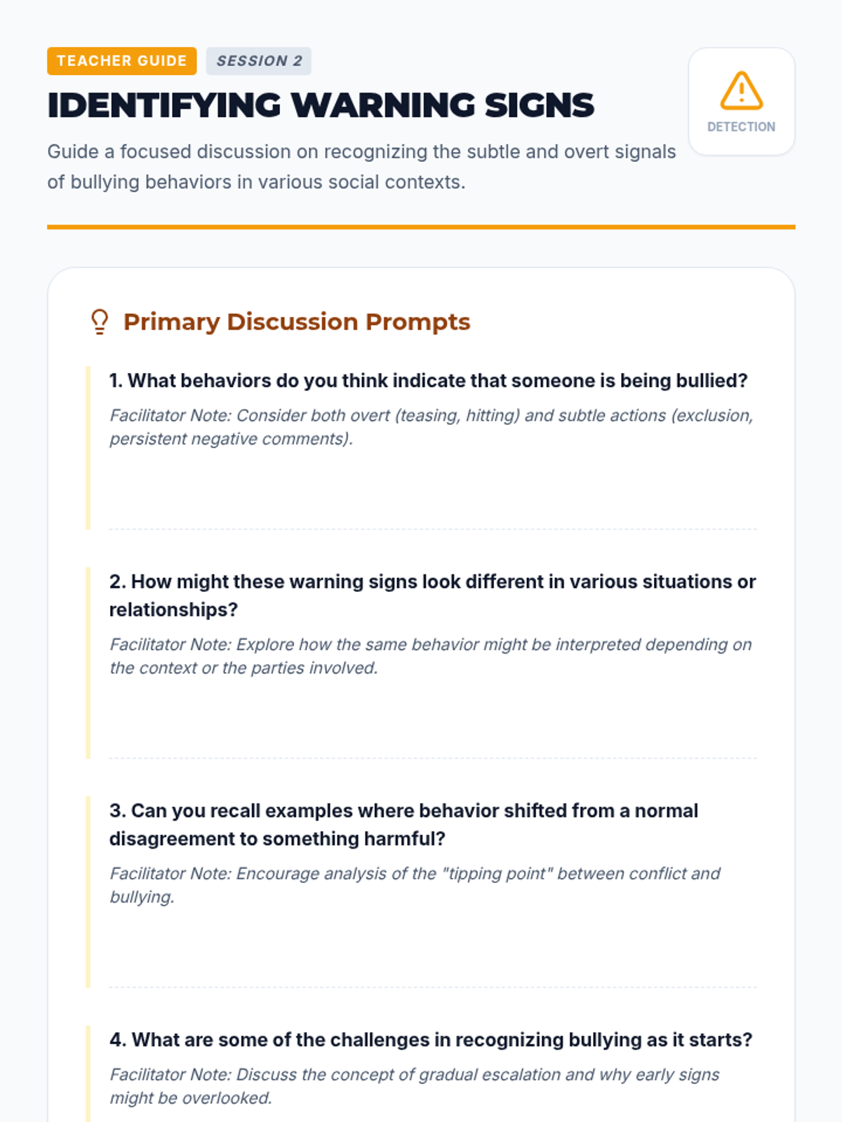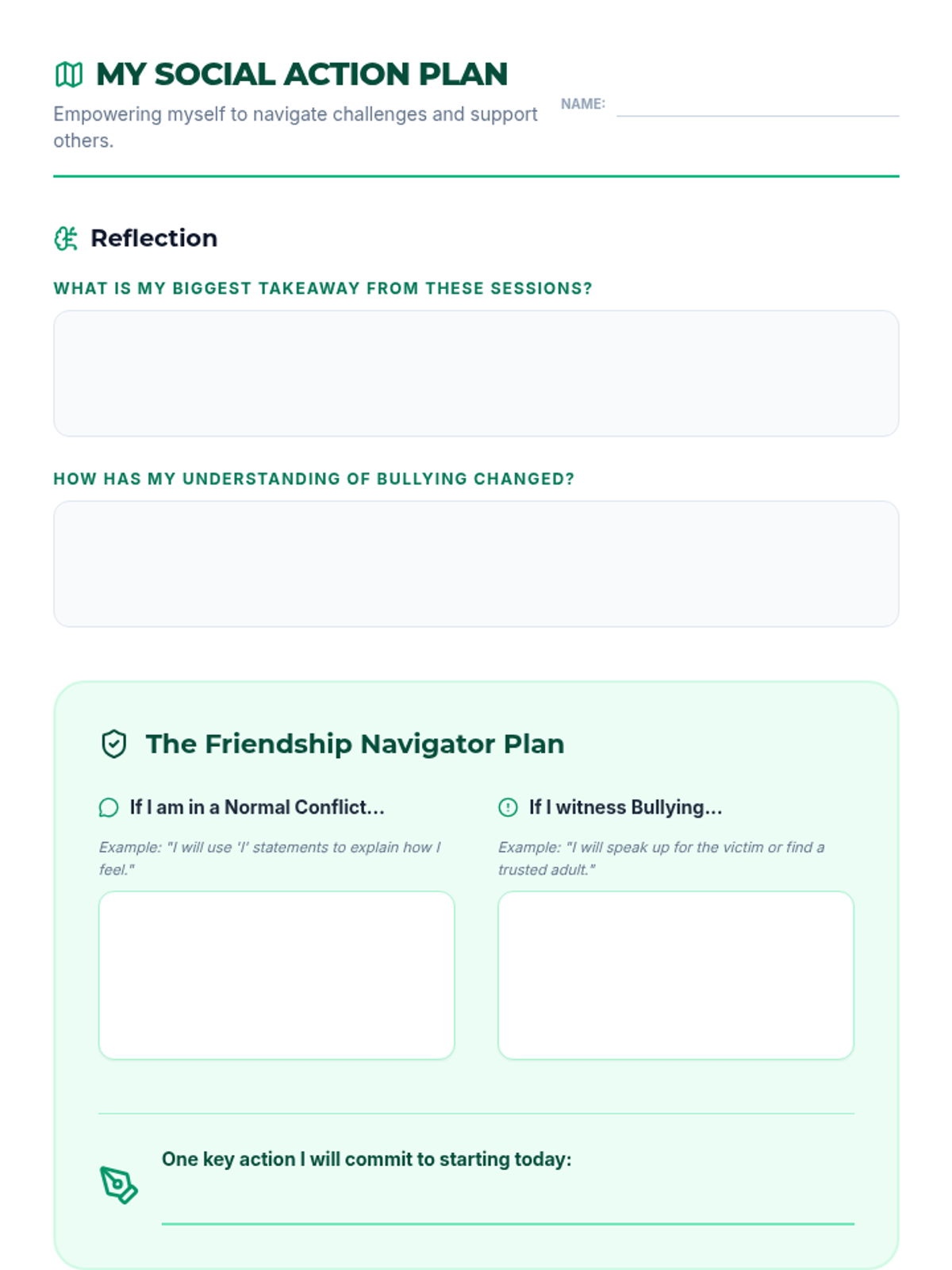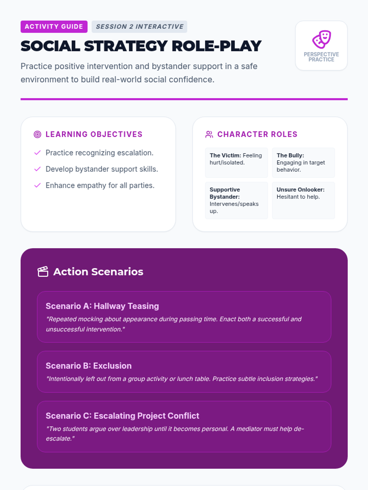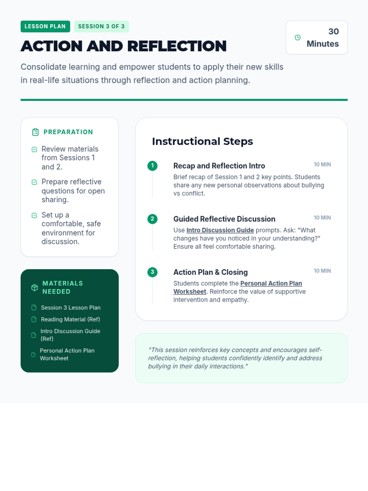 This 3-session sequence helps middle school students differentiate between bullying and normal conflict. It provides students with definitions, real-life scenarios, role-play activities, and reflection tools to foster a safer school environment.